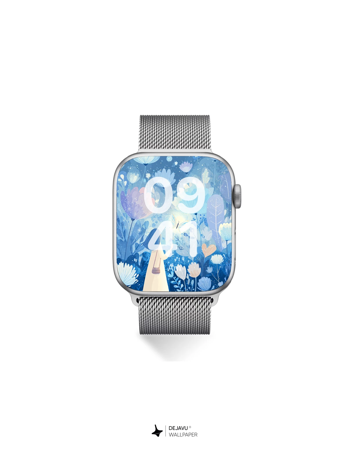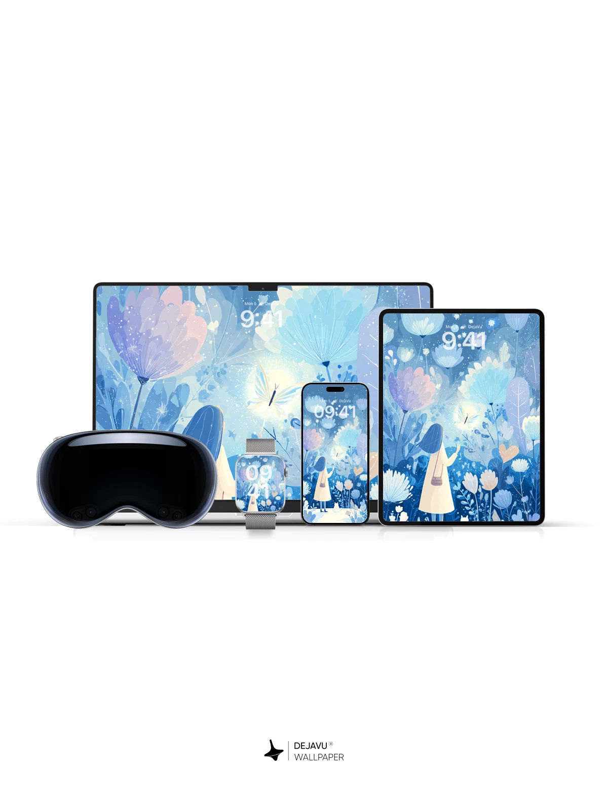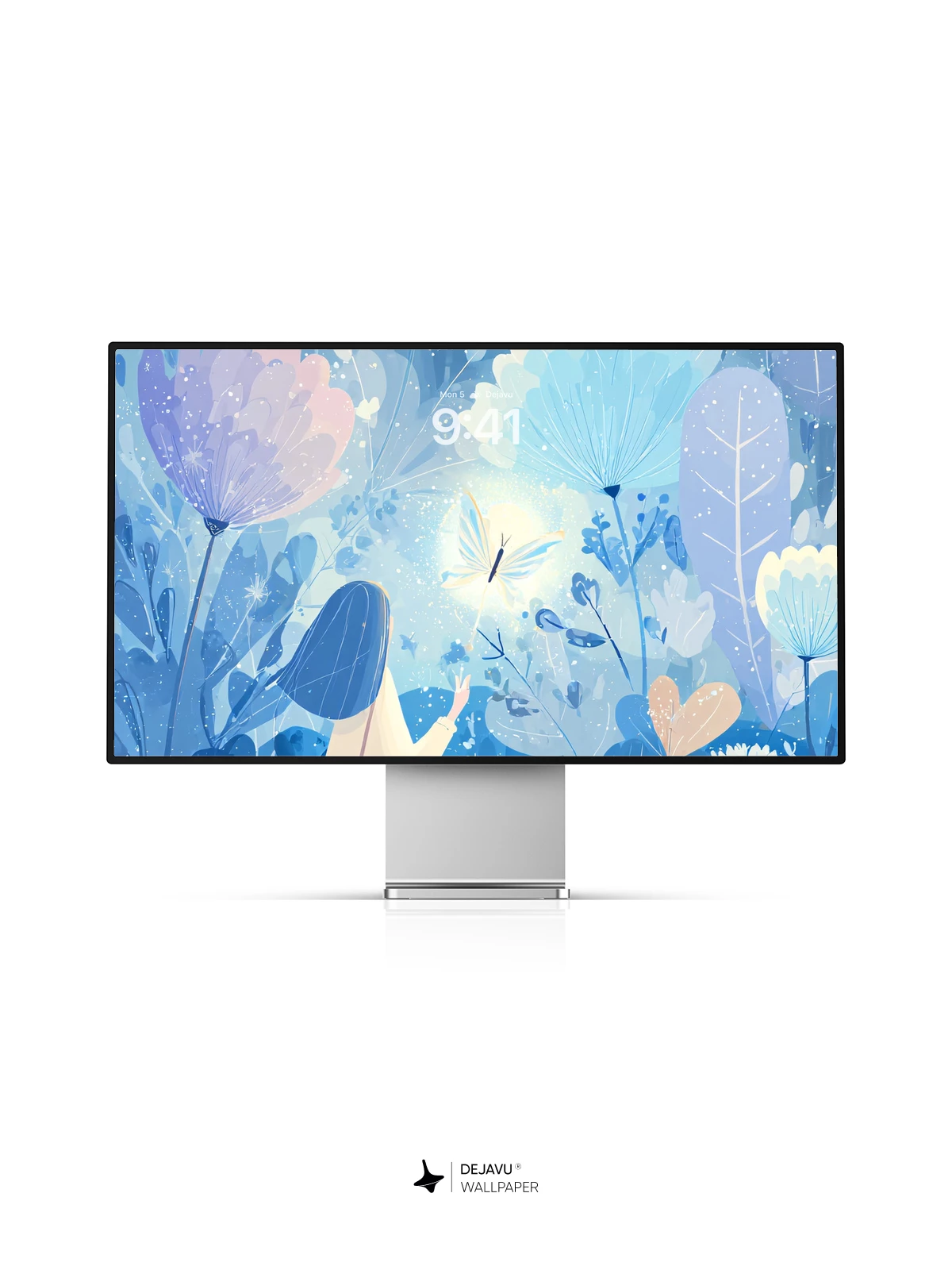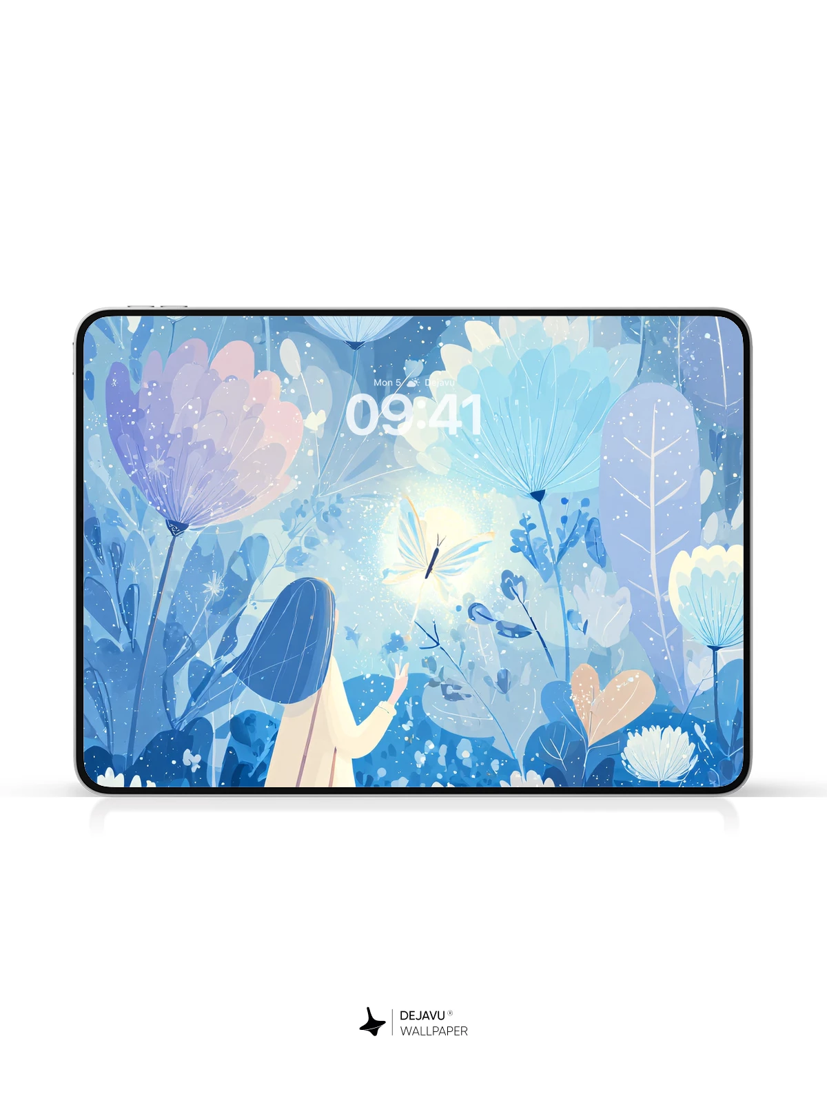 This enchanting fantasy illustration captures a serene night garden where luminous flowers and gentle snowflakes create a dreamlike atmosphere. A solitary figure in a flowing coat gazes at a glowing butterfly, evoking quiet wonder and peaceful solitude. The soft pastel blues and delicate details make it an ideal 8K wallpaper for iPhone, Android, or tablets, perfect for those who love whimsical, nature-inspired art.”.