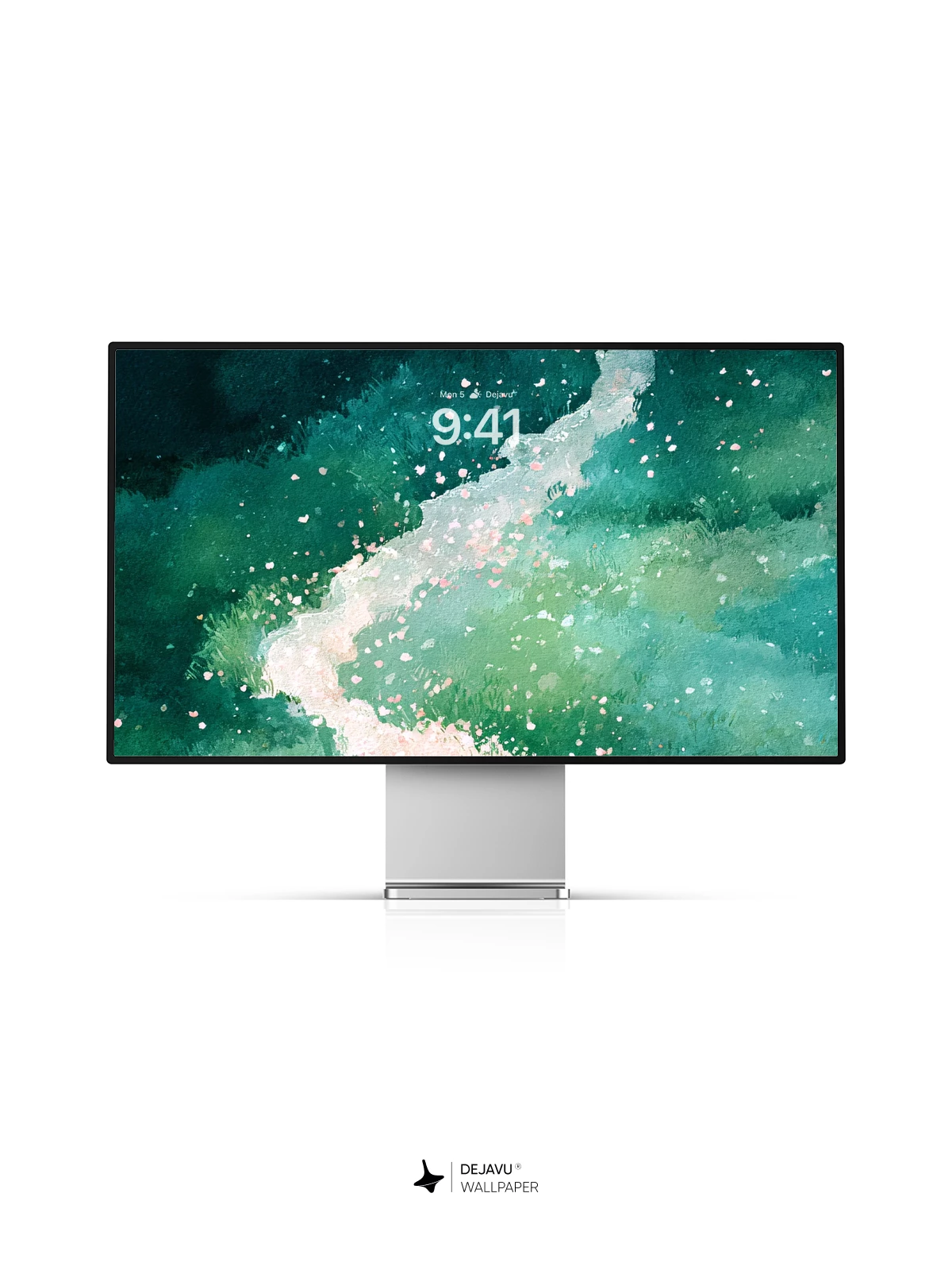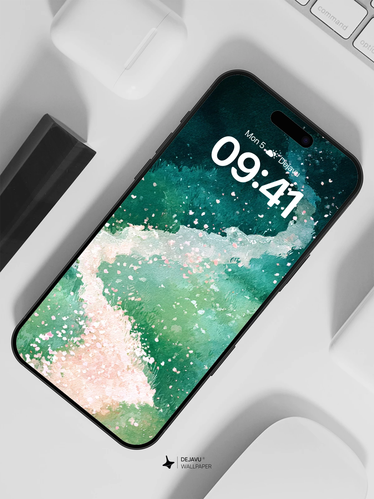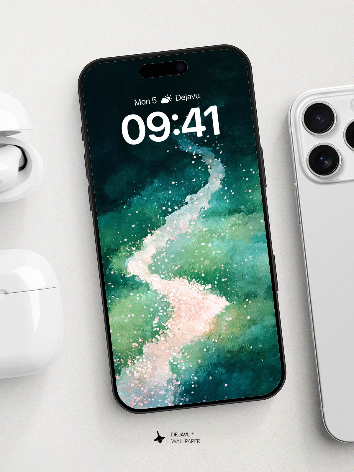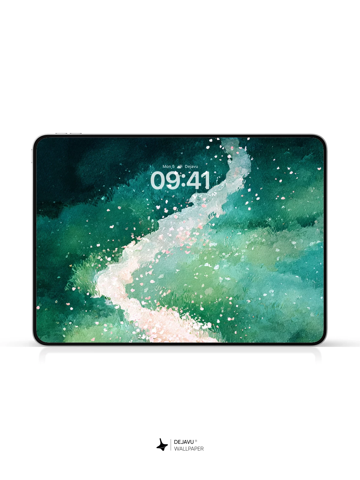 This 8K wallpaper captures a serene forest scene, where a glowing path meanders through lush greenery and delicate pink blossoms. The interplay of light and shadow creates a tranquil atmosphere, ideal for bringing a sense of calm to your iPhone, Android, or tablet screen.