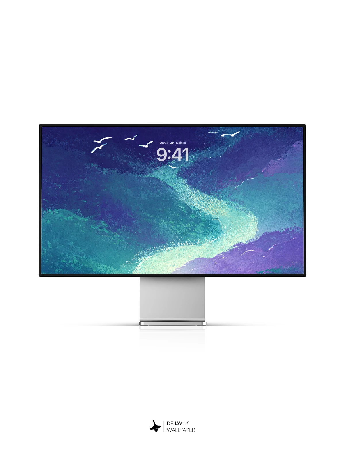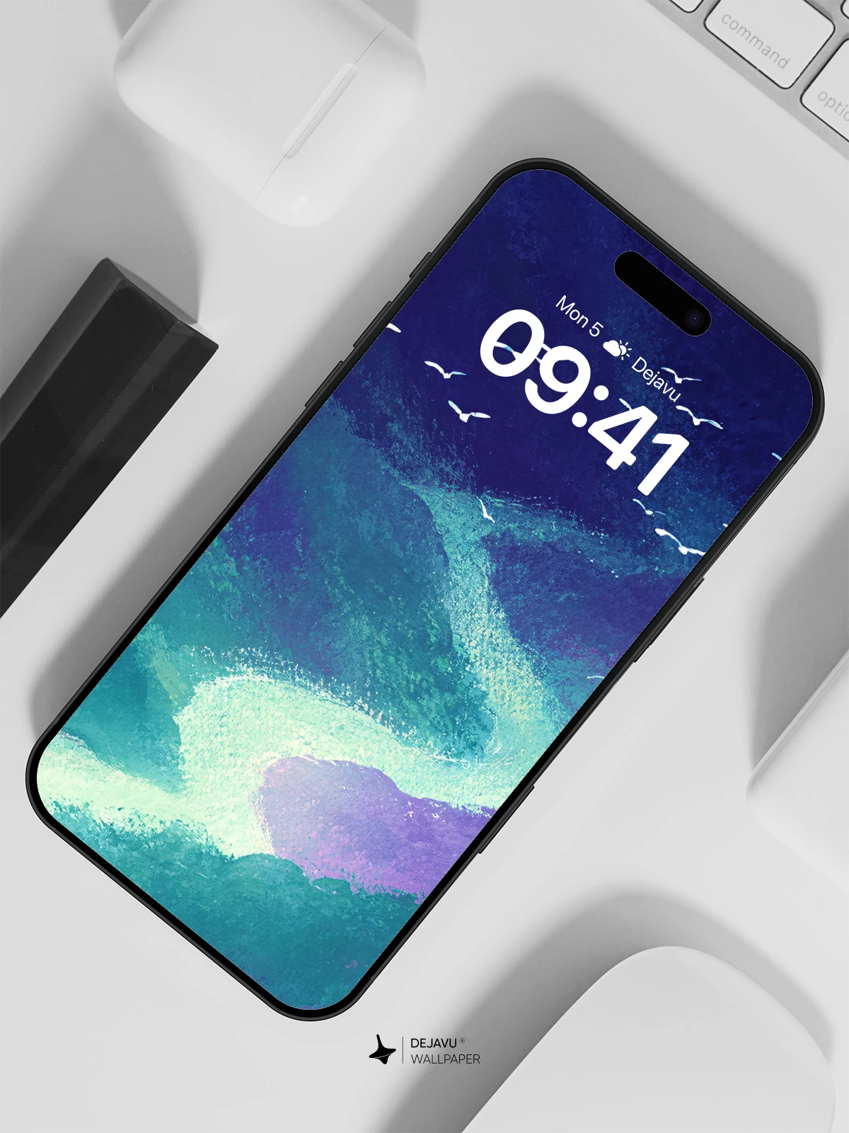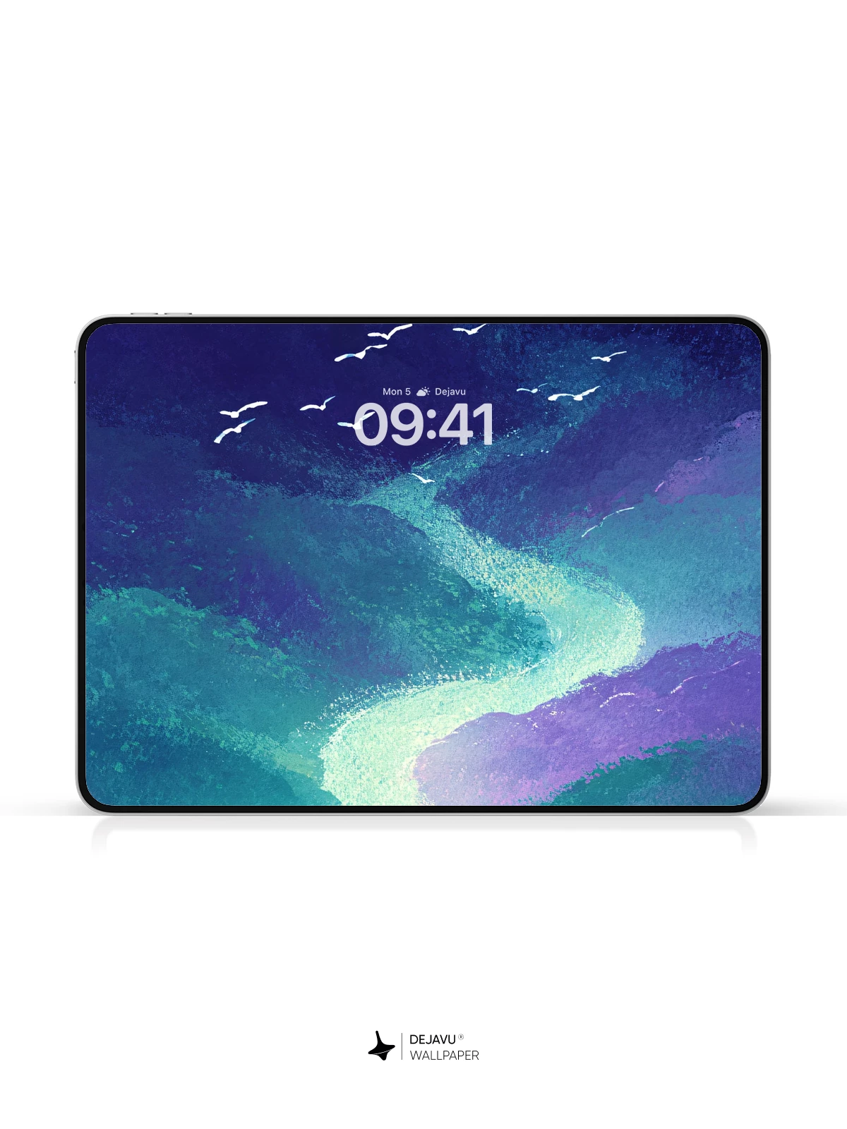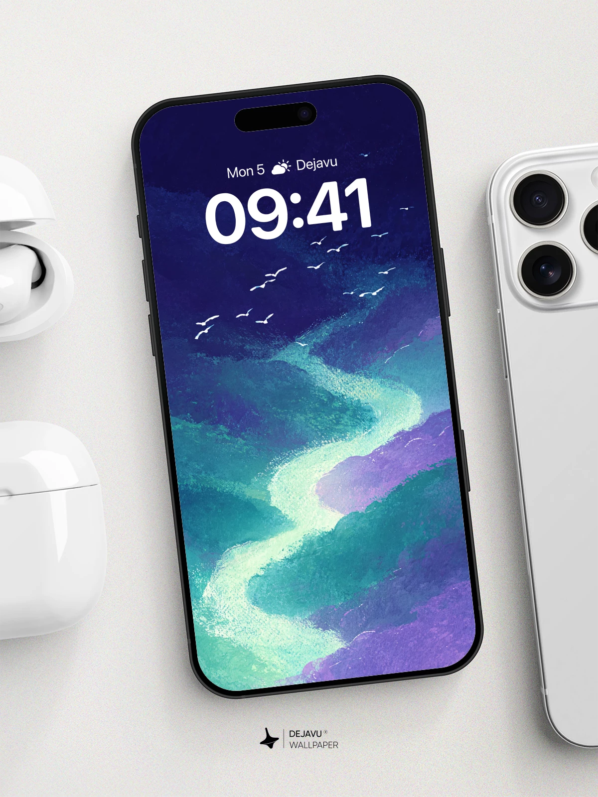 This stunning 8K wallpaper captures a tranquil river flowing through a mystical landscape of rich purples and vibrant teals. The soft, painterly texture and the silhouettes of birds in flight evoke a sense of peace and wonder. Perfect for enhancing the aesthetic of your iPhone, Android, or tablet, this wallpaper transforms your screen into a canvas of serene beauty.
