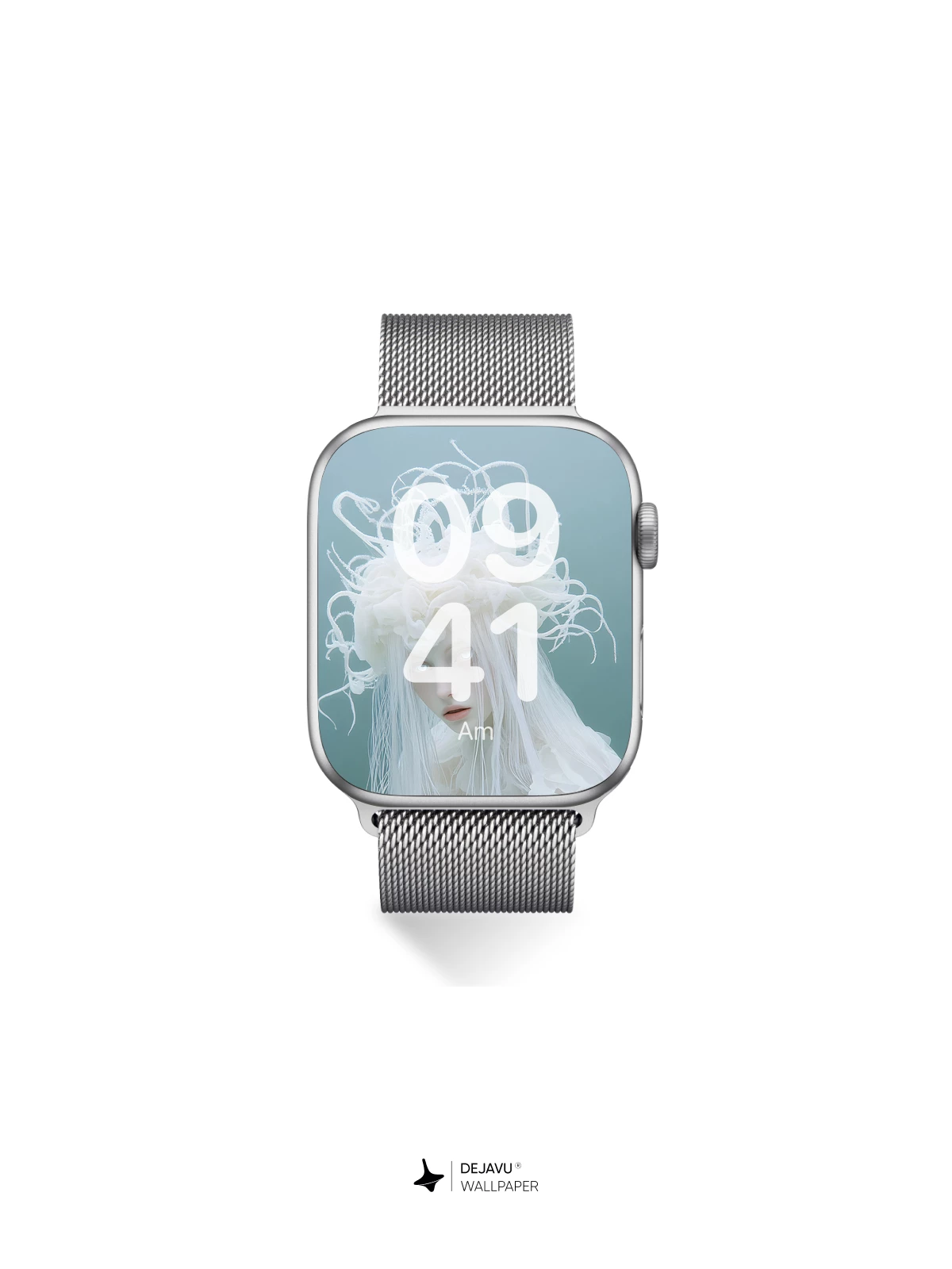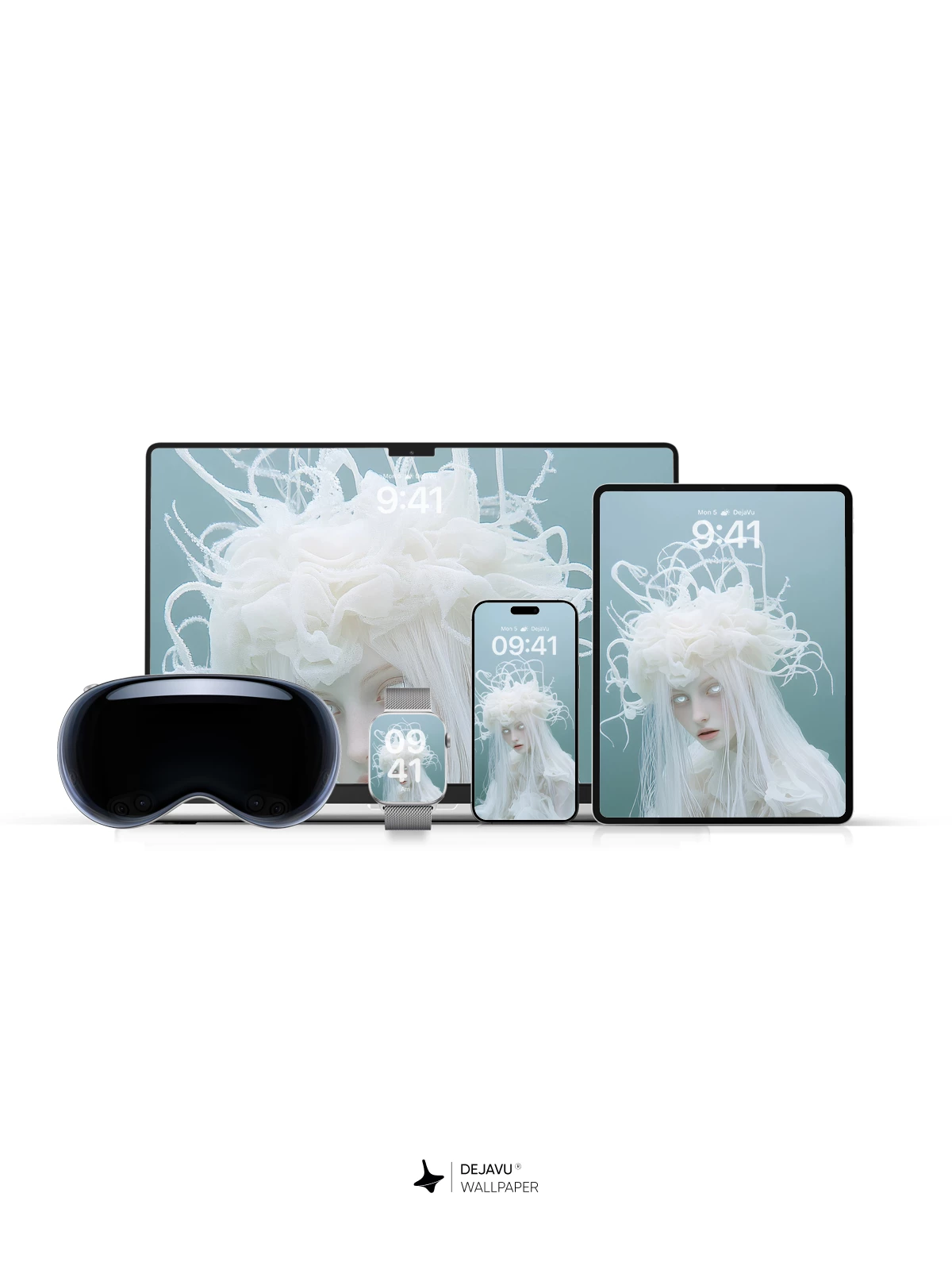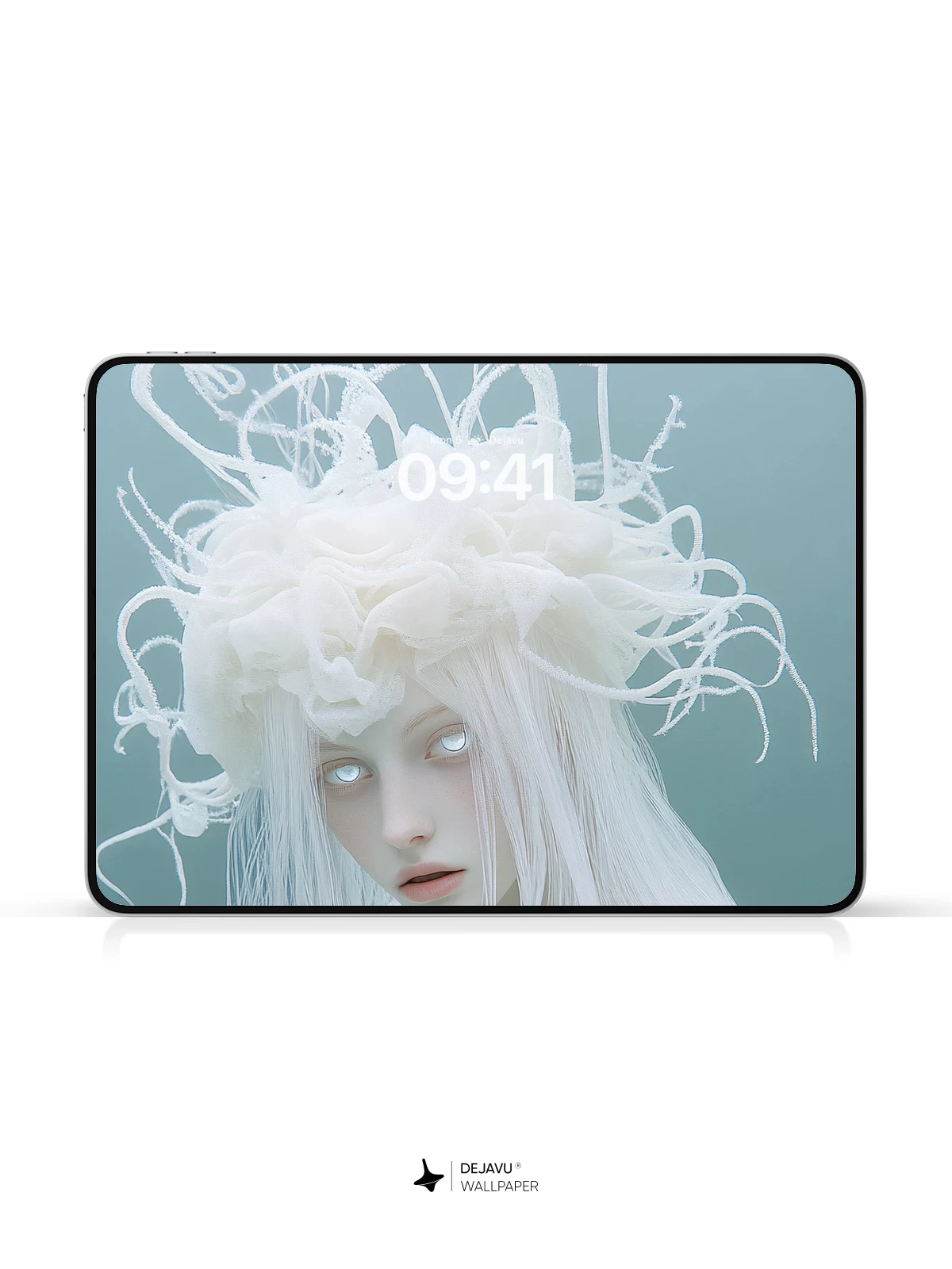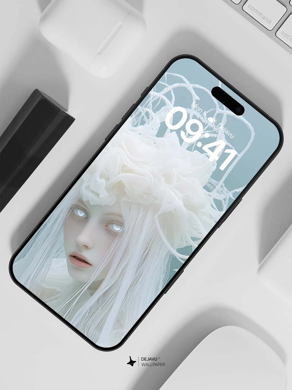 This surreal digital artwork captures a mystical figure draped in delicate white fabric, crowned with an elaborate, flower-like headpiece that seems to float like frost on air. The ethereal glow of her eyes and the dreamlike composition evoke a sense of otherworldly grace and quiet wonder. Inspired by high-fashion editorial photography and fantasy art, this image blends elegance with surrealism, making it an ideal 8K wallpaper for iPhone, Android, or tablet screens. Its cool tonal palette and intricate textures bring a touch of magic to any device.
