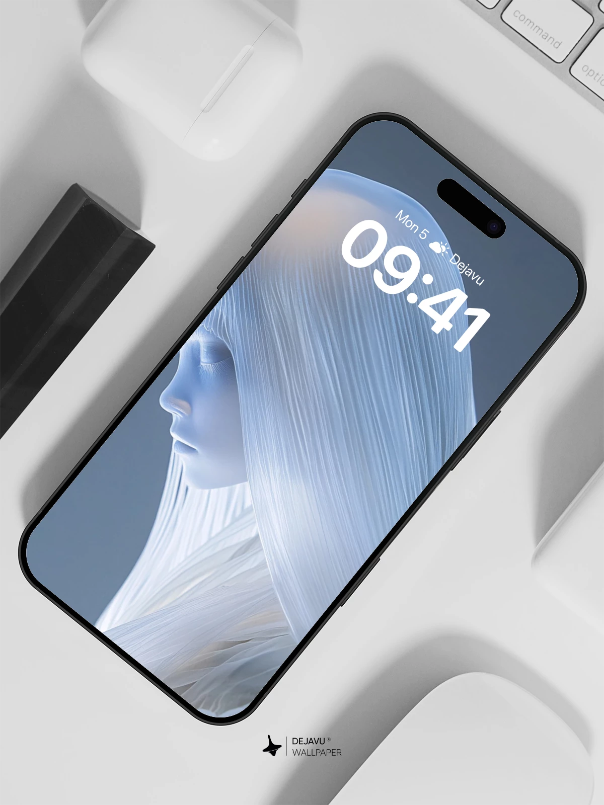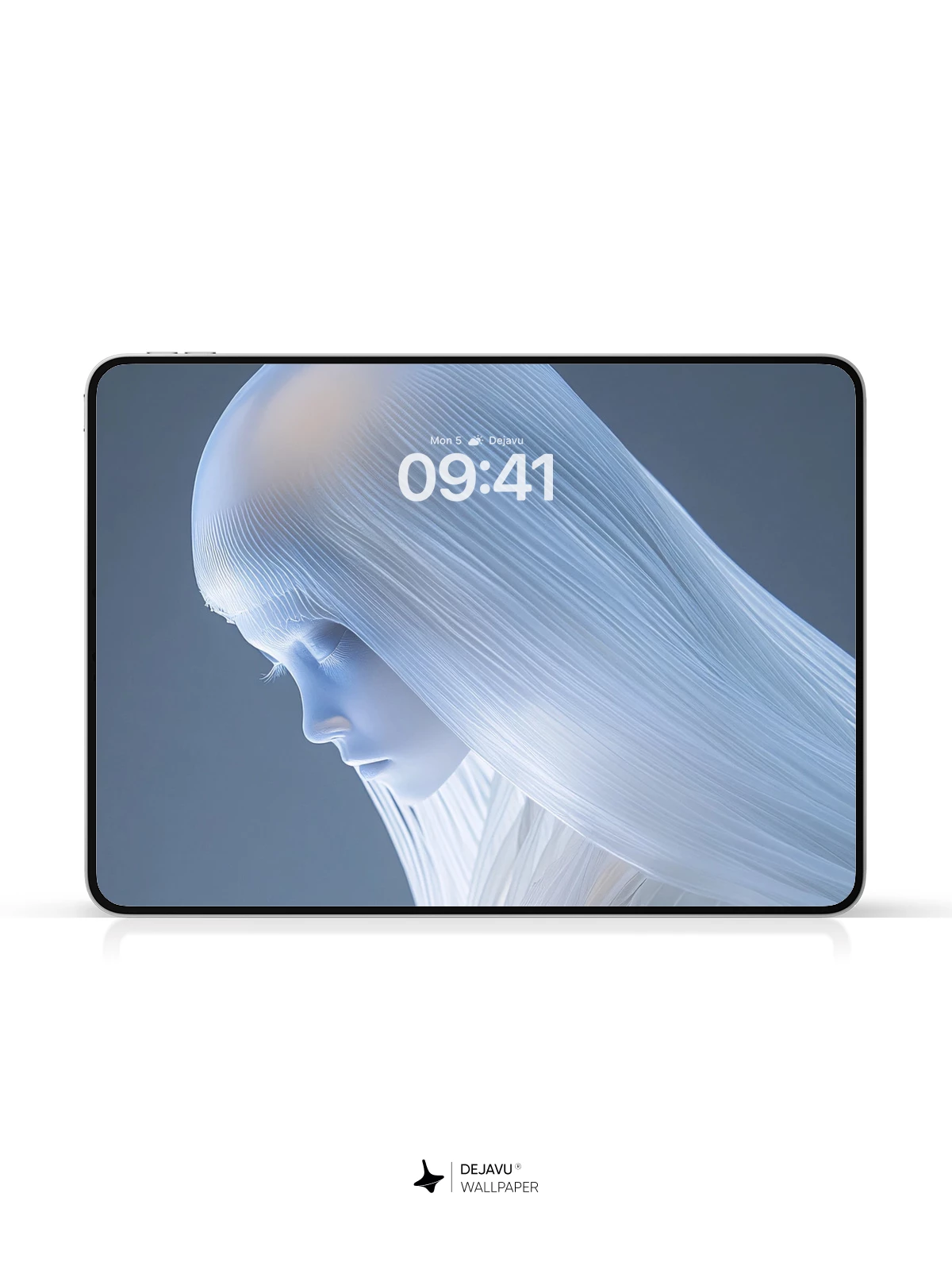 This ethereal portrait captures a serene, ghostly figure bathed in cool blue tones, her long white hair cascading like mist over delicate, feather-like garments. The image evokes a sense of celestial solitude and mystical grace, blending fantasy and minimalism into a hauntingly beautiful visual experience. Ideal as an 8K wallpaper for iPhone, Android, or tablets, it transforms any screen into a portal of quiet wonder and timeless beauty.