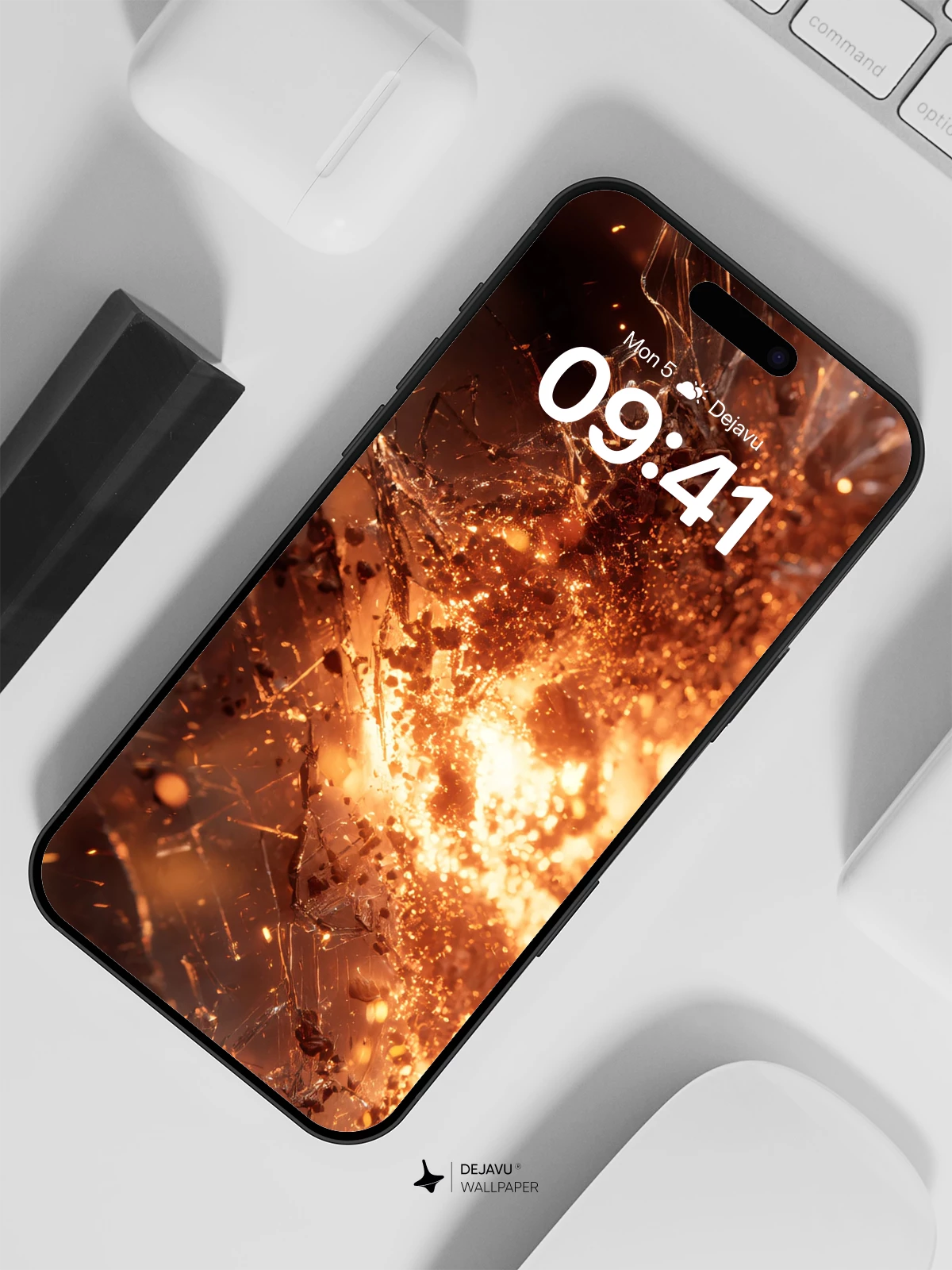 Witness the raw power of destruction in this high-resolution 8K wallpaper, where molten sparks and fractured glass explode into a dazzling display of fire and motion. The image captures a moment of intense energy, blending realism with cinematic flair to evoke awe and adrenaline. Ideal for iPhone, Android, or tablet screens, this dynamic design transforms your device into a portal of visual intensity. Perfect for fans of action-packed visuals and high-impact digital art.