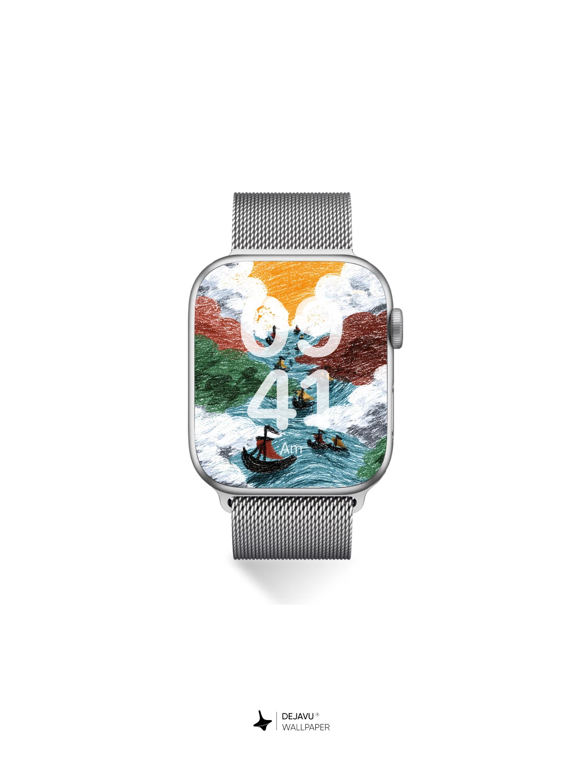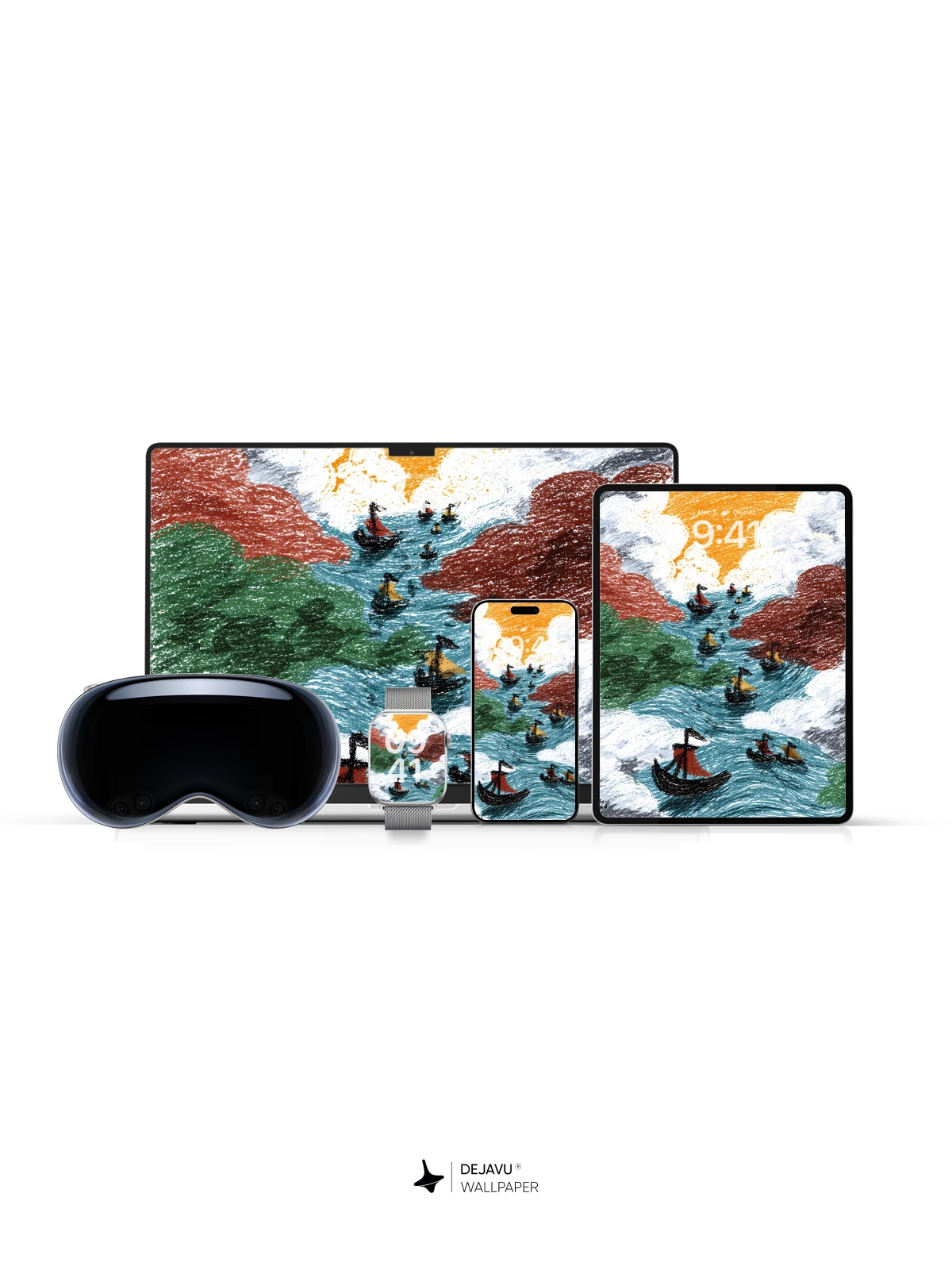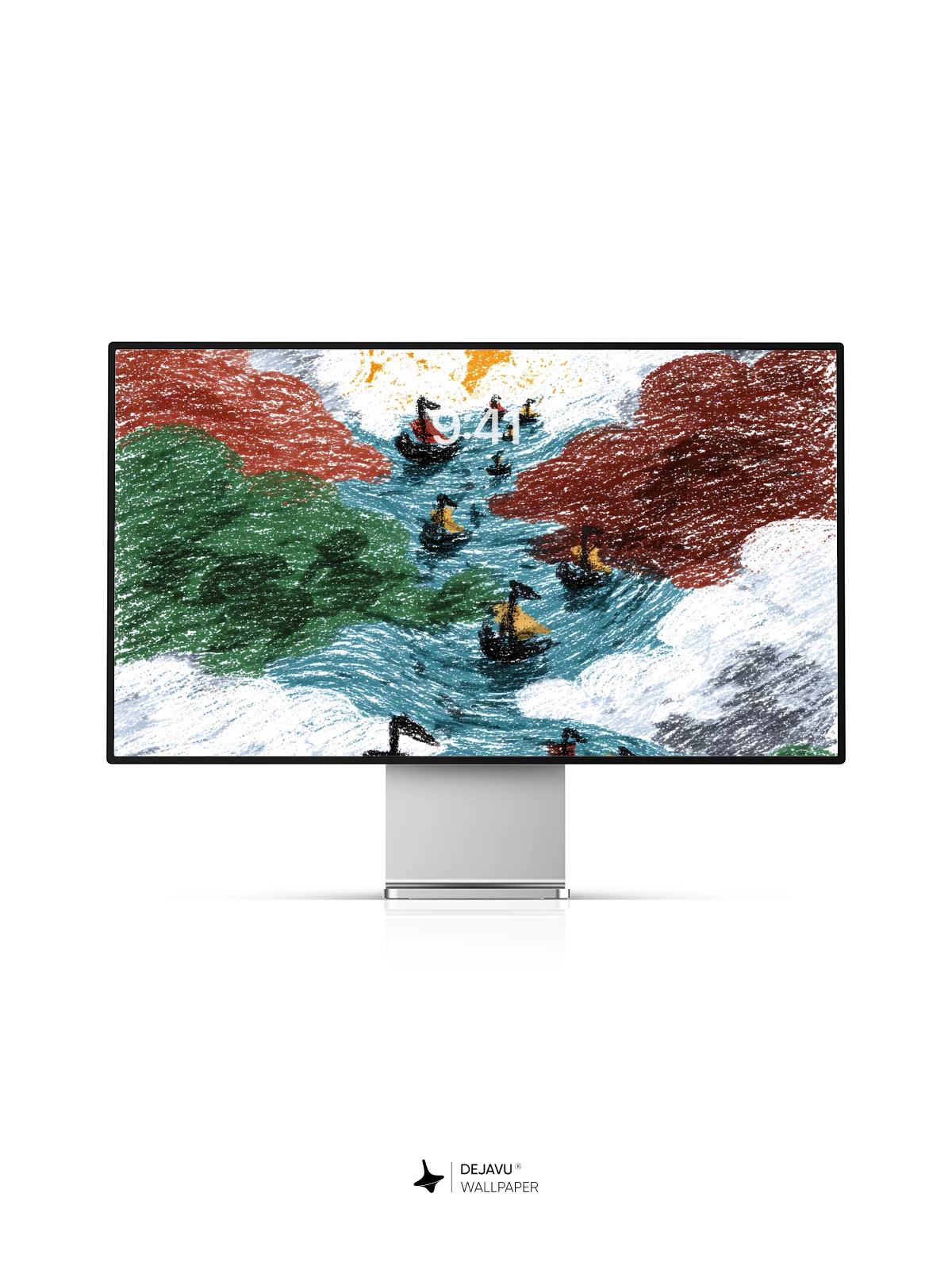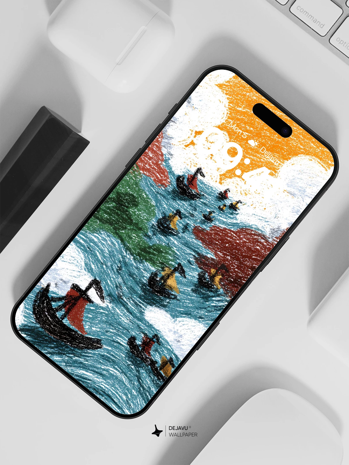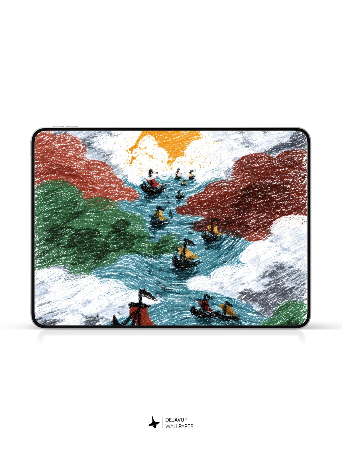 This whimsical, hand-drawn artwork captures a magical river voyage through colorful cliffs and swirling clouds, with sailboats gliding beneath a radiant sunset. Rendered in a rich crayon-like texture, the piece evokes a childlike wonder and adventurous spirit, making it a perfect 8K wallpaper for iPhone, Android, or any mobile device that celebrates imaginative design. The vivid palette and flowing composition create a serene yet dynamic visual escape, ideal for those who love fantasy-inspired art and unique digital backgrounds.