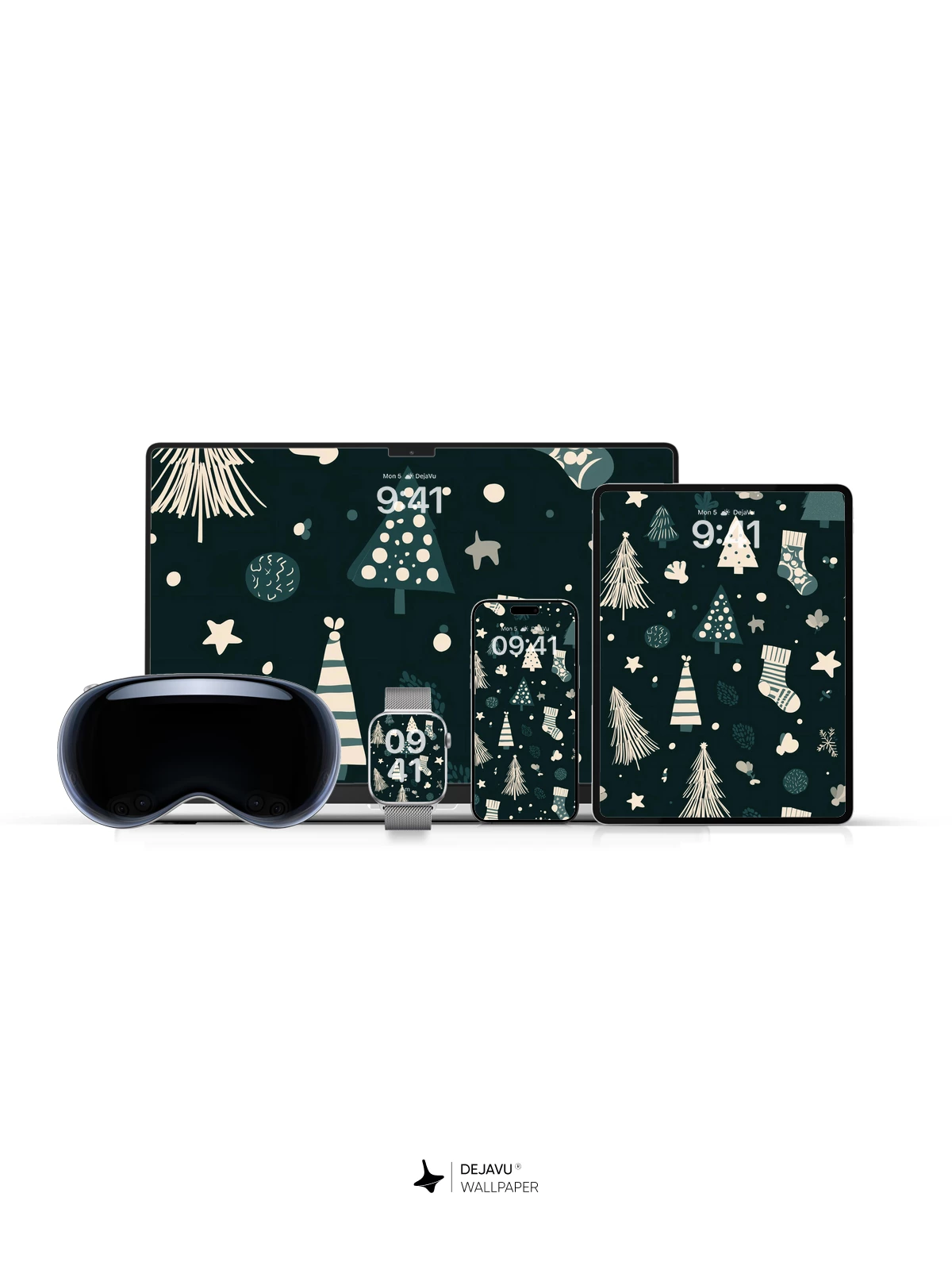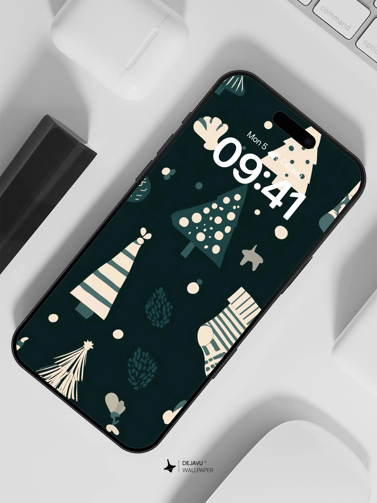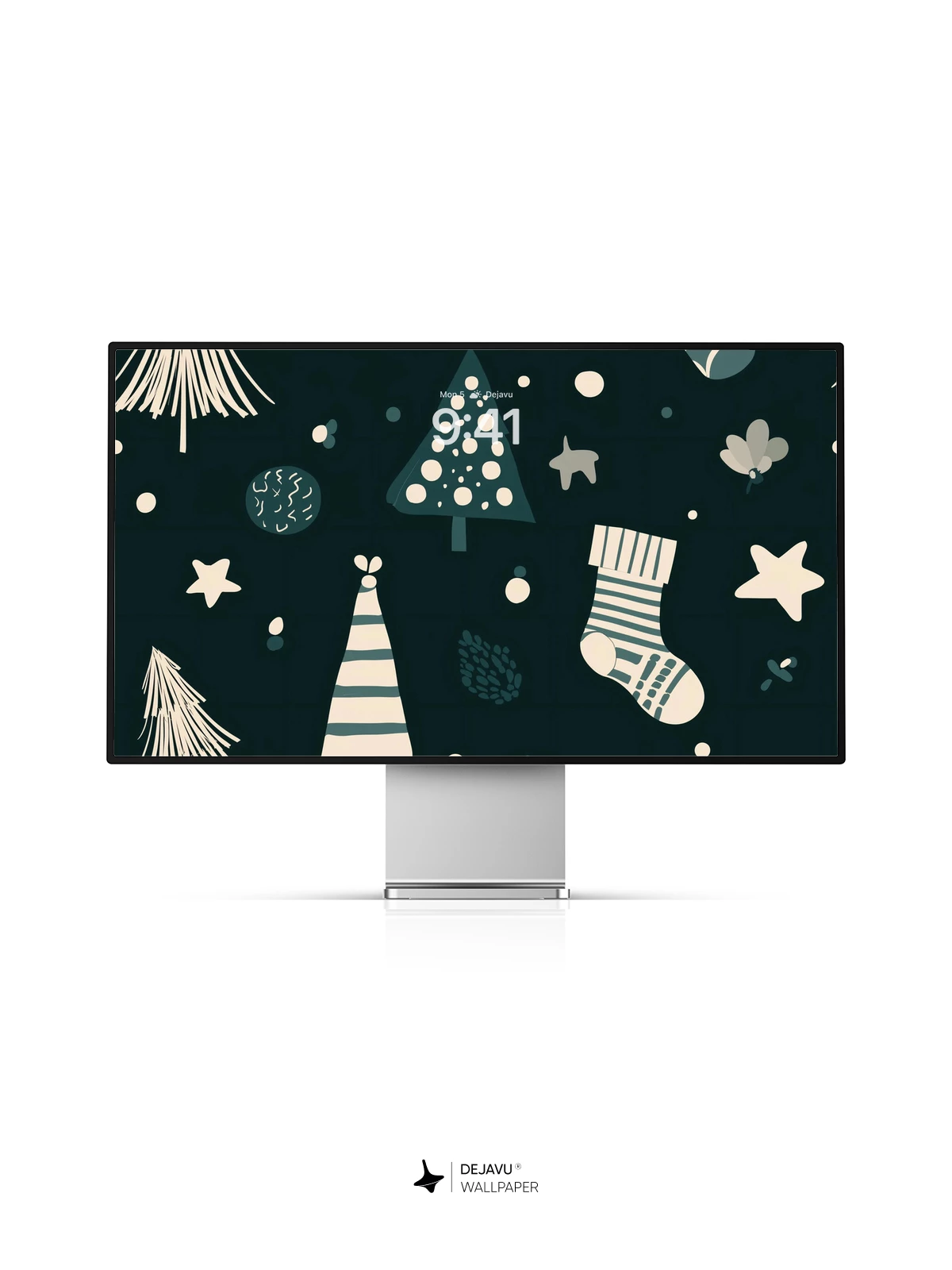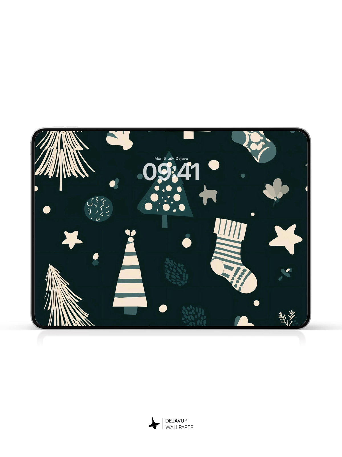 This whimsical winter-themed wallpaper brings the warmth of the holiday season to your device with a playful yet elegant pattern of stylized Christmas trees, cozy socks, snowflakes, and stars. Set against a rich dark teal backdrop, the soft cream and muted blue accents create a soothing, festive atmosphere. Inspired by Scandinavian folk art, the design blends simplicity with seasonal joy, making it ideal for iPhone, Android, or tablet screens. Whether you’re decking your digital halls or seeking a cheerful daily reminder of the holidays, this 8K wallpaper delivers timeless charm with crisp clarity.