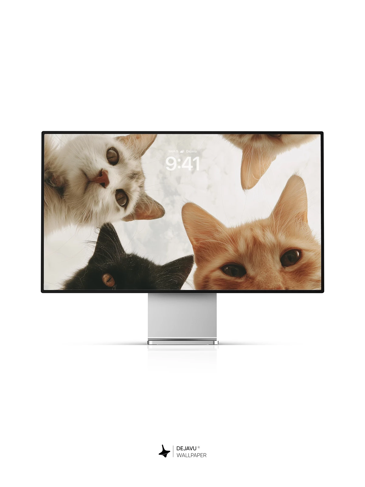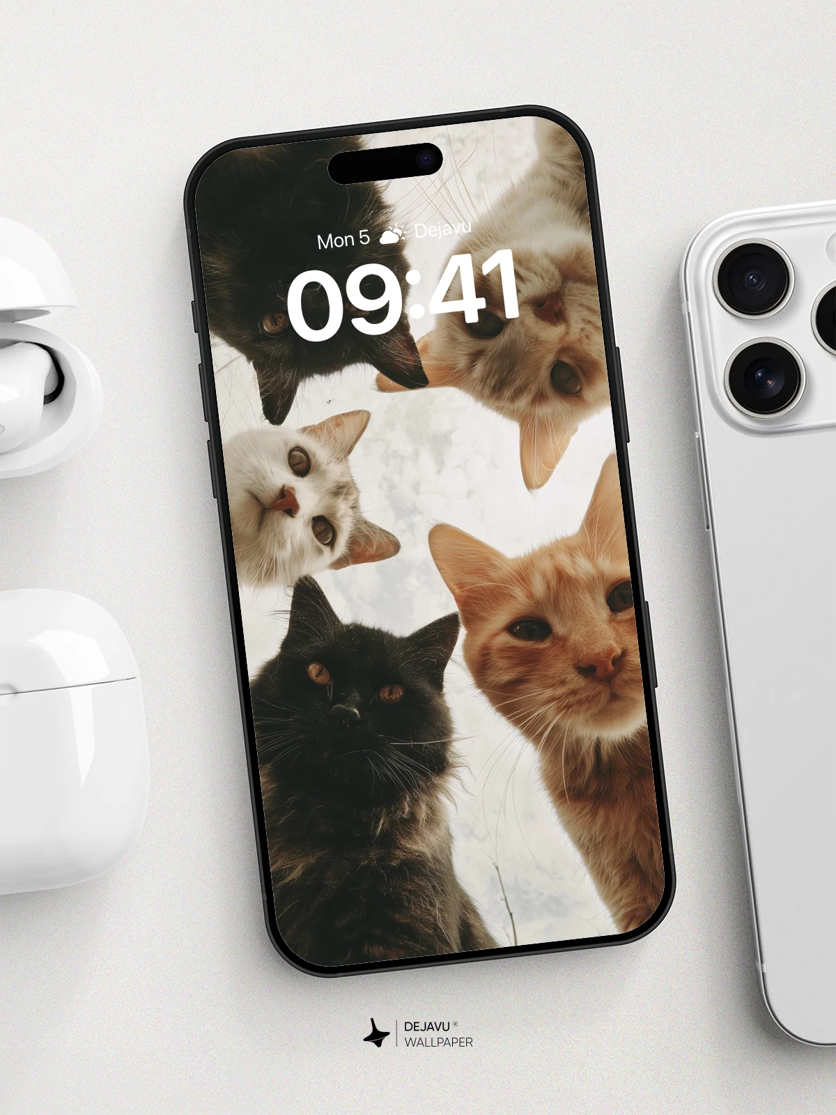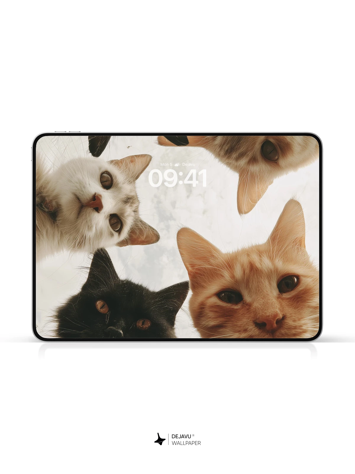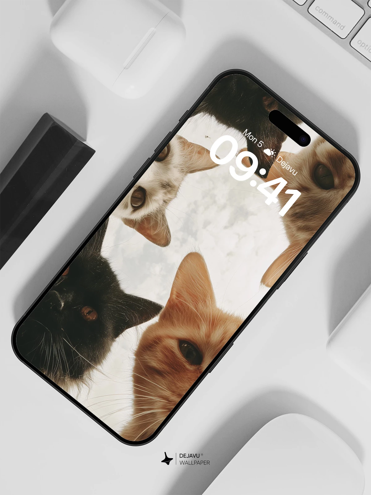 This captivating 8K wallpaper showcases five cats—black, white, and ginger—arranged in a circular formation, all looking directly into the camera with wide, inquisitive eyes. The composition creates an intimate, almost surreal moment of connection, blending natural charm with artistic balance. Perfect for iPhone, Android, or tablet screens, this high-definition image brings warmth and whimsy to any device. The soft lighting and detailed fur textures make it a standout choice for cat lovers seeking unique, emotionally engaging backgrounds.