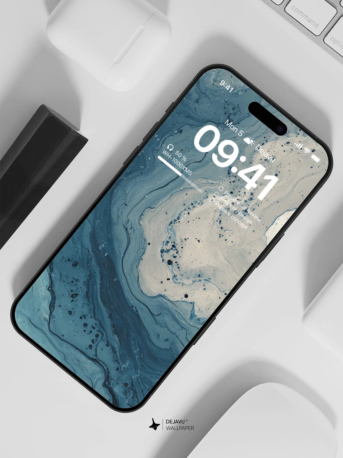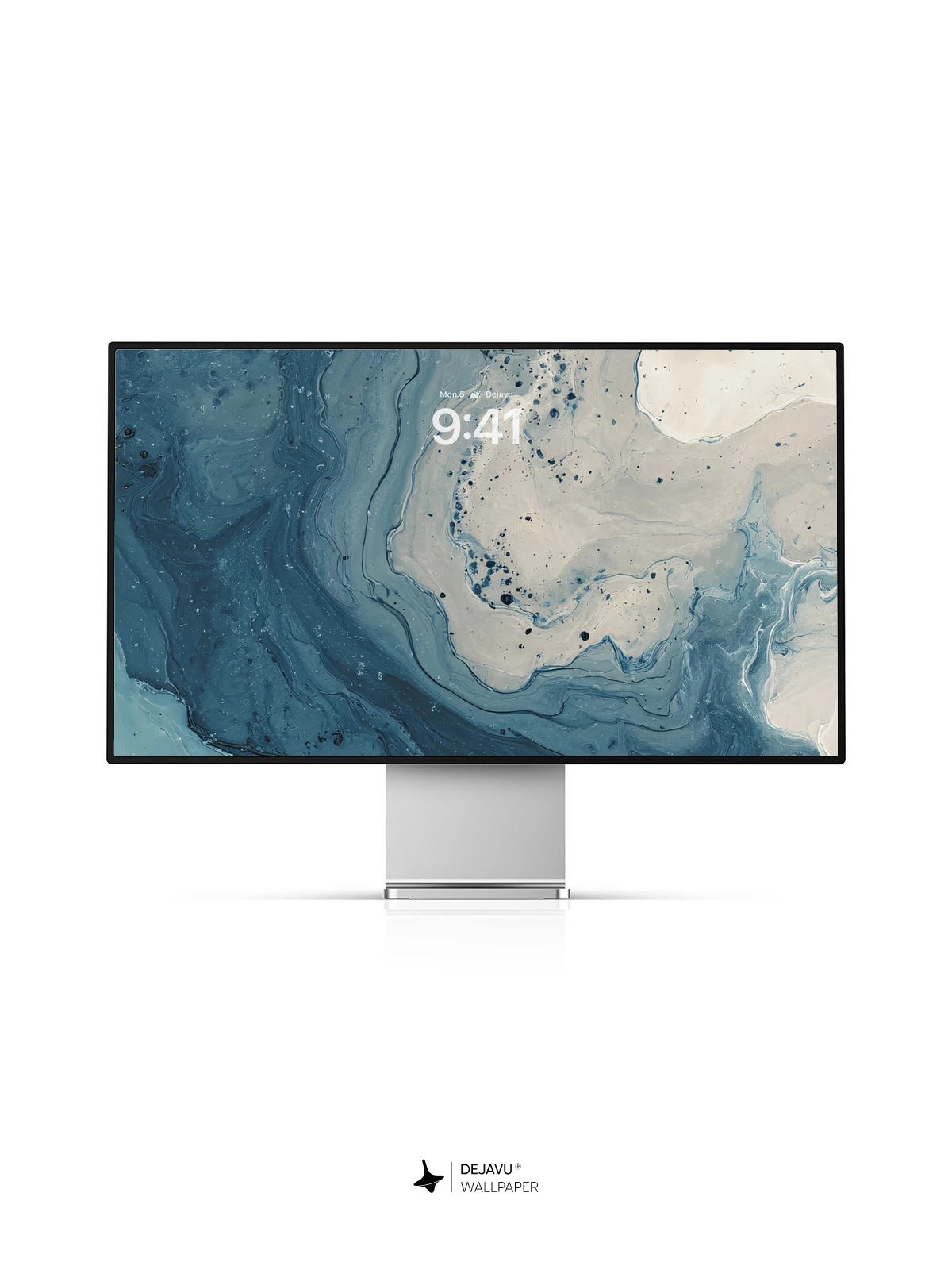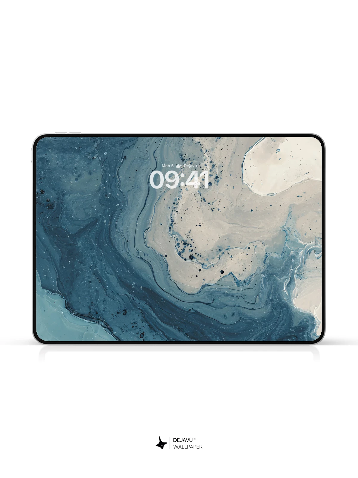 Deep and light blues swirl together with creamy whites, creating a dynamic yet calming abstract composition. The marble-inspired flow and scattered speckles evoke a sense of movement, perfect for adding a sophisticated touch to any device. Compatible with iPhone, Android, and tablets in crisp 8K resolution.