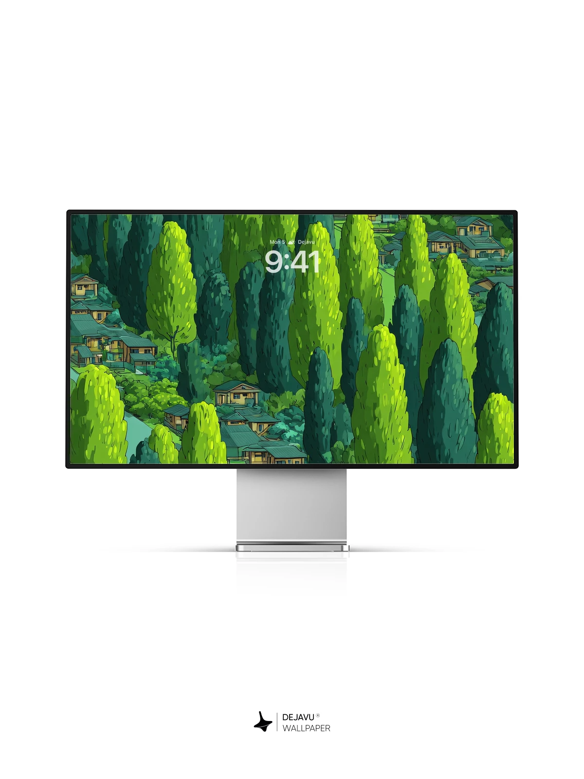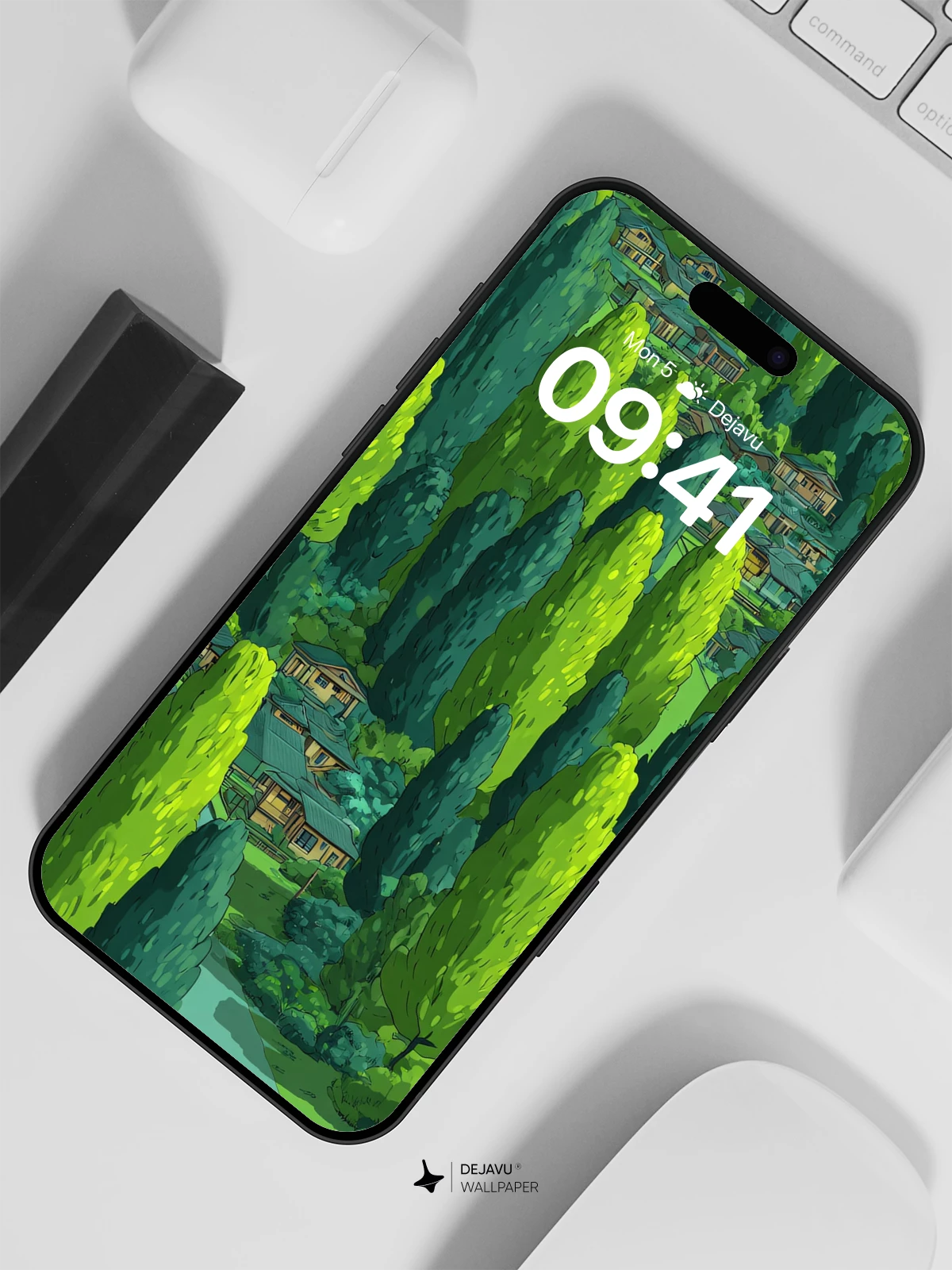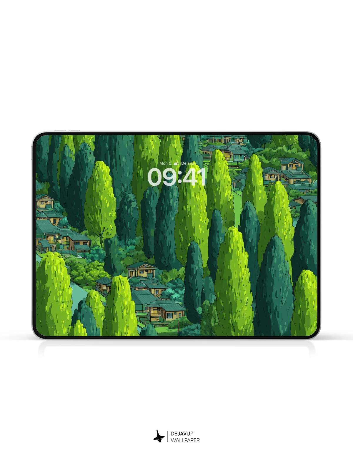 This captivating 8K wallpaper showcases a whimsical aerial view of a serene forest village nestled among towering evergreens, with charming wooden homes peeking through the canopy. Inspired by animated cartoon aesthetics, the scene blends nature and nostalgia with a bright, cheerful palette. A yellow van travels along a meandering path, adding a touch of adventure to the tranquil landscape. Ideal for iPhone, Android, and tablet devices, this high-resolution artwork brings a sense of peaceful exploration to your mobile screen.