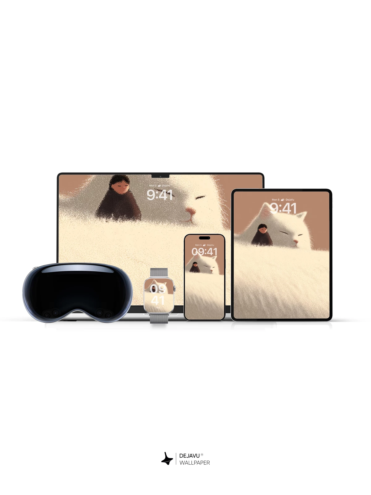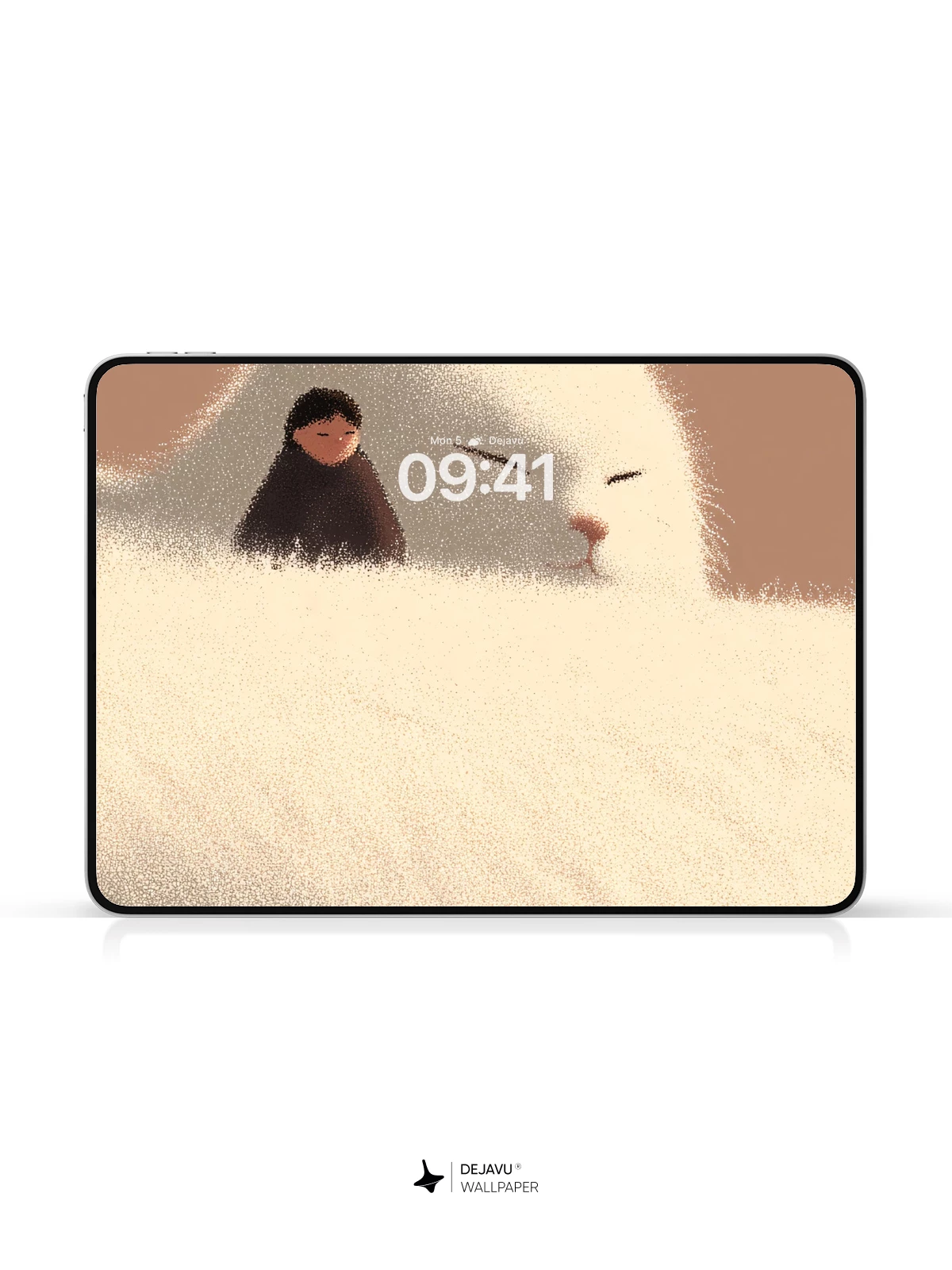 This enchanting 8K wallpaper captures a serene moment where a small child rests gently atop the soft fur of an enormous, peacefully sleeping white cat. The gentle contrast of scale and warmth evokes a sense of safety and innocence, creating a dreamlike atmosphere ideal for iPhone, Android, or tablet screens. Inspired by illustrative storytelling with soft textures and minimalistic elegance, it transforms your device into a portal of quiet wonder and imagination.