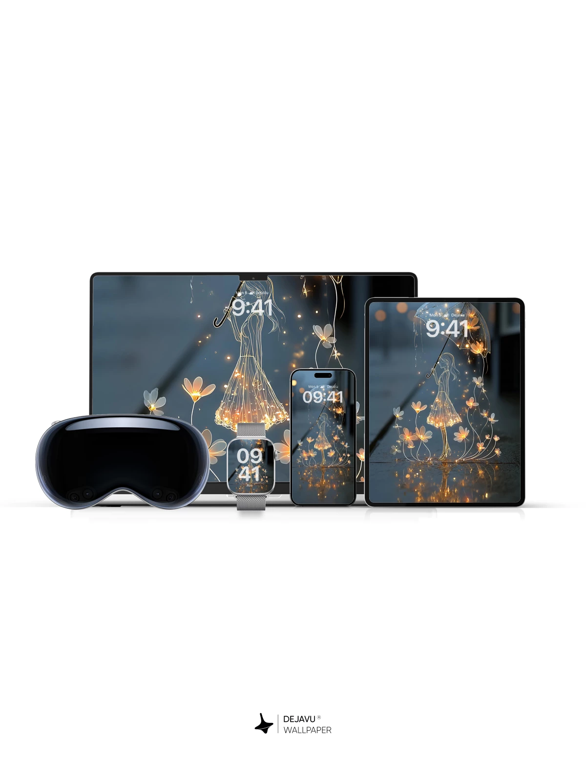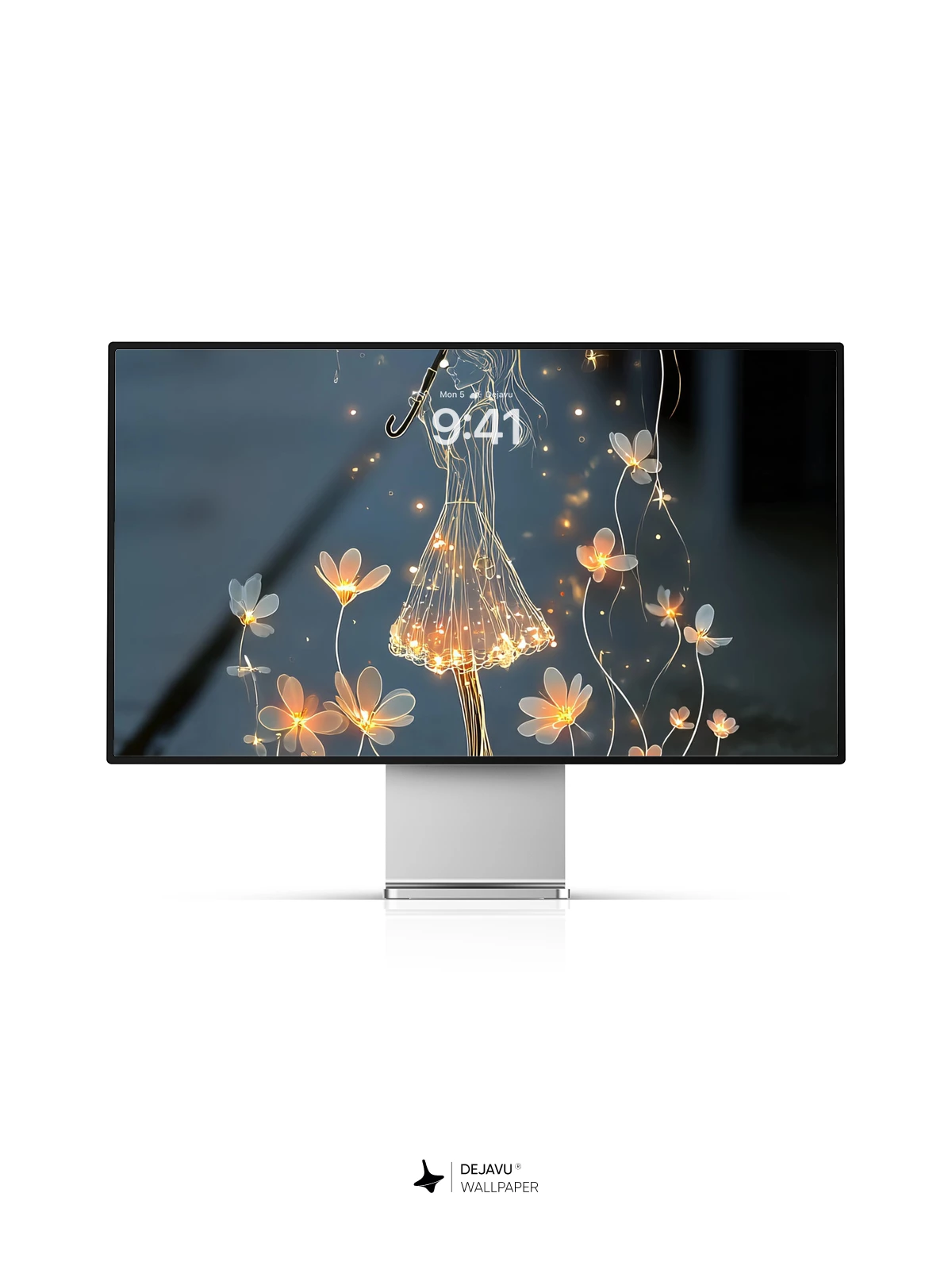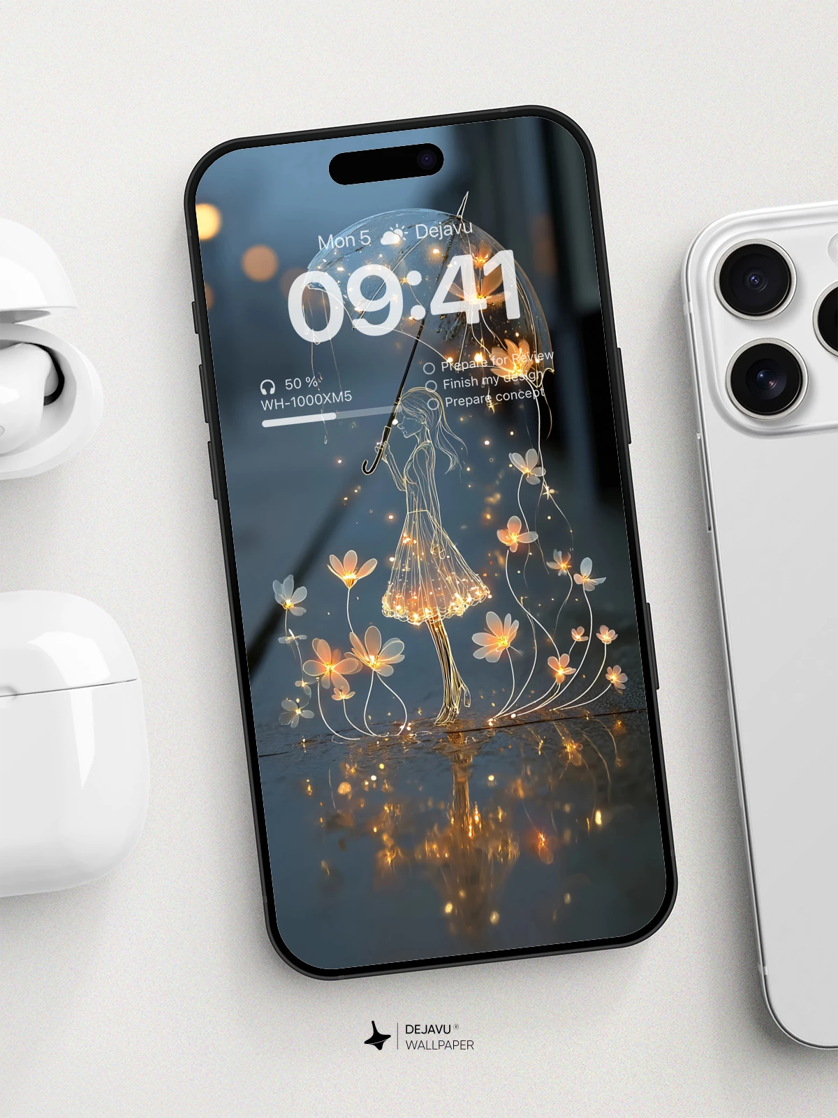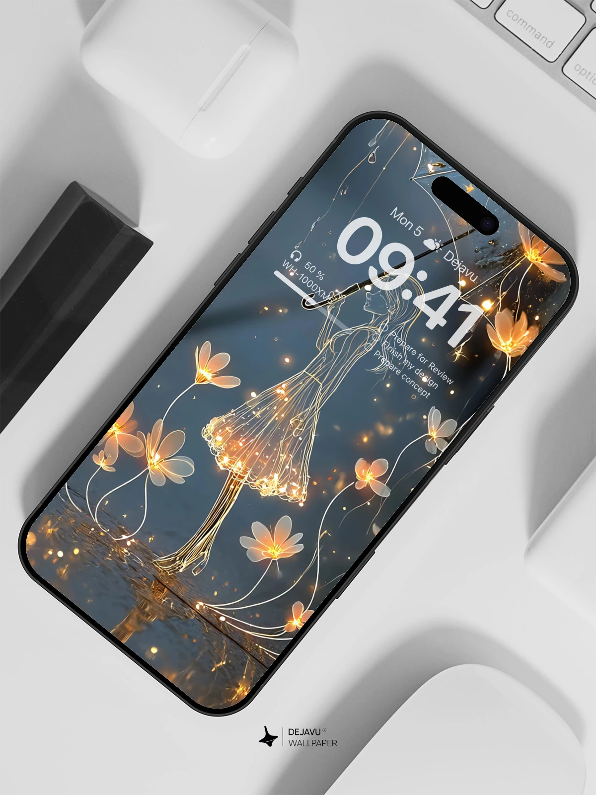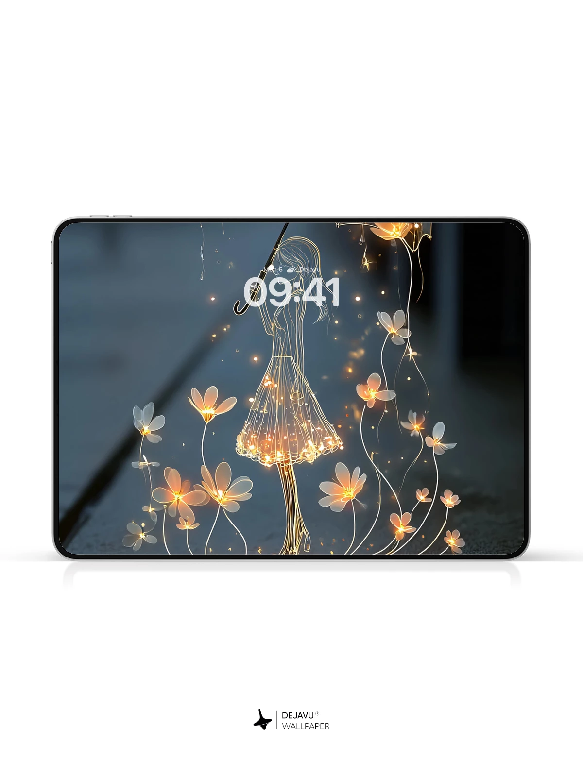 This enchanting 8K wallpaper captures a surreal moment where a delicate, glowing figure walks through a rainy cityscape, sheltered by a transparent umbrella blooming with radiant flowers. Each petal emits a soft golden light, reflecting beautifully on the wet pavement, creating a dreamlike atmosphere of wonder and quiet beauty. Inspired by fantasy art and digital surrealism, this image evokes a sense of gentle magic and emotional serenity. Ideal for iPhone, Android, or tablet screens, it transforms your device into a portal to a whimsical world.