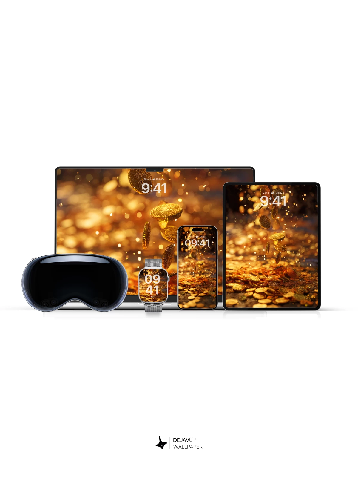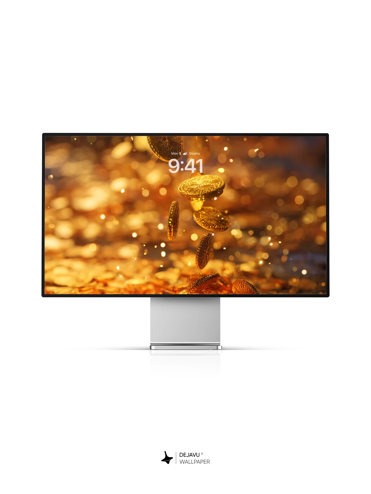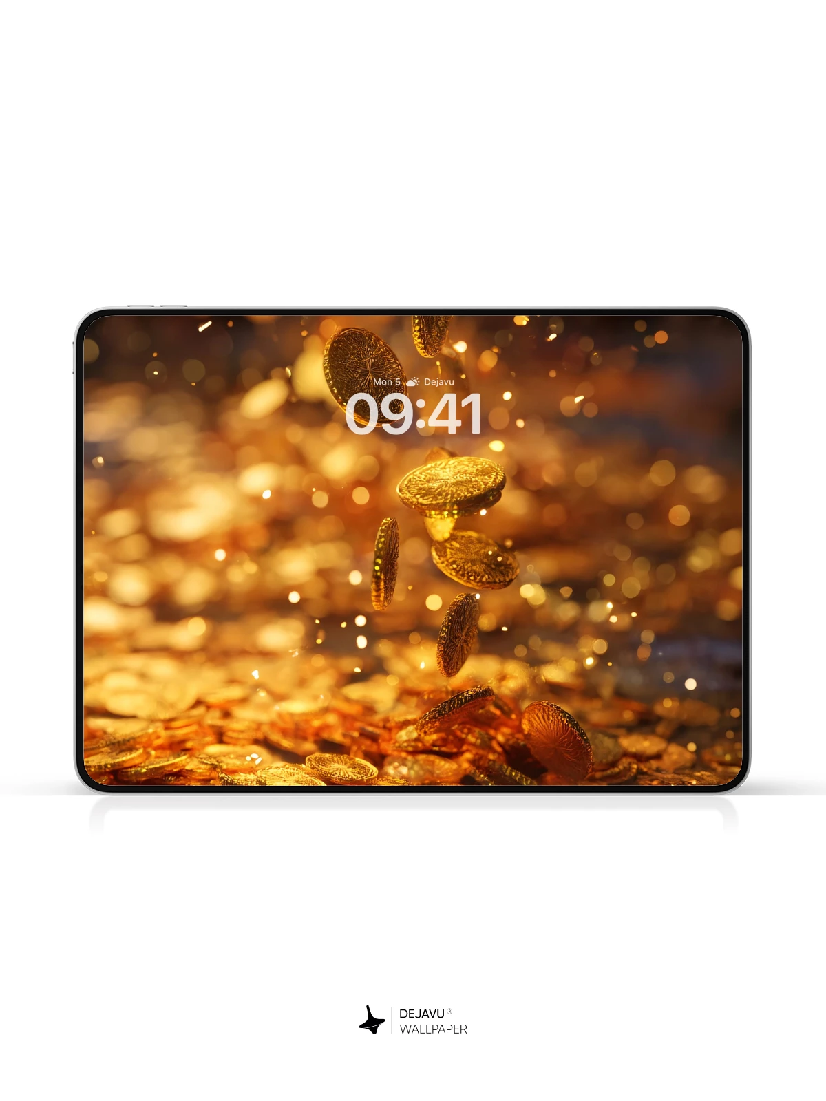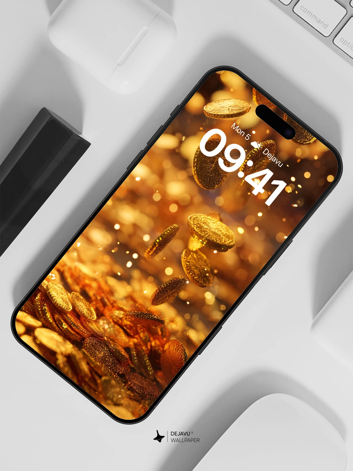 Golden coins rain down like celestial treasure, each glinting with radiant light and sparkling particles that dance through the air. This mesmerizing 8K wallpaper evokes wealth, fortune, and timeless allure, ideal for enhancing your iPhone, Android, or tablet screen with a touch of fantasy and elegance.
