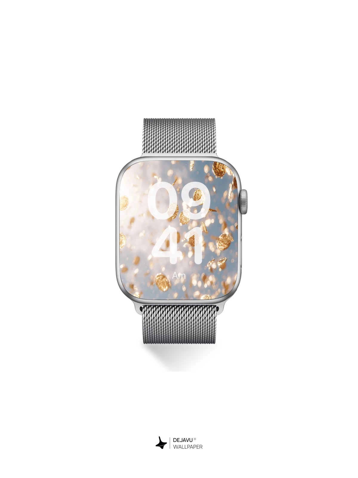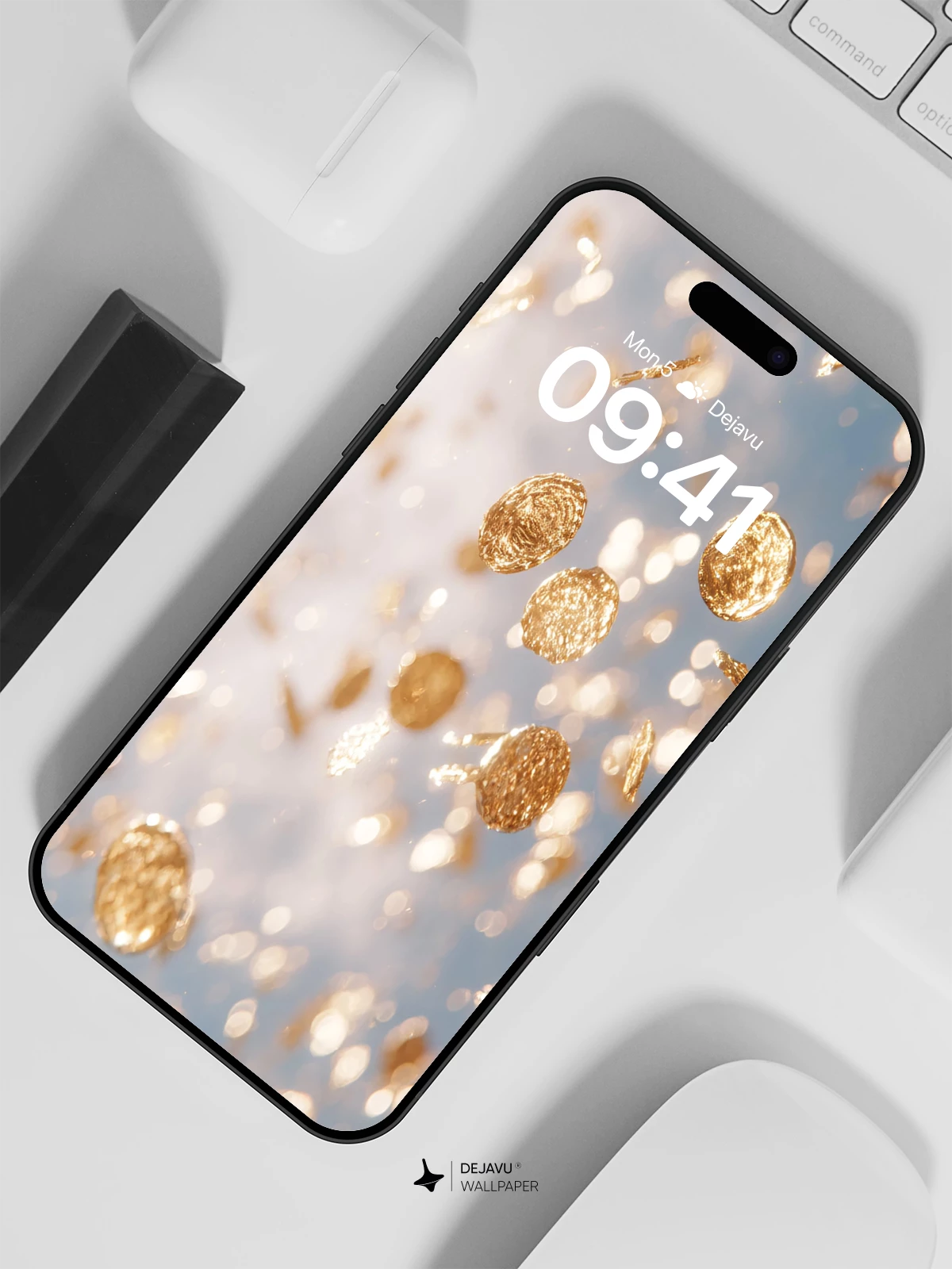 A breathtaking cascade of golden confetti floats against a luminous blue sky, illuminated by radiant sunlight. Each shimmering fragment glimmers like a tiny star, evoking joy, celebration, and magic. Ideal as an 8K wallpaper for iPhone, Android, or tablets, this design transforms your device into a portal of light and wonder. Perfect for those who love festive elegance with a touch of whimsy.