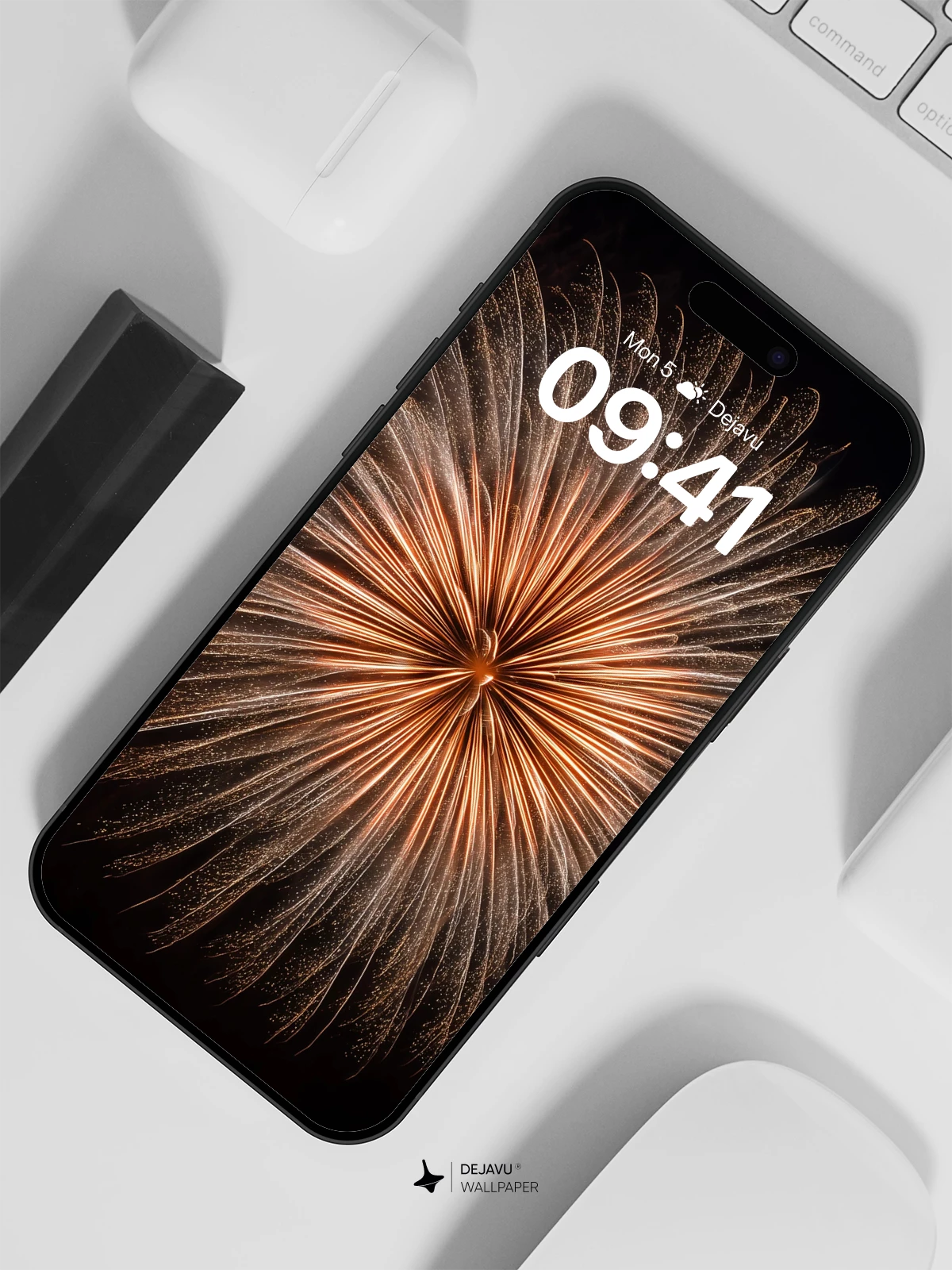 This breathtaking 8K wallpaper captures the radiant moment of a golden firework bursting into a symmetrical starburst, illuminating the darkness with warm, glowing streaks. The intricate patterns and luminous texture evoke a sense of celebration and wonder, making it an ideal choice for iPhone, Android, or tablet screens. Perfect for those who love dynamic, high-resolution visuals that bring energy and elegance to their device.