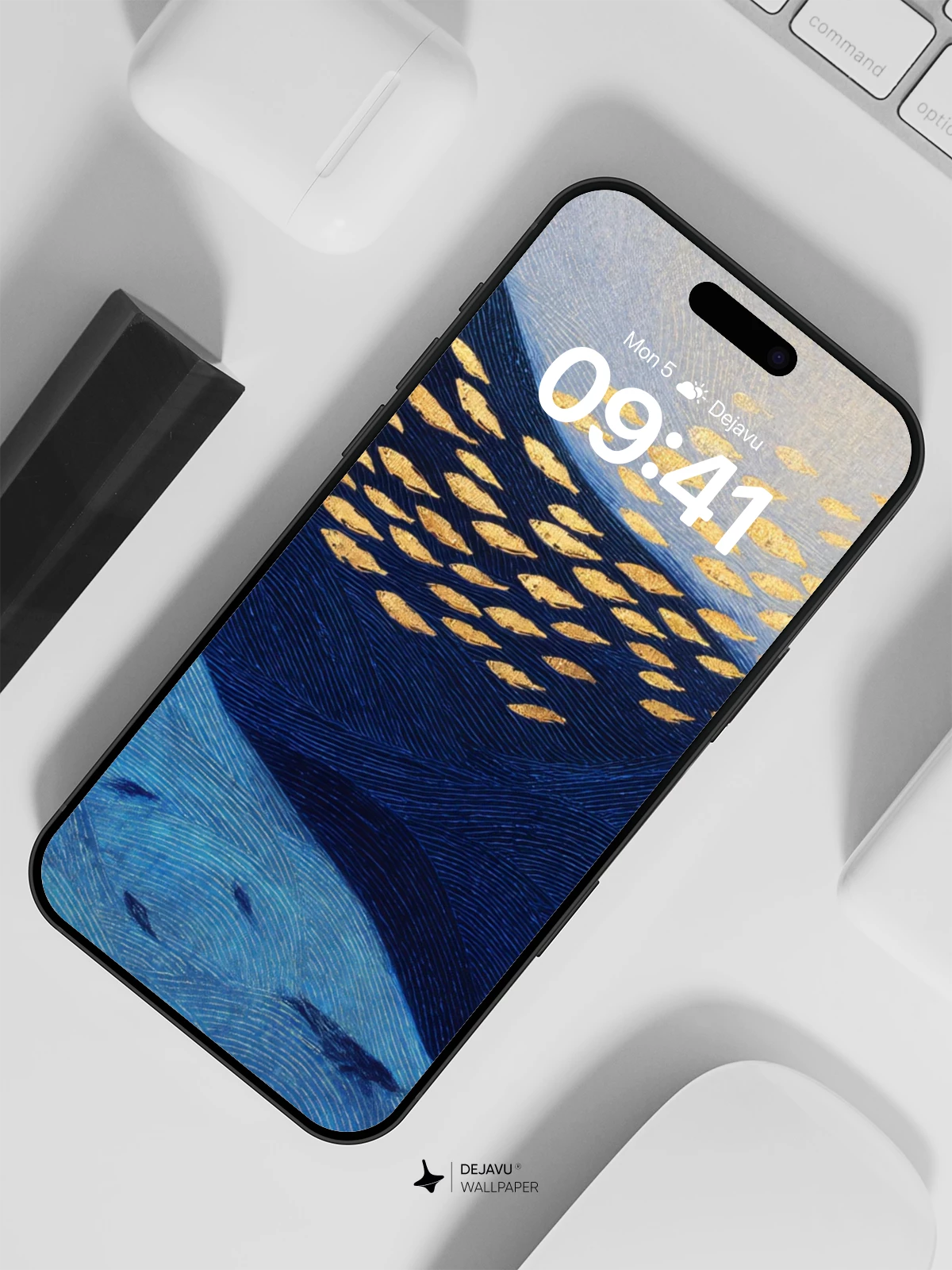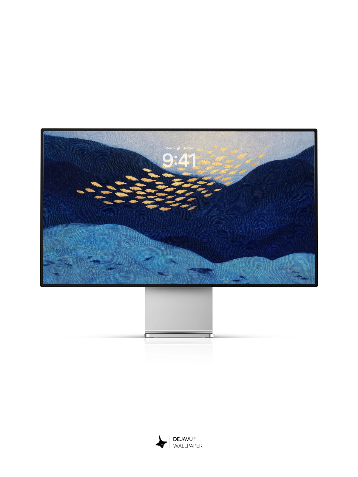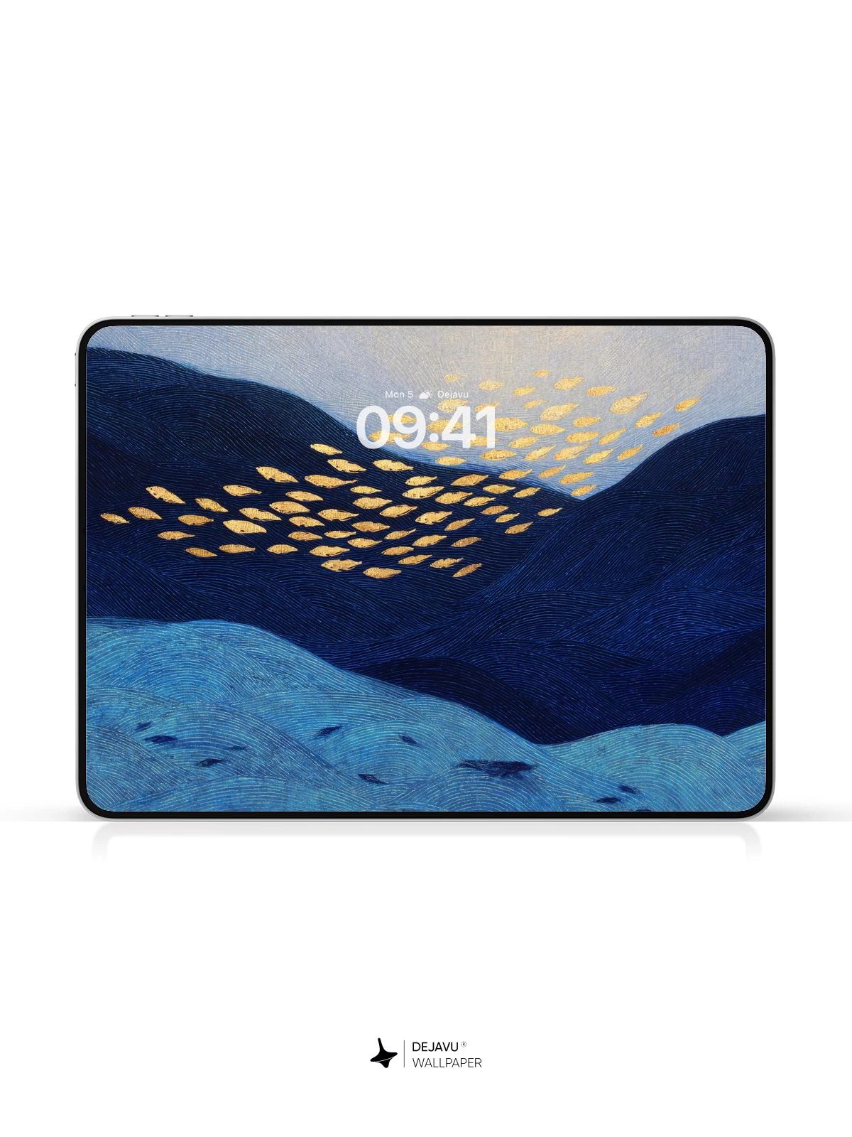 This enchanting digital artwork features a school of luminous golden fish gliding over deep blue mountain ridges under a soft twilight sky, creating a mesmerizing contrast between nature and fantasy. The ethereal glow and flowing motion evoke a sense of wonder and serenity, making it ideal as an 8K wallpaper for iPhone, Android, or tablet screens. Inspired by modern surrealism, the piece blends natural forms with magical realism, transforming a quiet landscape into a living dream.