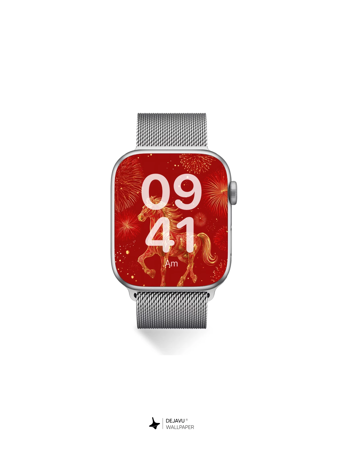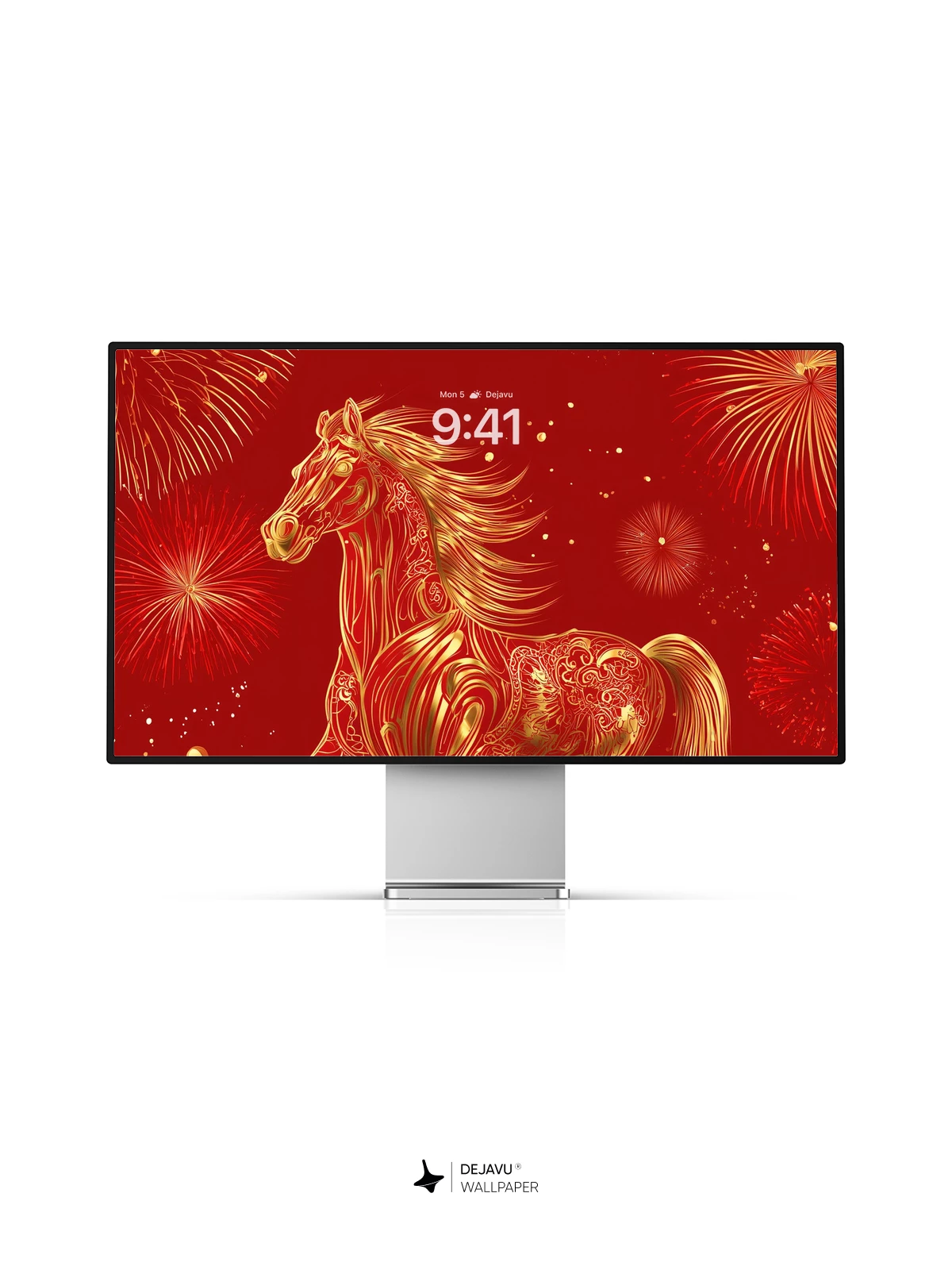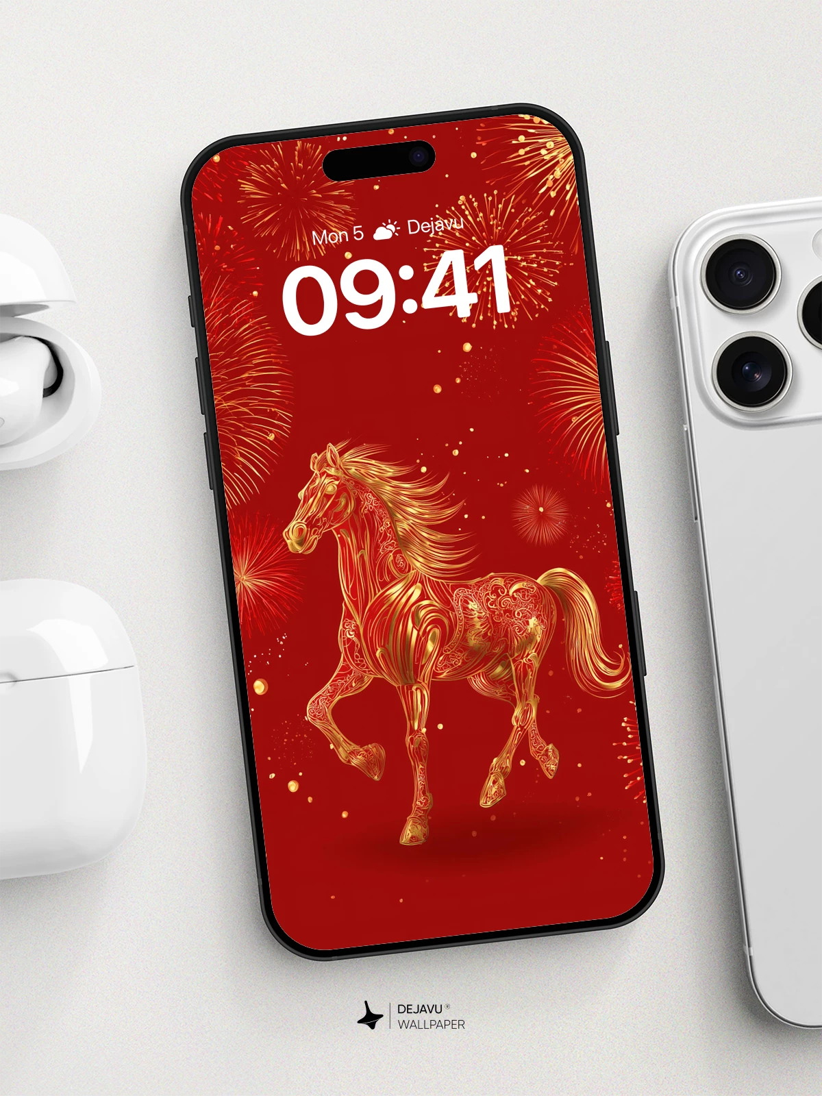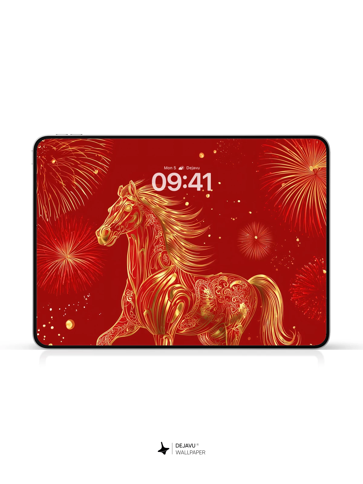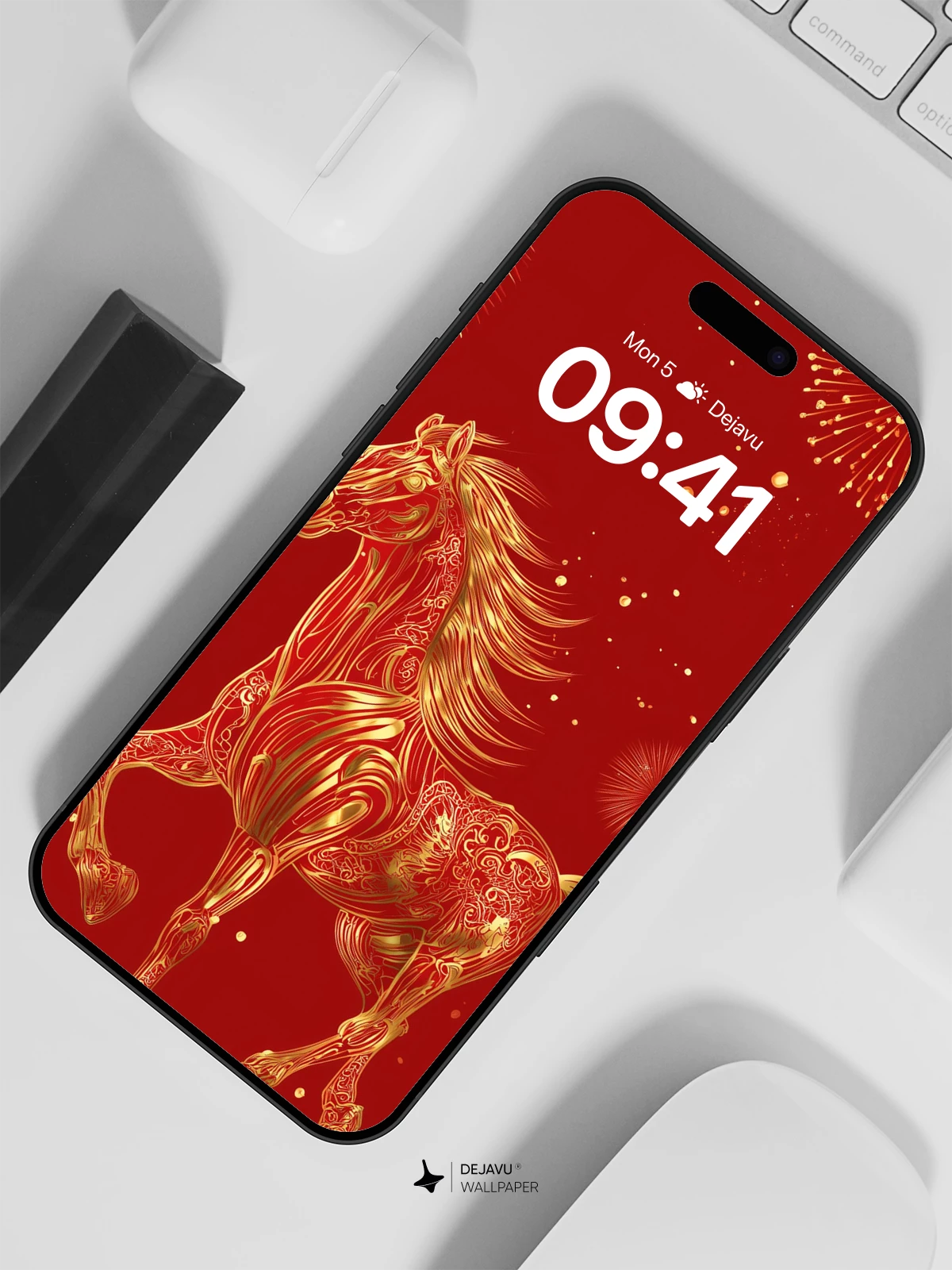 This dazzling 8K wallpaper features a beautifully detailed golden horse, adorned with intricate patterns, prancing against a rich red backdrop illuminated by radiant fireworks. Inspired by traditional Chinese art, the image captures the spirit of celebration and prosperity, making it ideal for iPhone, Android, and tablet screens. The luxurious contrast of gold and red evokes joy and energy, perfect for those who love culturally inspired, high-resolution designs.