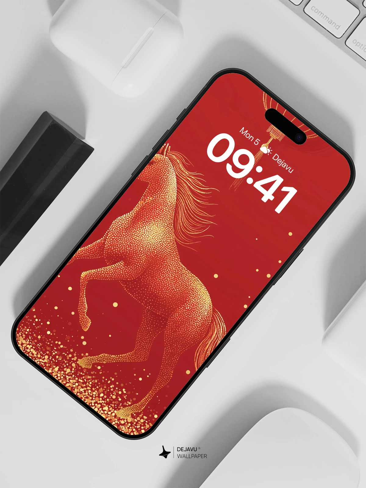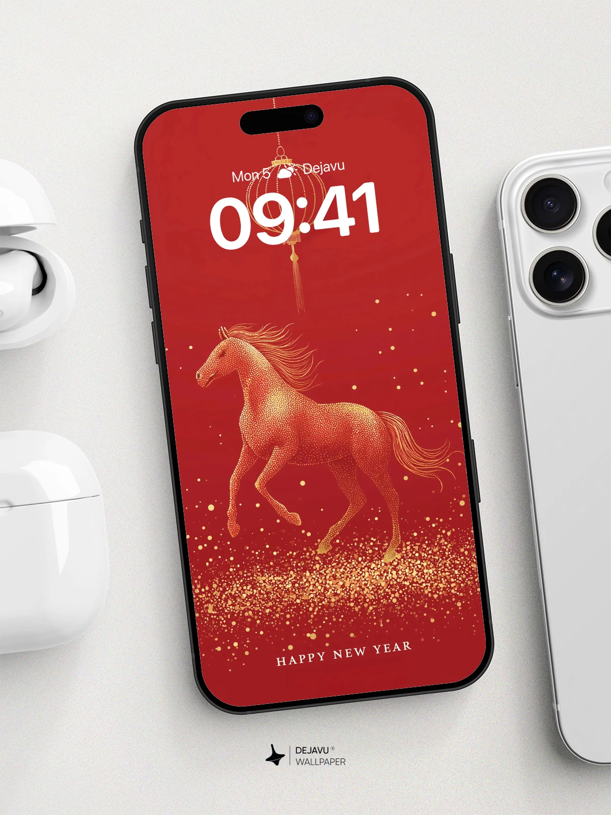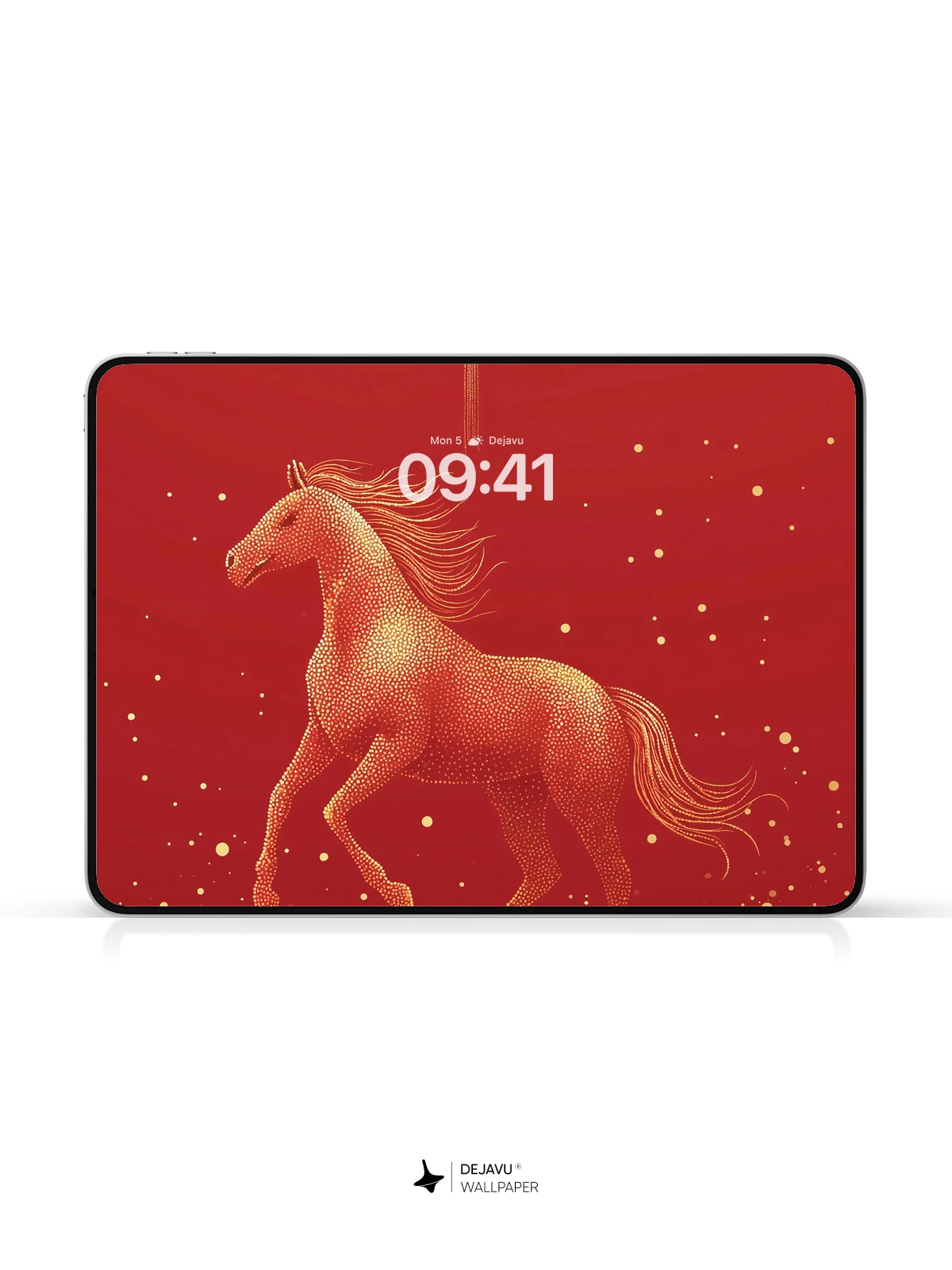 Inspired by traditional Chinese artistry, this 8K wallpaper features a majestic golden horse in mid-gallop, symbolizing strength and progress, beneath an ornate hanging lantern. Set against a deep red backdrop dotted with shimmering gold specks, the design evokes the spirit of celebration and renewal. The intricate dotwork style adds texture and depth, creating a visually rich experience ideal for iPhone, Android, and tablet devices. Perfect for those who appreciate cultural elegance and modern design harmony.