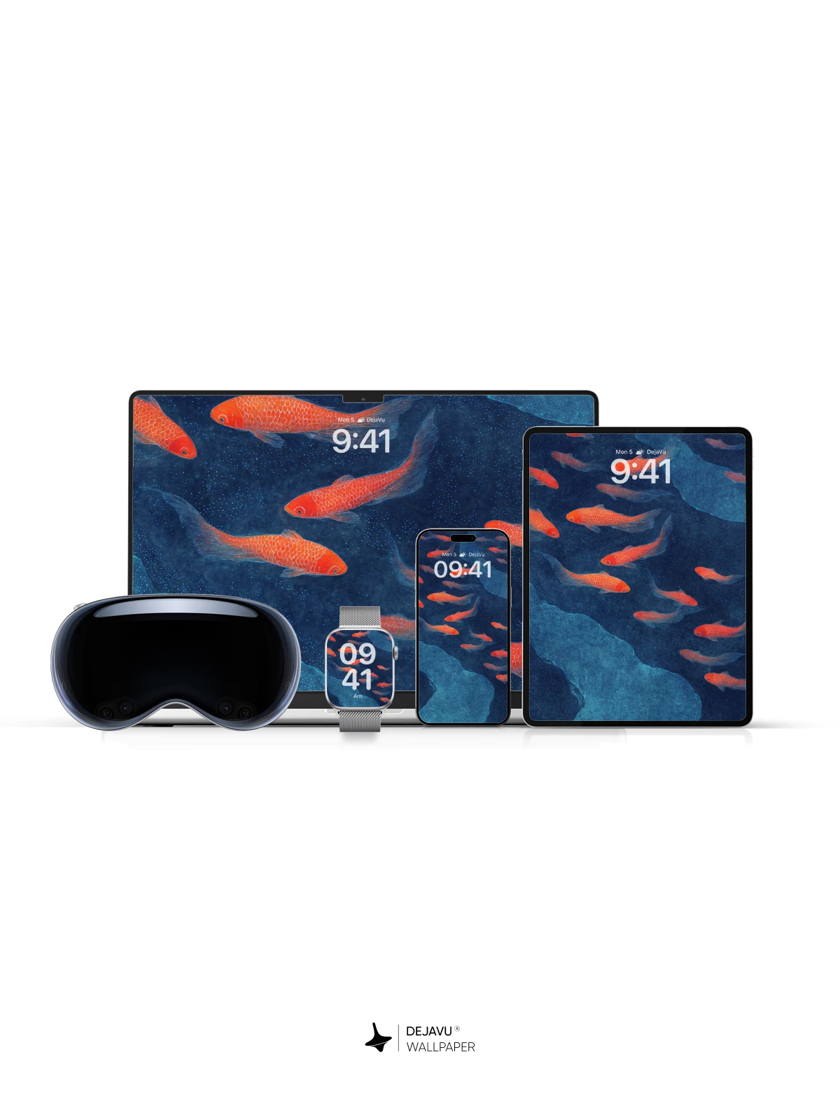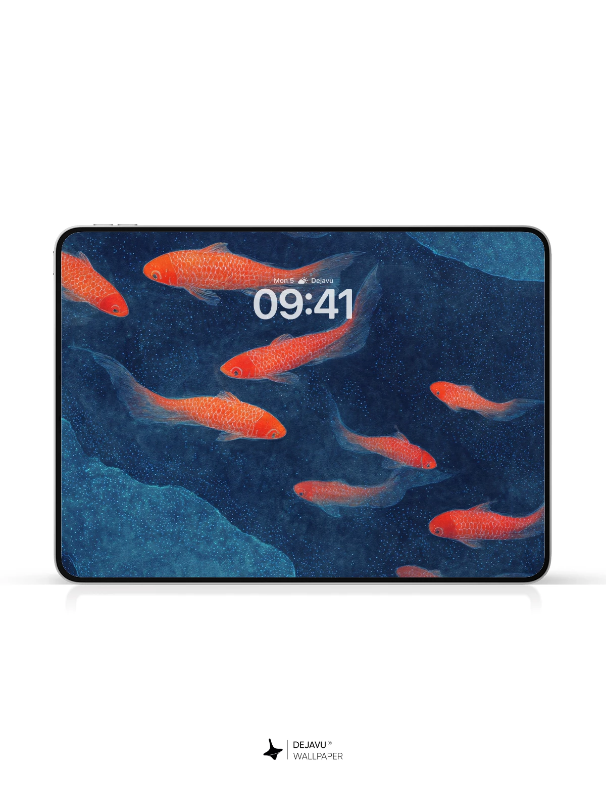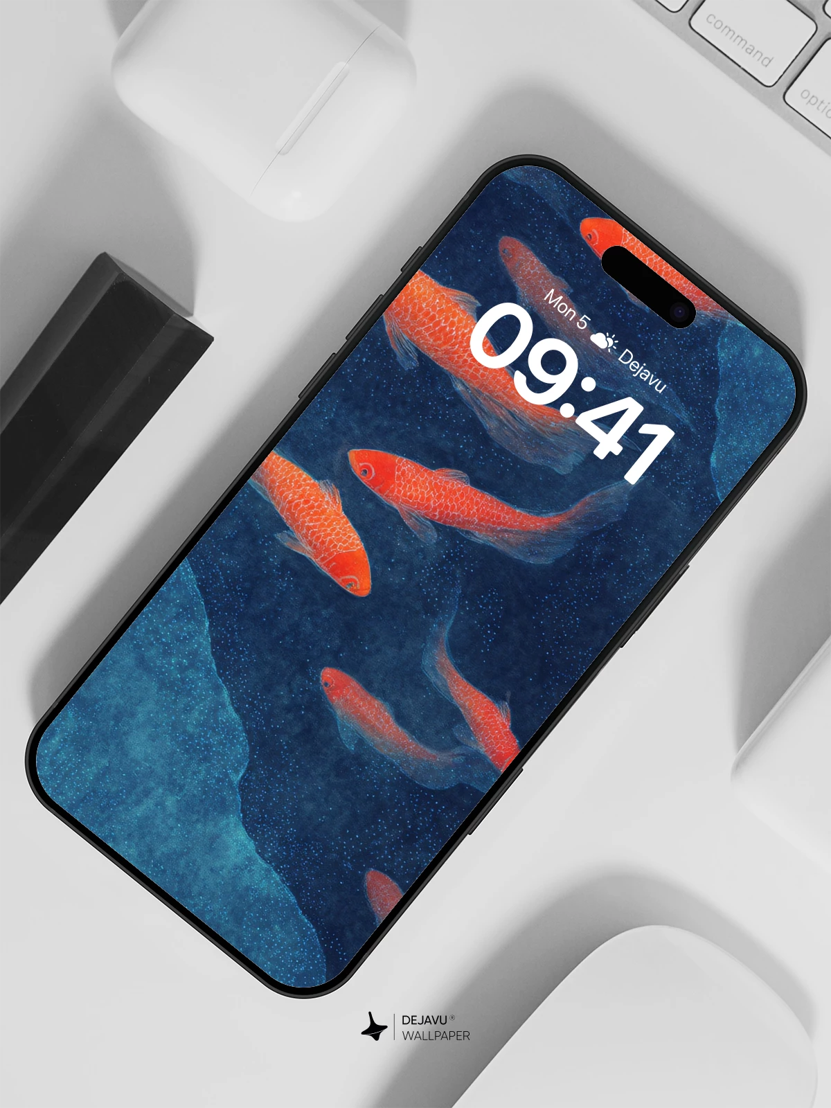A tranquil underwater scene unfolds as radiant golden koi swim gracefully through a starlit ocean abyss, their silhouettes glowing against deep indigo currents. Inspired by traditional Japanese aesthetics and modern digital artistry, this 8K wallpaper brings a sense of peace and elegance to any iPhone, Android, or tablet device. Ideal for those who appreciate nature’s quiet beauty, it transforms your screen into a meditative aquatic world.