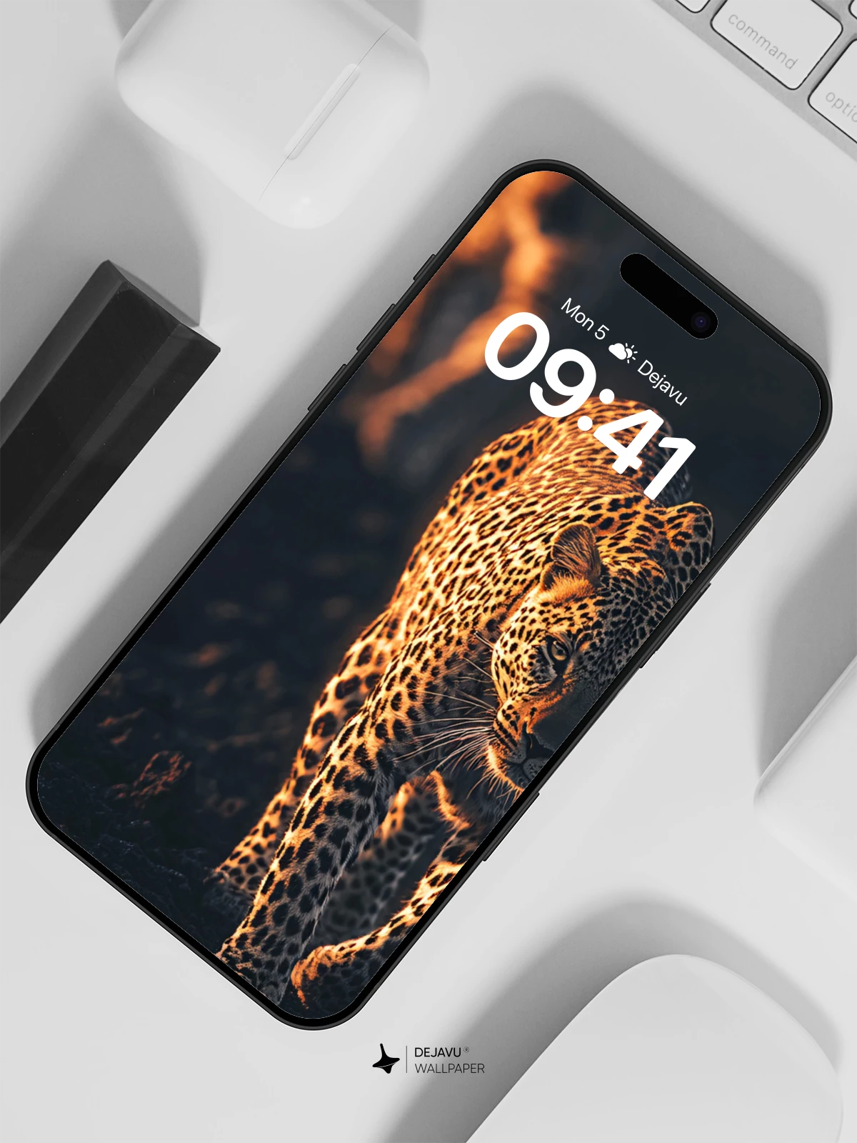 In this striking 8K wallpaper, a powerful leopard moves through shadowed terrain, bathed in the warm glow of sunrise. The contrast between the luminous fur and deep darkness evokes a sense of primal mystery and untamed beauty. Ideal for iPhone, Android, and tablets, this high-resolution image brings the raw drama of the wild to your screen with cinematic detail and immersive depth.