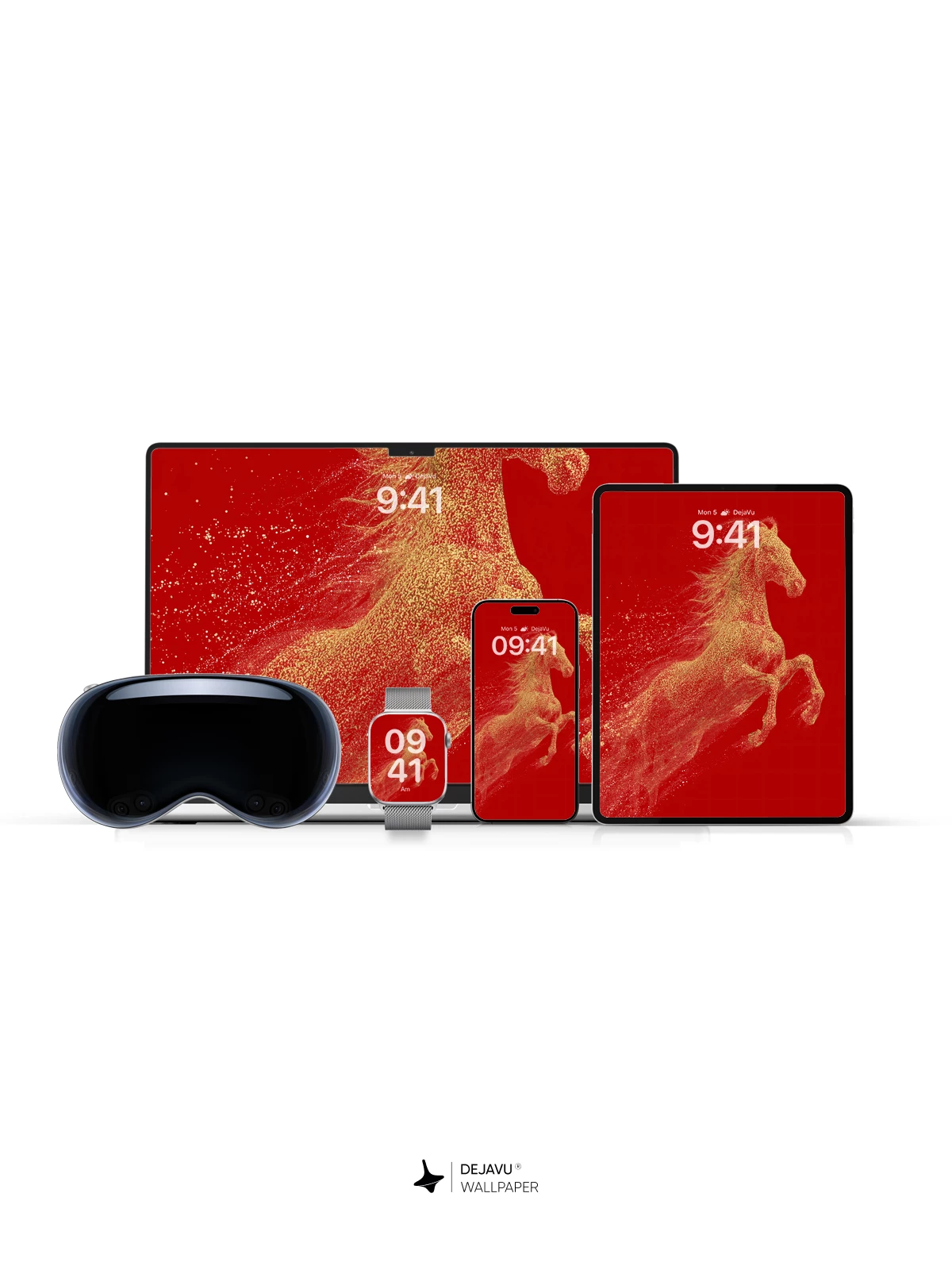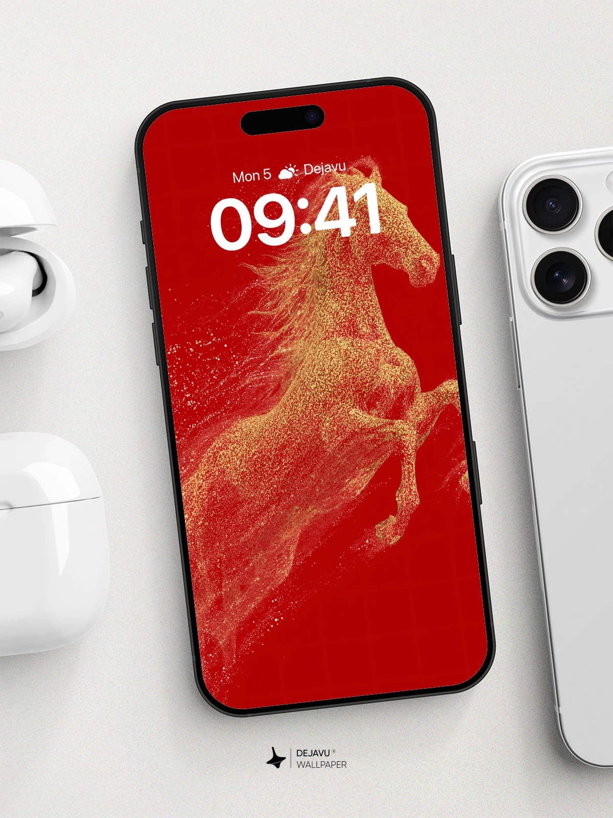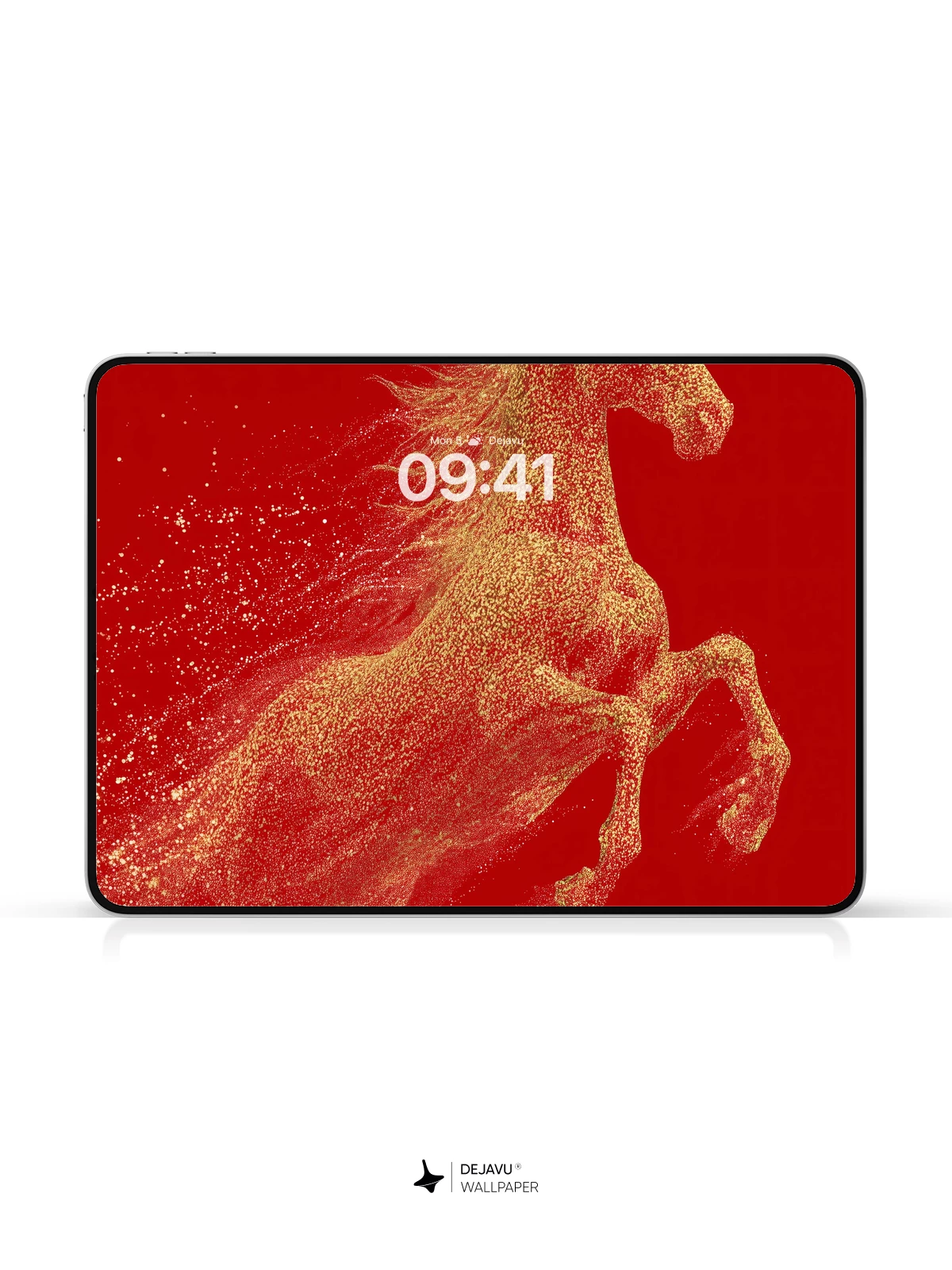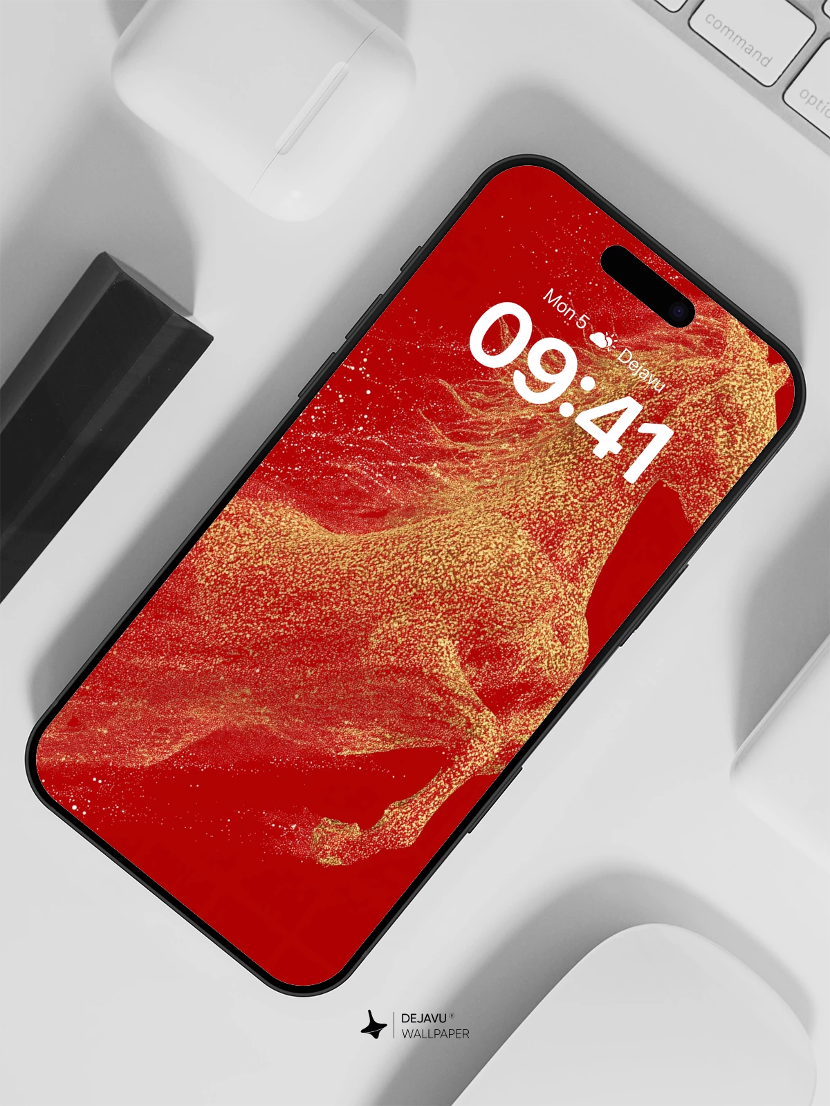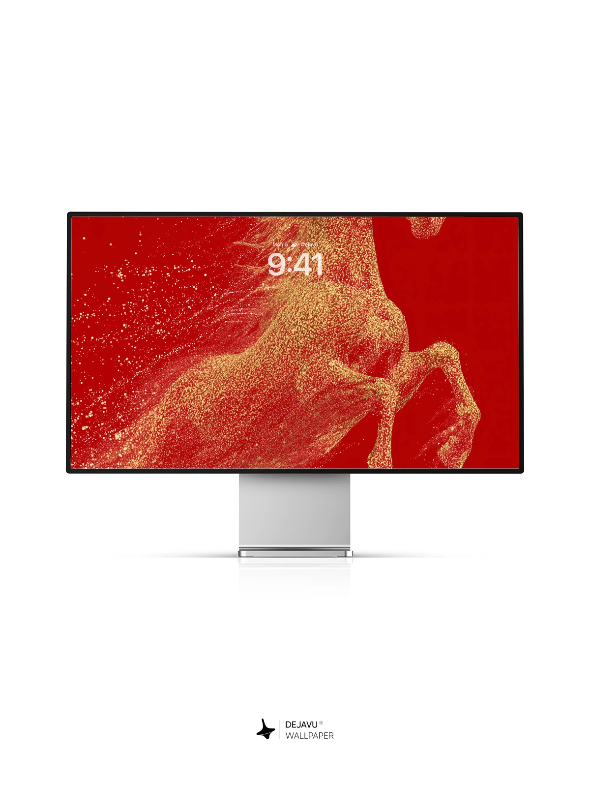 This mesmerizing 8K wallpaper features a powerful horse composed entirely of glowing golden particles, captured mid-rear in a burst of energy and elegance. Set against a vivid crimson background, the image evokes a sense of mythic strength and ethereal beauty. The particle effect creates a dreamlike, almost magical aura, making it an ideal high-resolution choice for iPhone, Android, and tablet screens. Perfect for those who appreciate digital art with a touch of fantasy and grandeur.