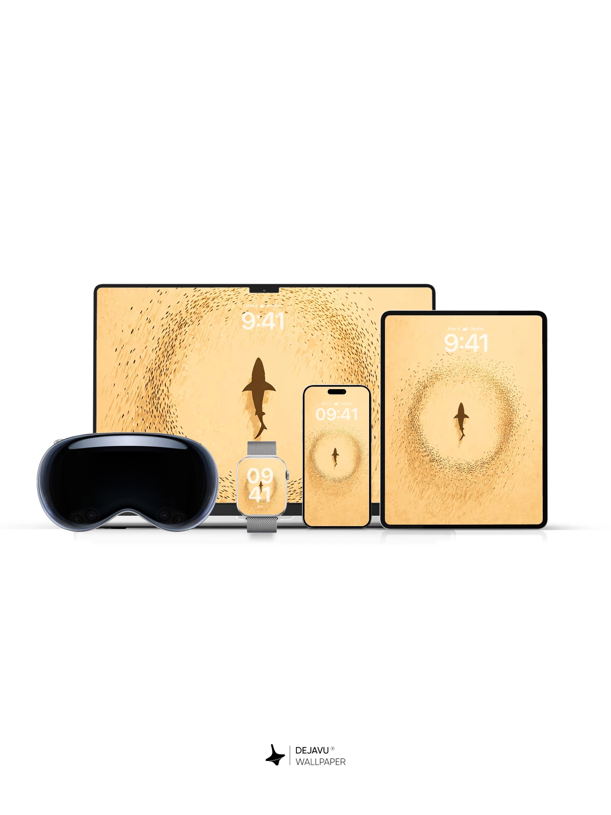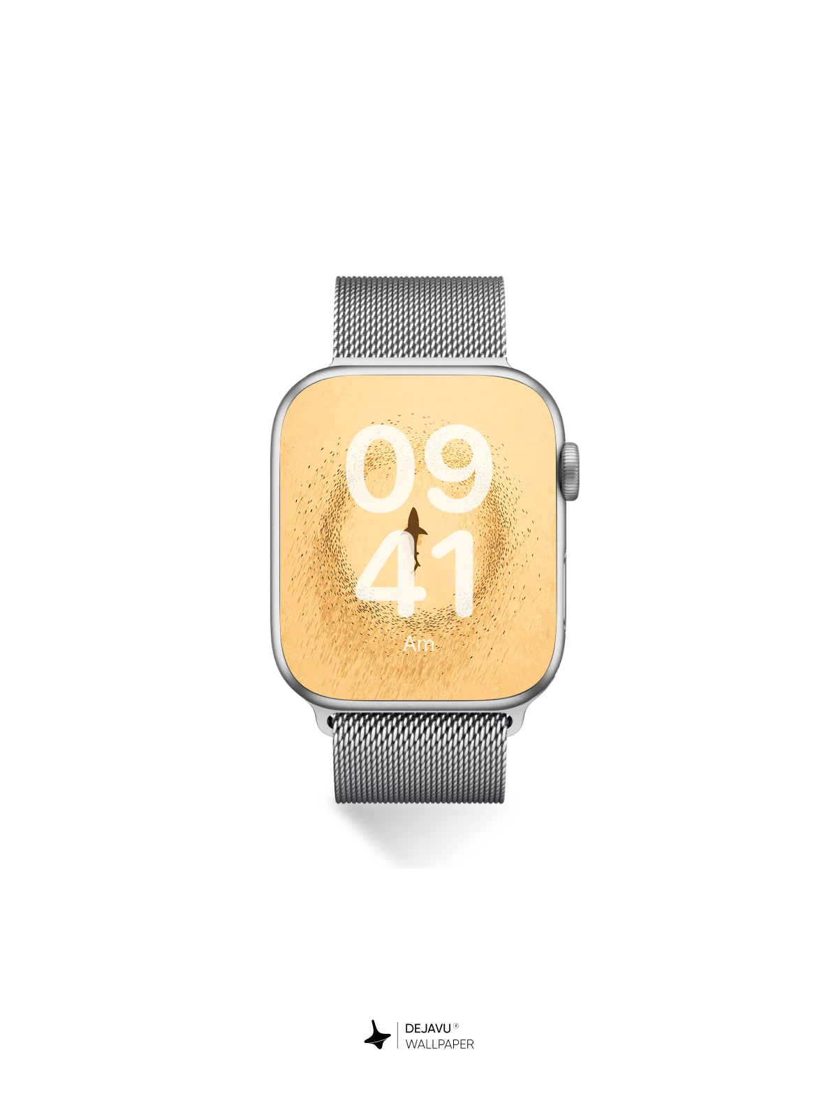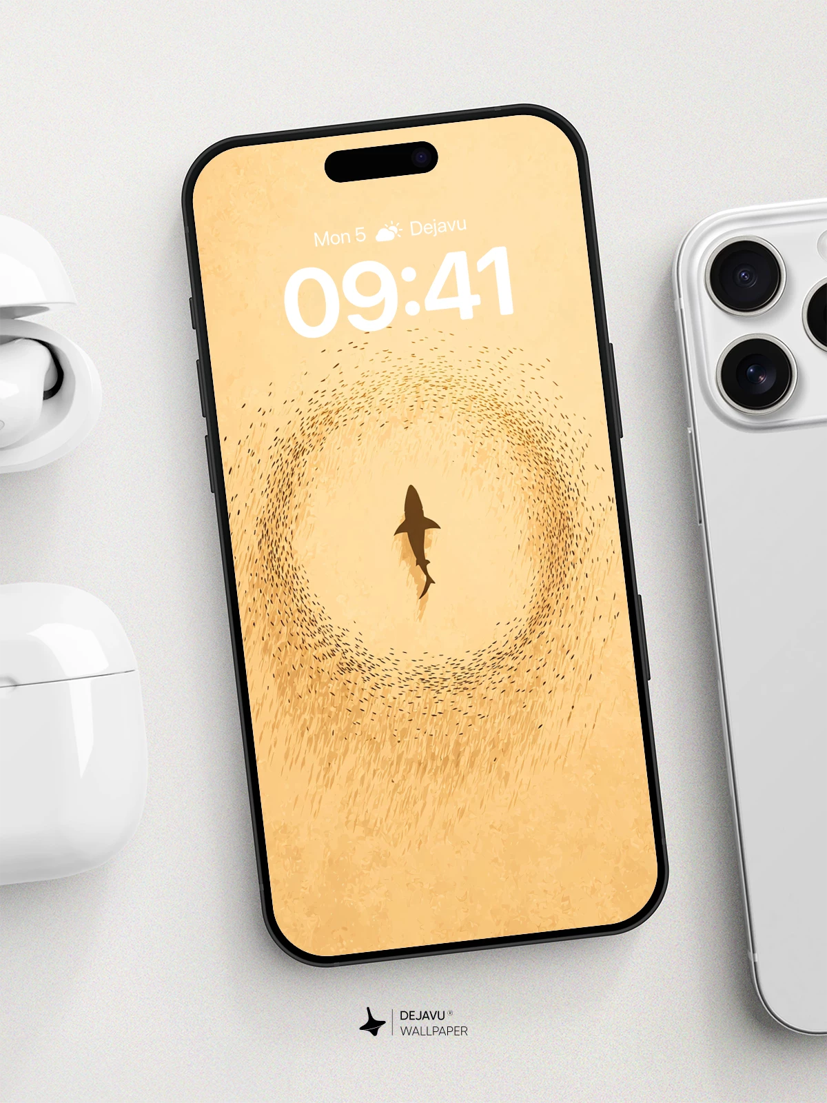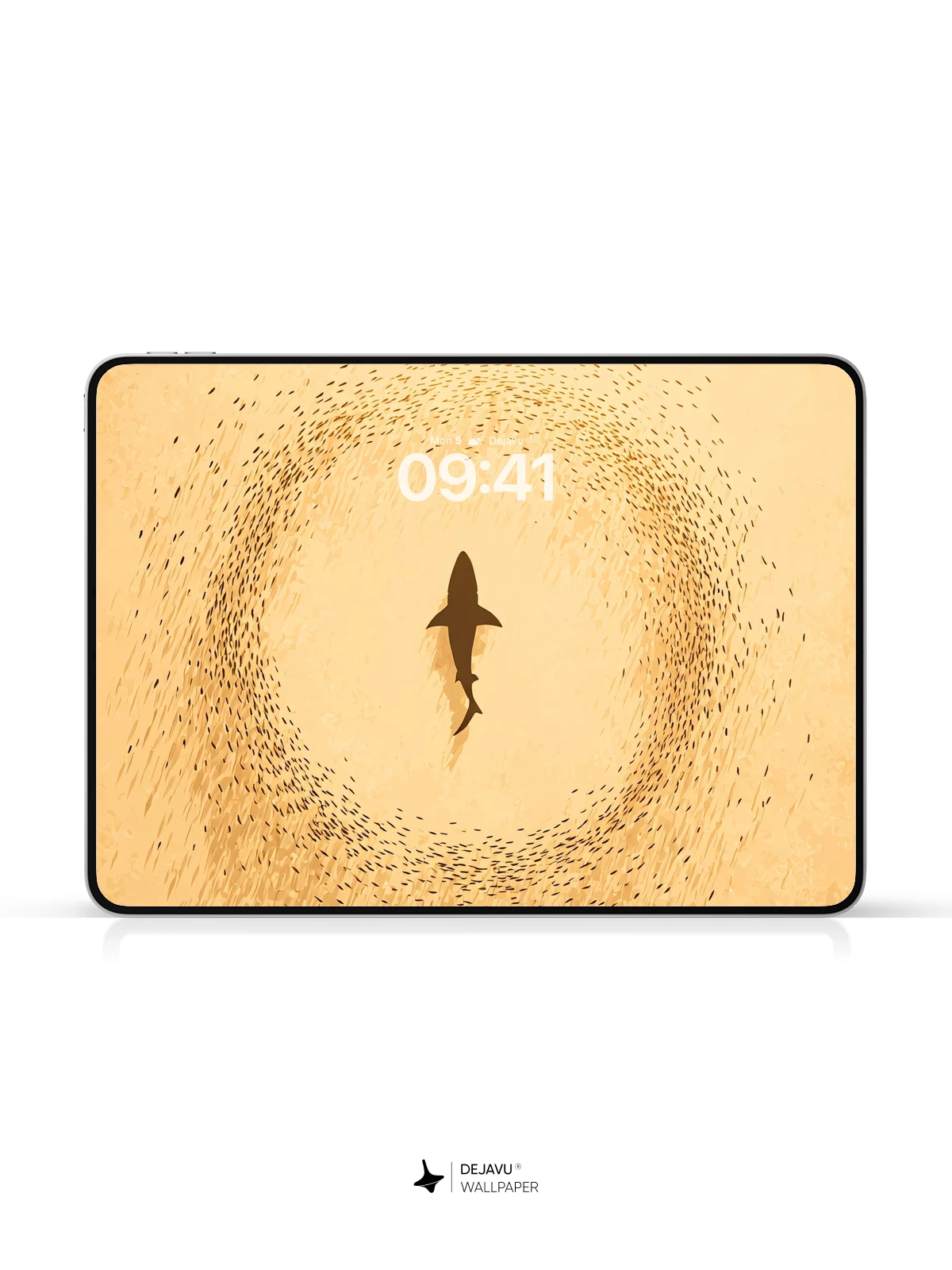 This 8K wallpaper features a solitary shark silhouette encircled by a swirling school of fish against a warm, textured gold backdrop. Its organic motion and muted palette bring calm energy to iPhone, Android, and tablet screens.