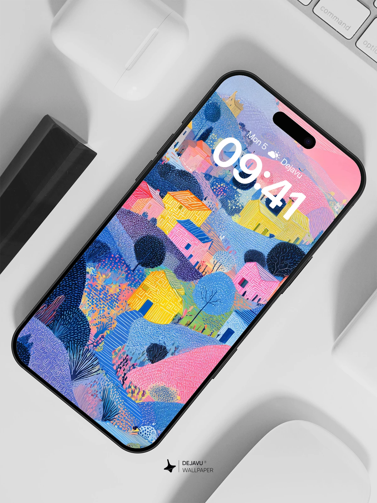 This 8K wallpaper features a charming village nestled among rolling hills, painted in soft pastel tones. The textured brushstrokes and playful composition evoke a sense of calm and wonder. Perfect for adding a touch of whimsy to your iPhone, Android, or tablet.