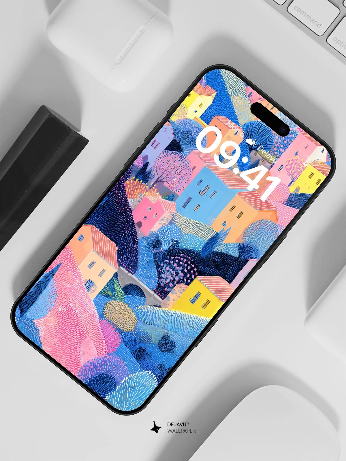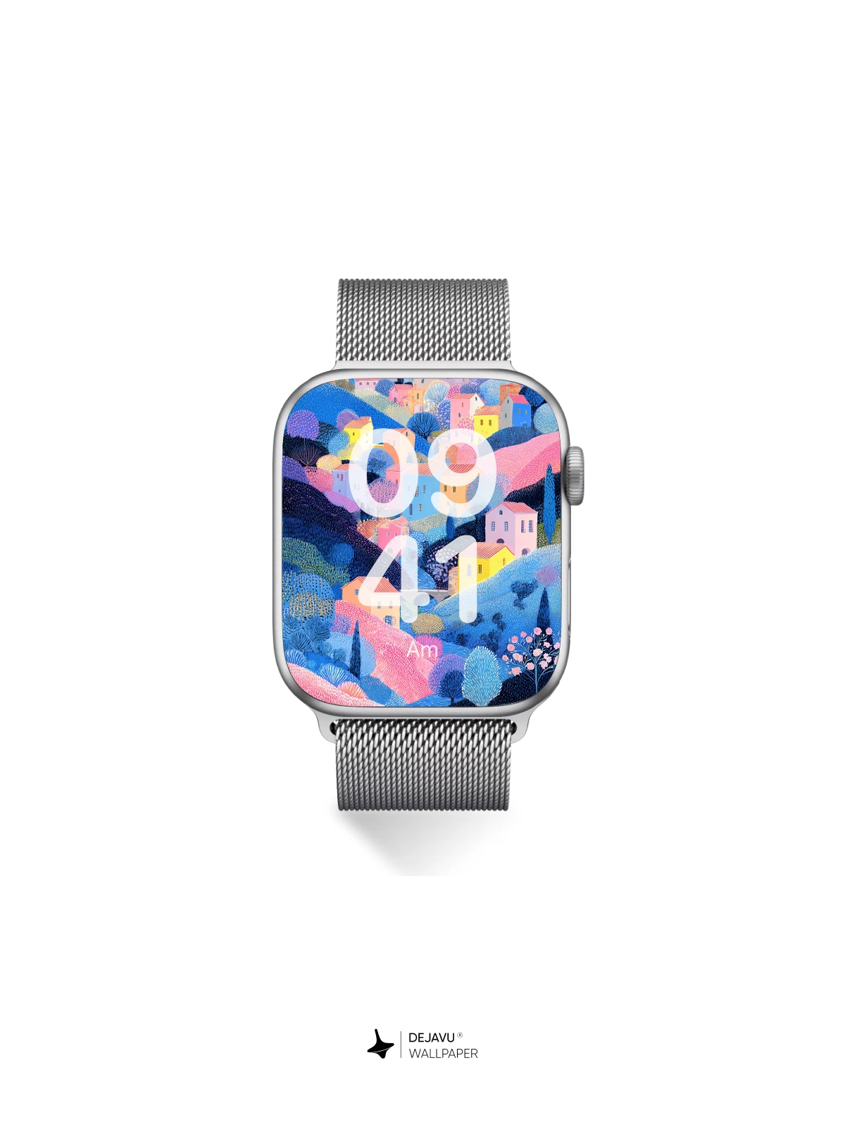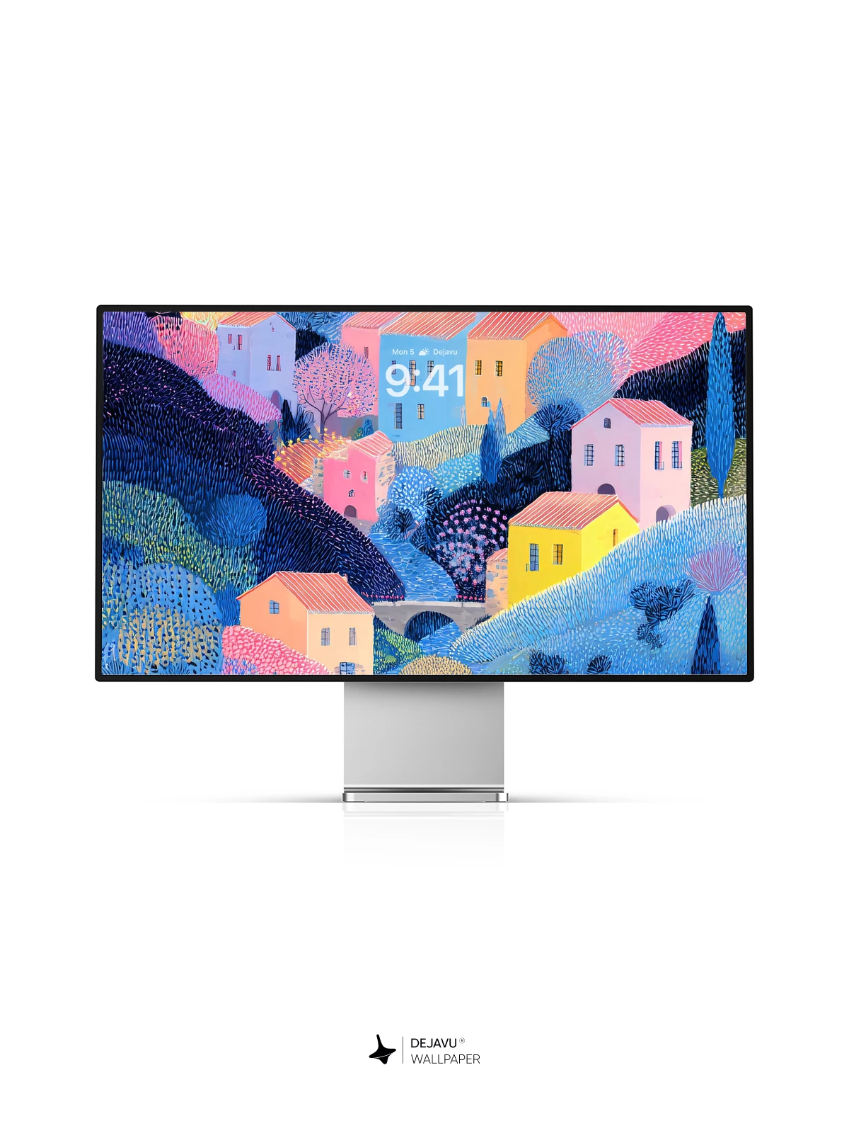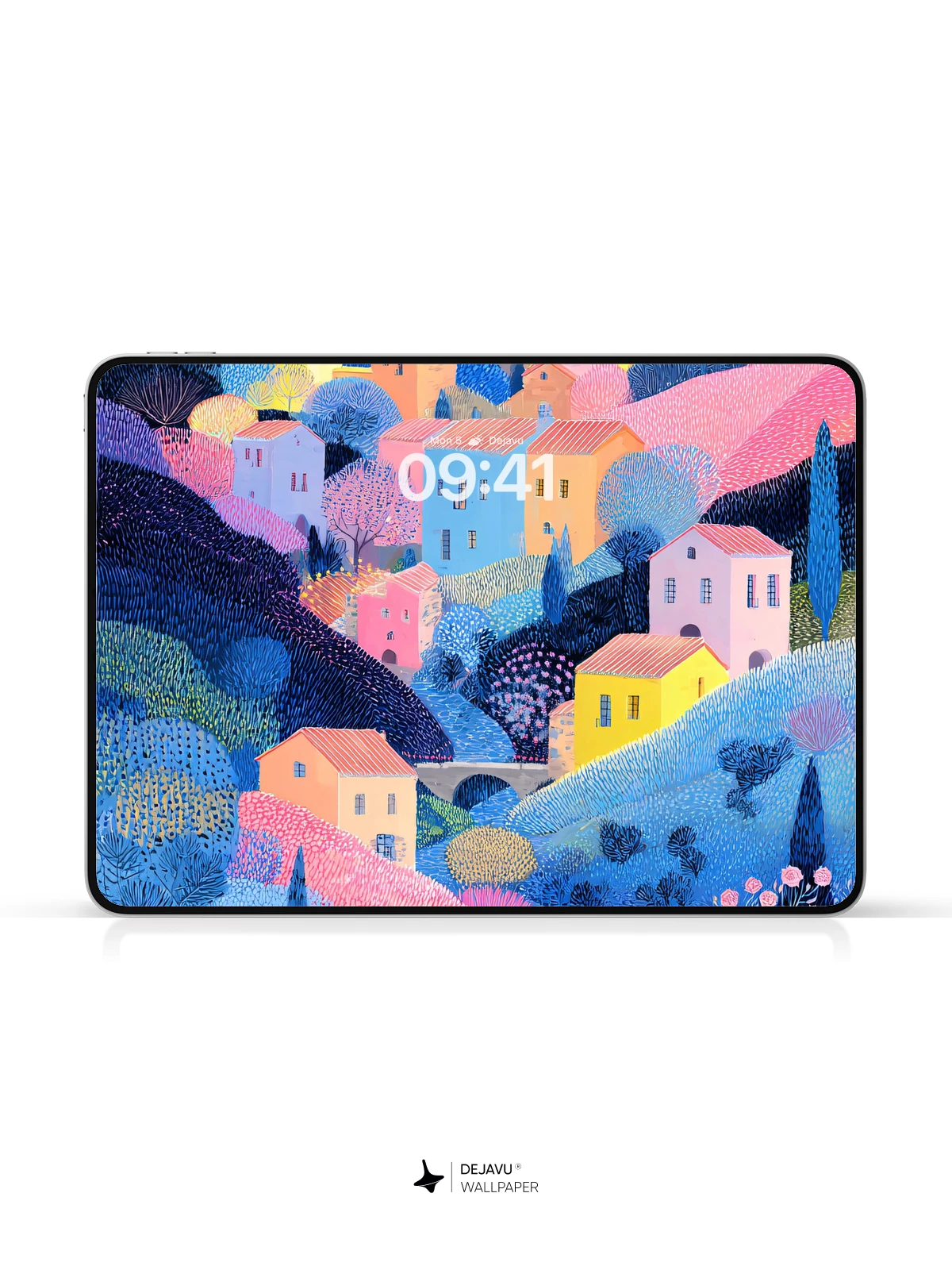 This 8K wallpaper features a stylized village climbing a hillside, rendered in a textured, dotted style. The soft pinks, blues, and yellows create a gentle, storybook atmosphere. The high-resolution detail ensures the unique texture looks crisp on iPhone, Android, and tablet displays.