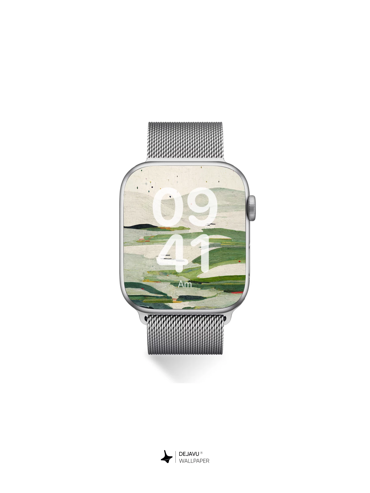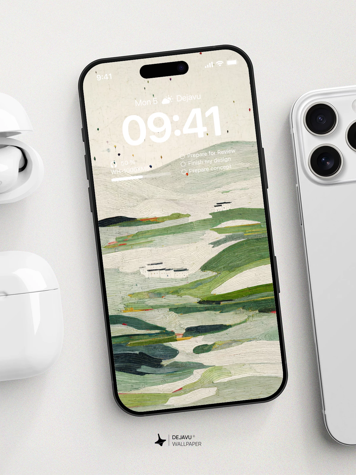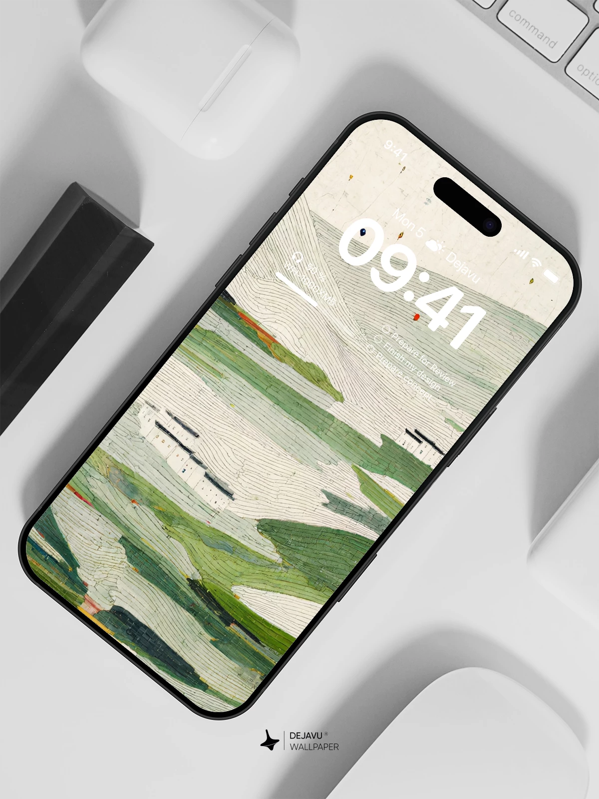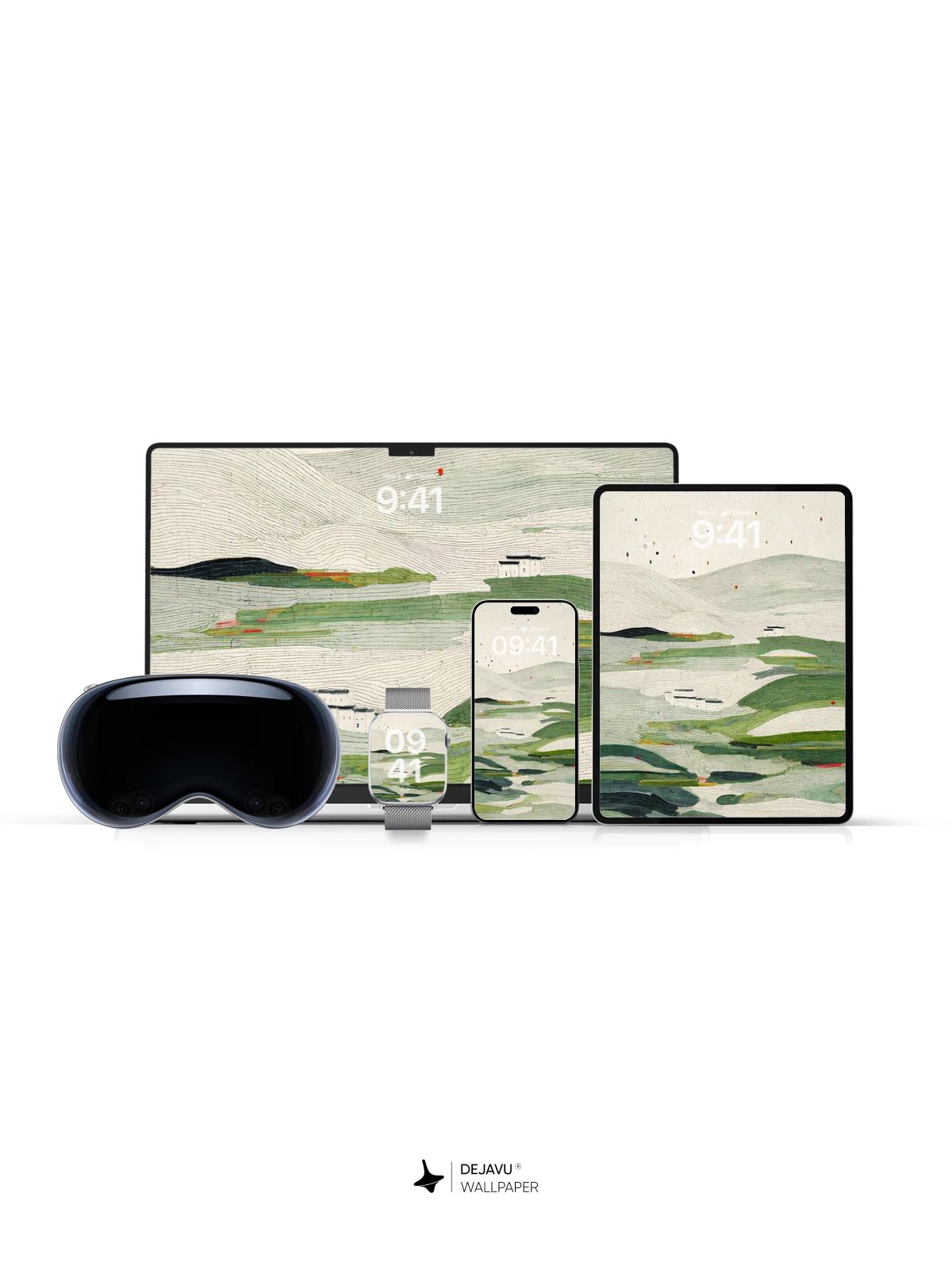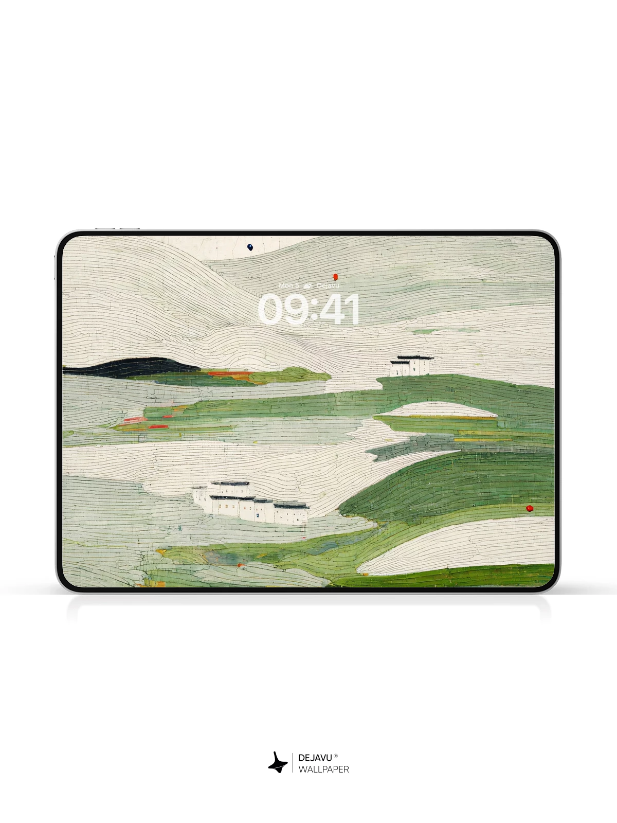 This wallpaper features a tranquil, layered landscape of soft green hills and scattered floating dots, creating a peaceful, almost meditative vibe. The gentle curves and muted tones make it a perfect fit for iPhones, Androids, and tablets seeking a calming aesthetic.