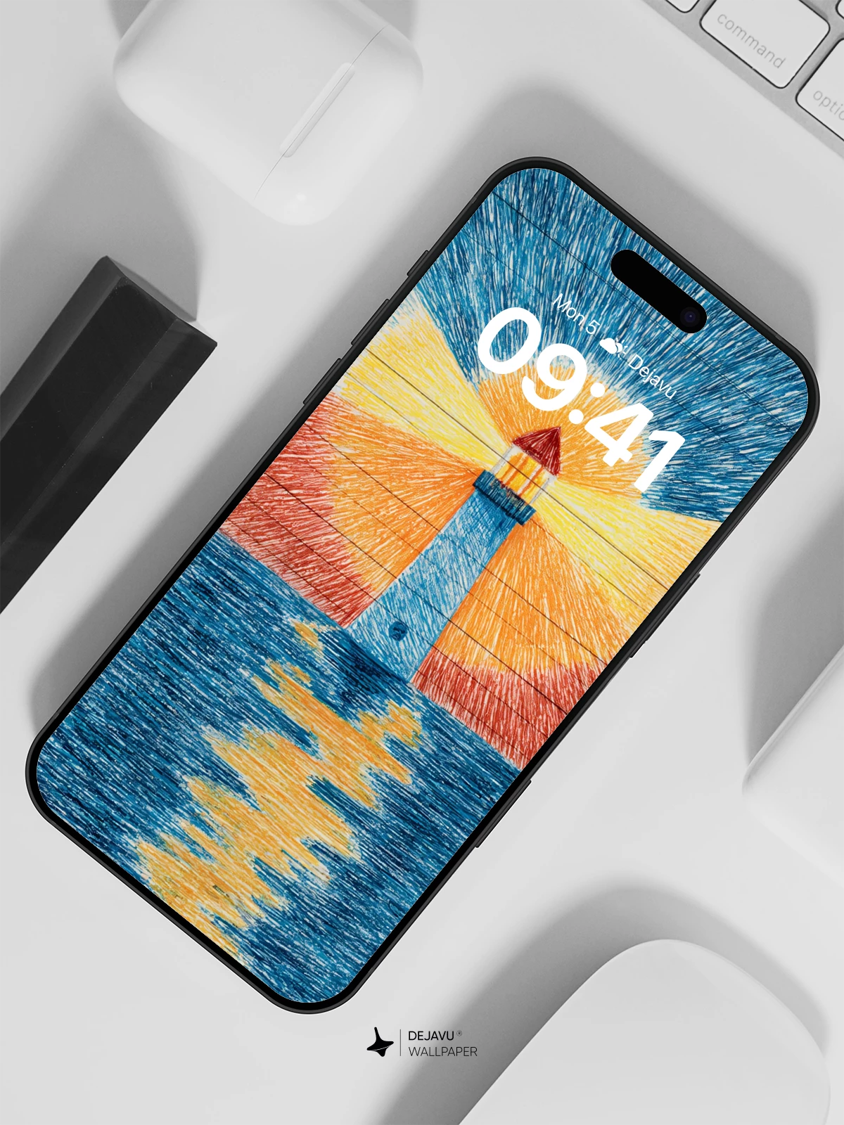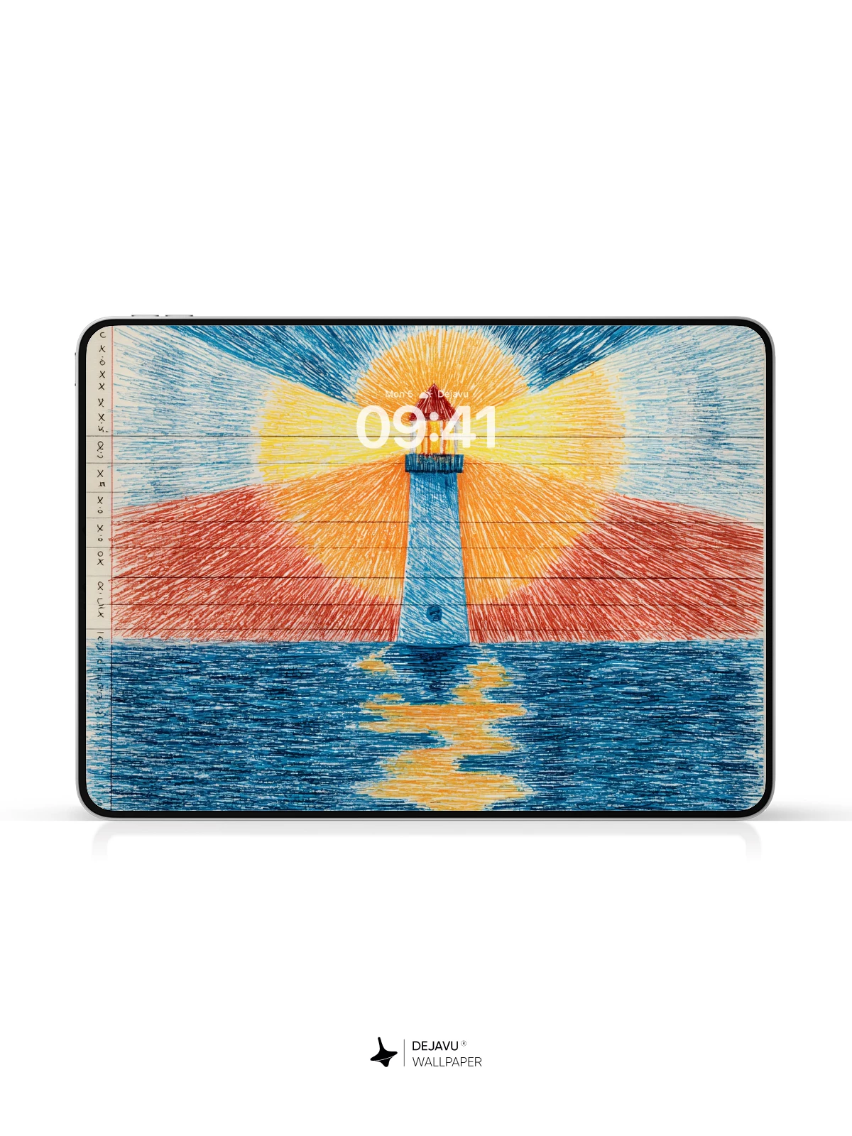 Inspired by the serene beauty of coastal sunsets, this 8K wallpaper captures a lighthouse standing tall as rays burst from its lantern, painting the sky in warm hues. The meticulous crayon-like texture adds depth and warmth, making it ideal for iPhone, Android, and tablet screens. Evoking peace and timeless wonder, this digital artwork transforms your device into a window to tranquility.