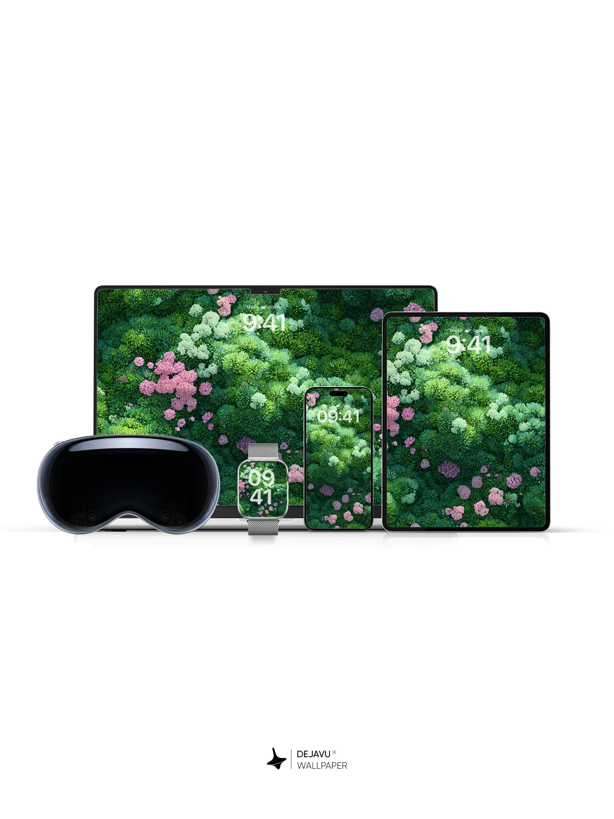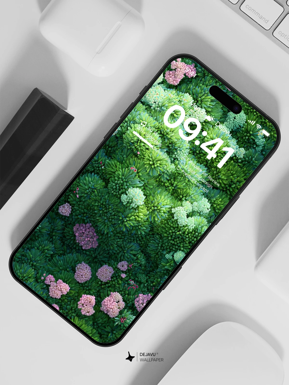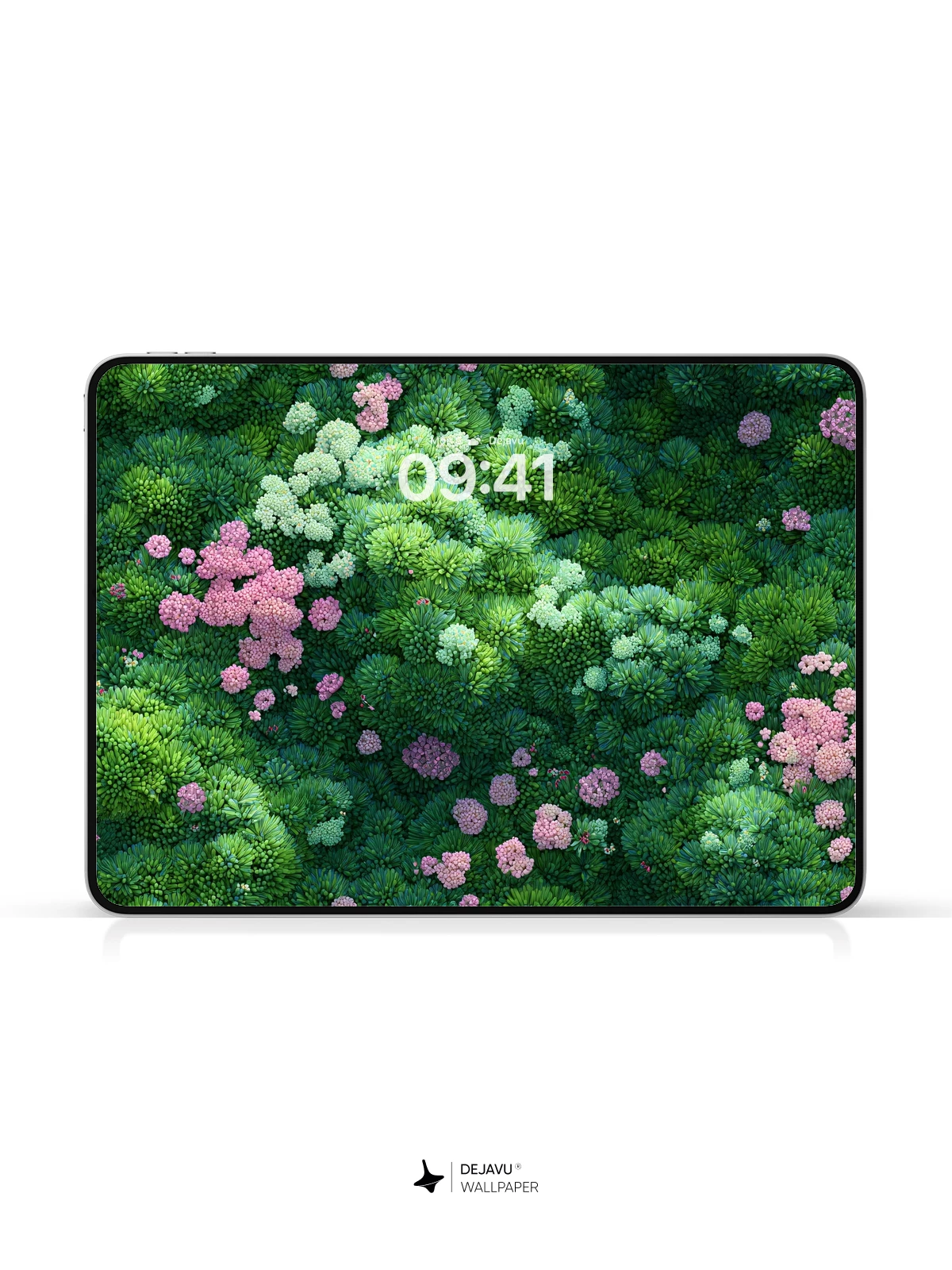 This 8K wallpaper captures a serene garden scene with a rich tapestry of green leaves and soft pink flowers. The detailed texture and natural color palette evoke a sense of calm and tranquility, making it an ideal choice for both iPhone and Android devices. The high resolution ensures that every petal and leaf is vividly rendered, bringing a piece of nature to your digital space.