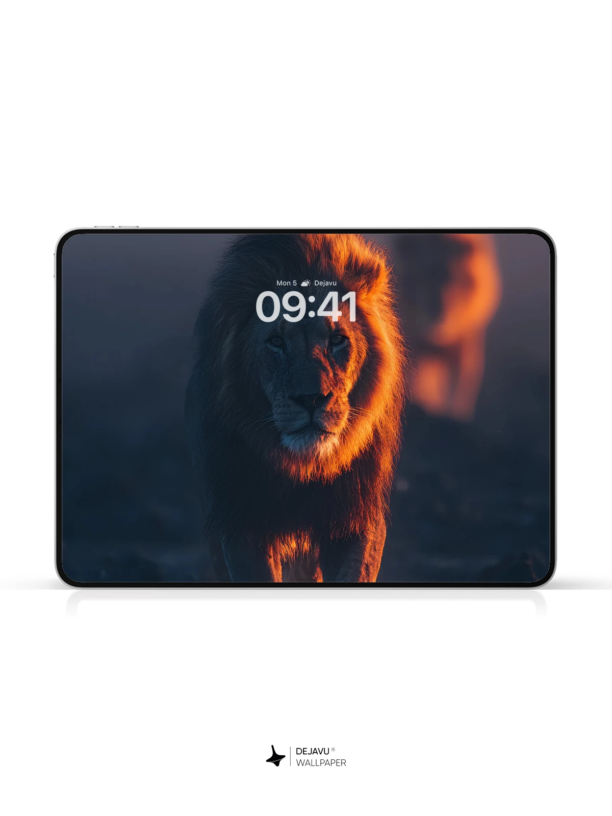 Bathed in the warm glow of sunrise, a majestic male lion moves with quiet authority across the savanna, his mane illuminated like fire against the cool twilight sky. A second lion fades into the misty background, adding depth and mystery to this breathtaking scene. This high-resolution 8K wallpaper captures the raw beauty and power of nature, evoking a sense of wild freedom and timeless strength. Ideal for iPhone, Android, and tablets, it transforms any device into a portal to the African wilderness.