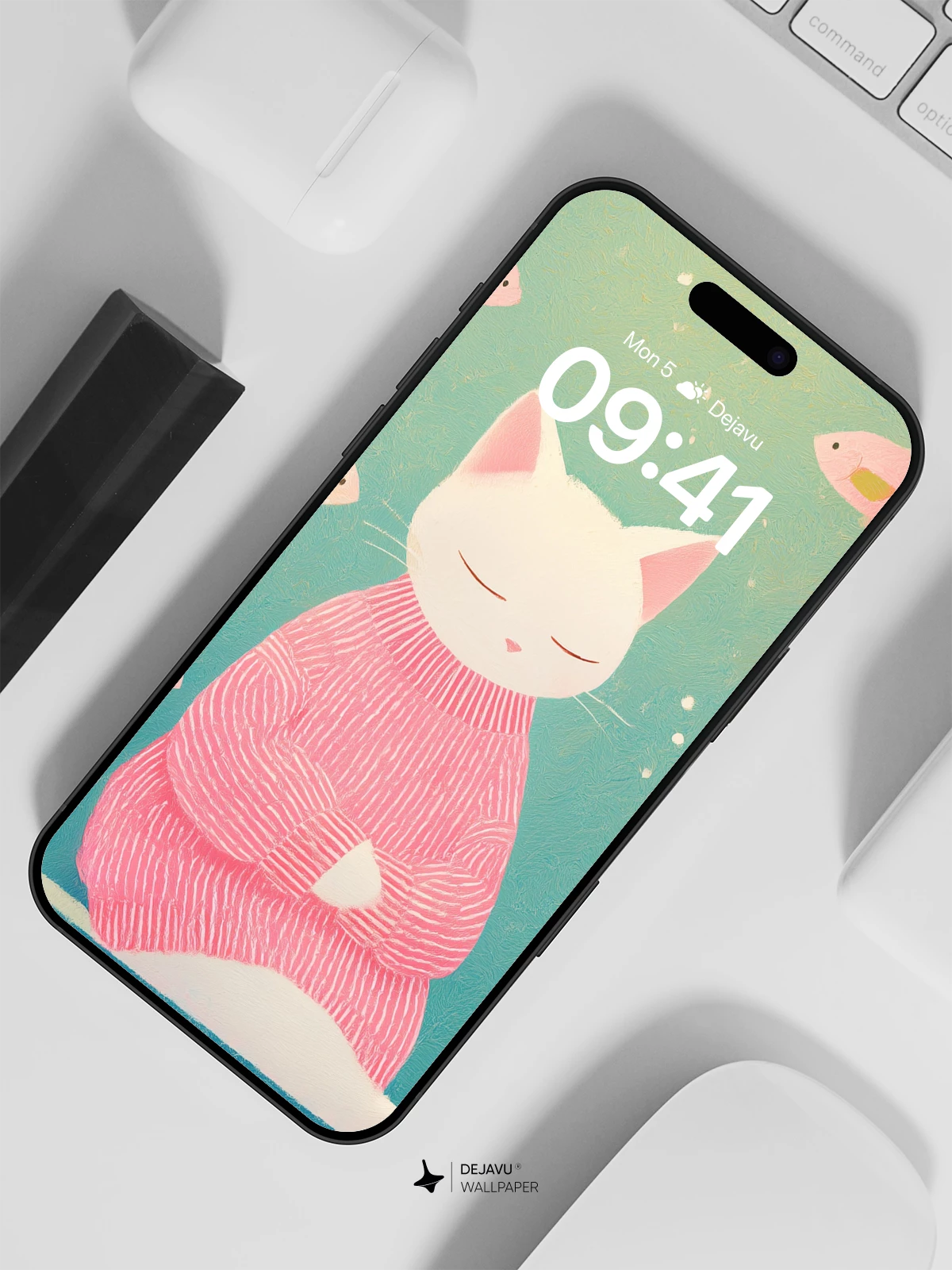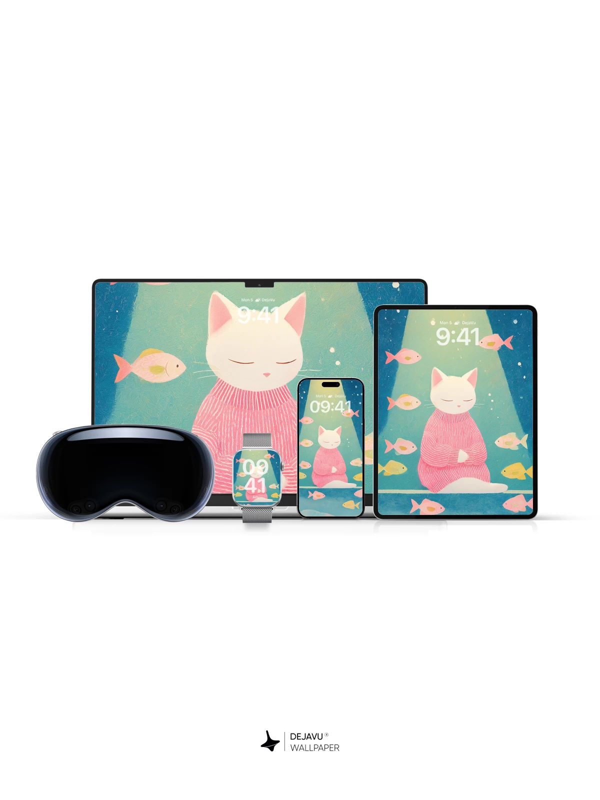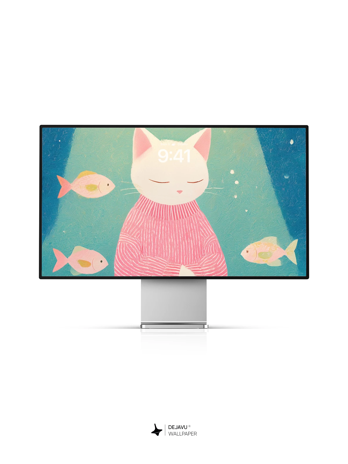 This whimsical and surreal illustration features a meditative white cat wrapped in a soft pink sweater, glowing under a radiant beam of light beneath the sea. Surrounded by gentle swarms of pastel-colored fish, the scene evokes calmness and wonder, blending fantasy with peaceful emotion. The dreamlike underwater atmosphere, painted in delicate hues of blue and teal, creates a tranquil escape ideal for any phone or tablet screen. Whether you’re an iPhone or Android user, this 8K wallpaper brings a touch of quiet magic to your device.