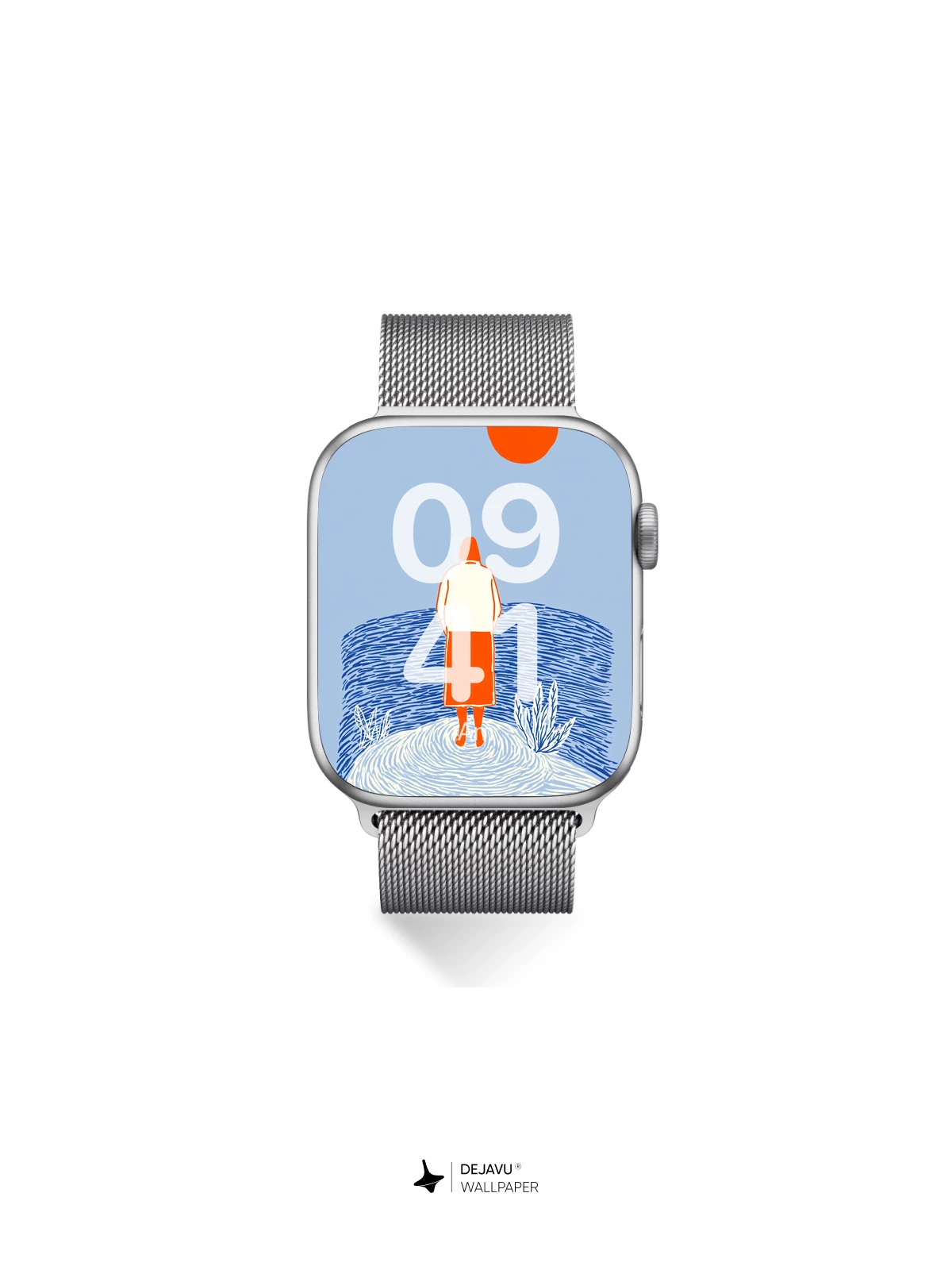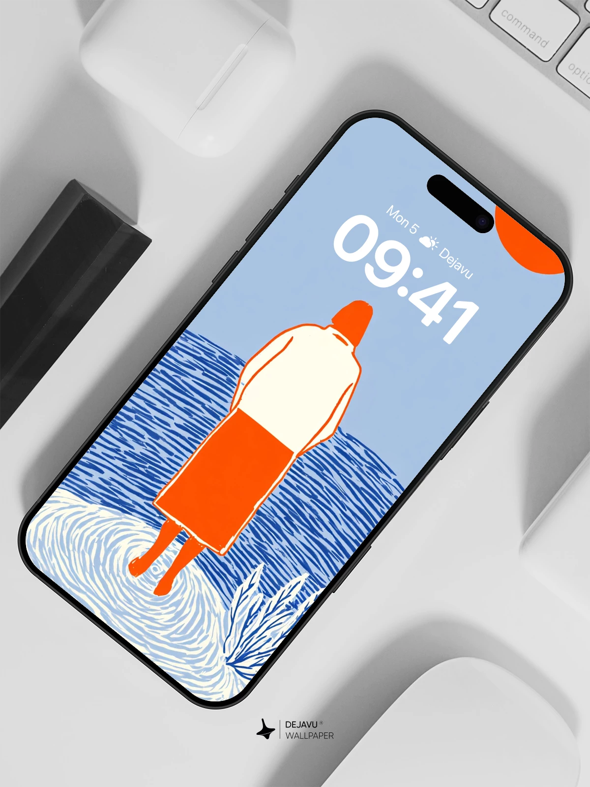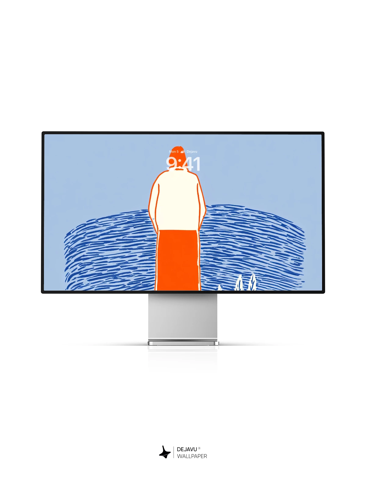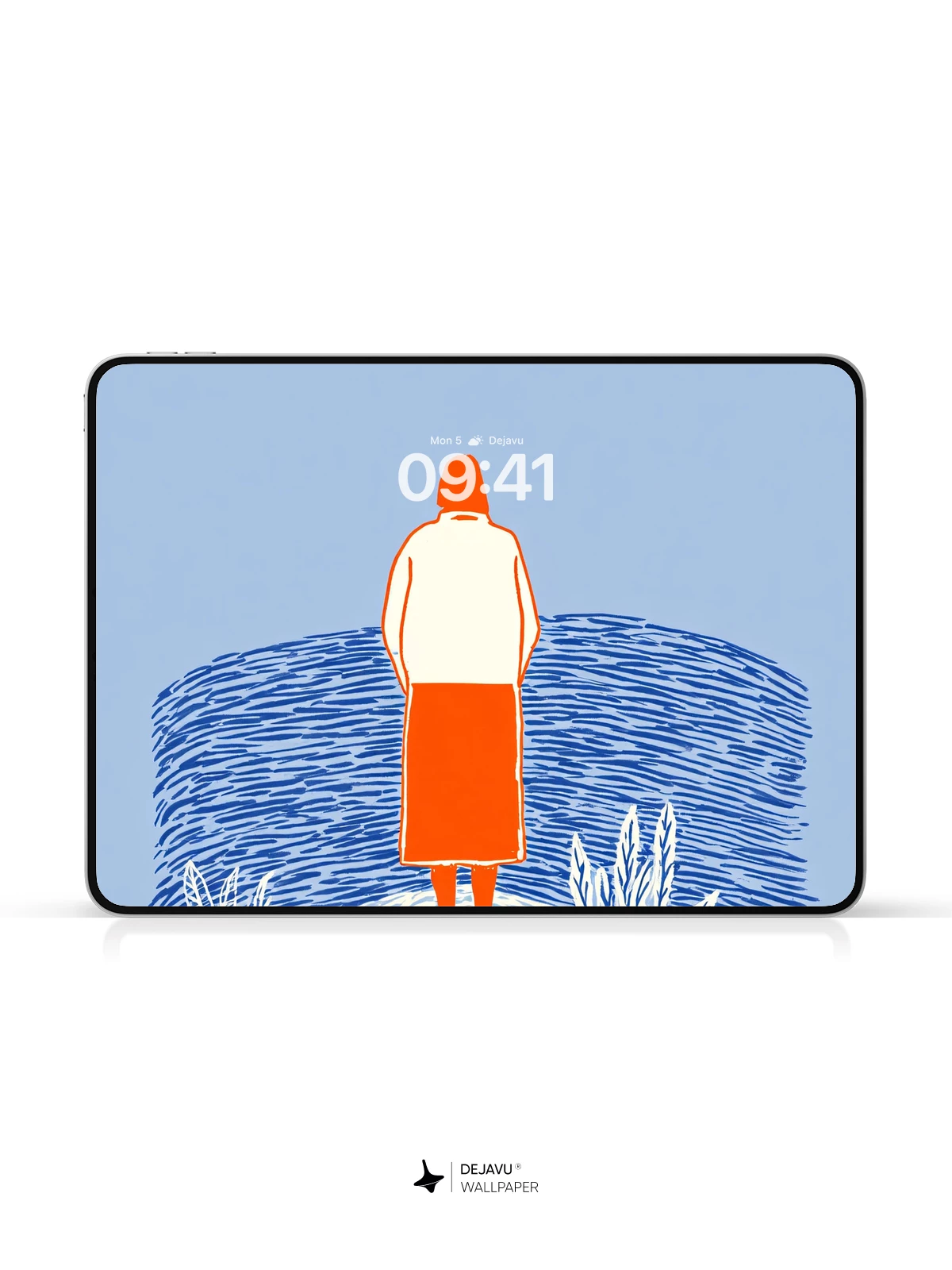 This evocative artwork captures solitude and contemplation through a minimalist lens, featuring a solitary figure facing the vastness of a rippling sea beneath a striking orange sun. The stylized lines and flat color palette echo modern graphic design sensibilities, reminiscent of contemporary illustrators like Maira Kalman in their use of narrative stillness. Ideal as an 8K wallpaper for iPhone, Android, or tablets, it brings a peaceful, introspective mood to any device screen.