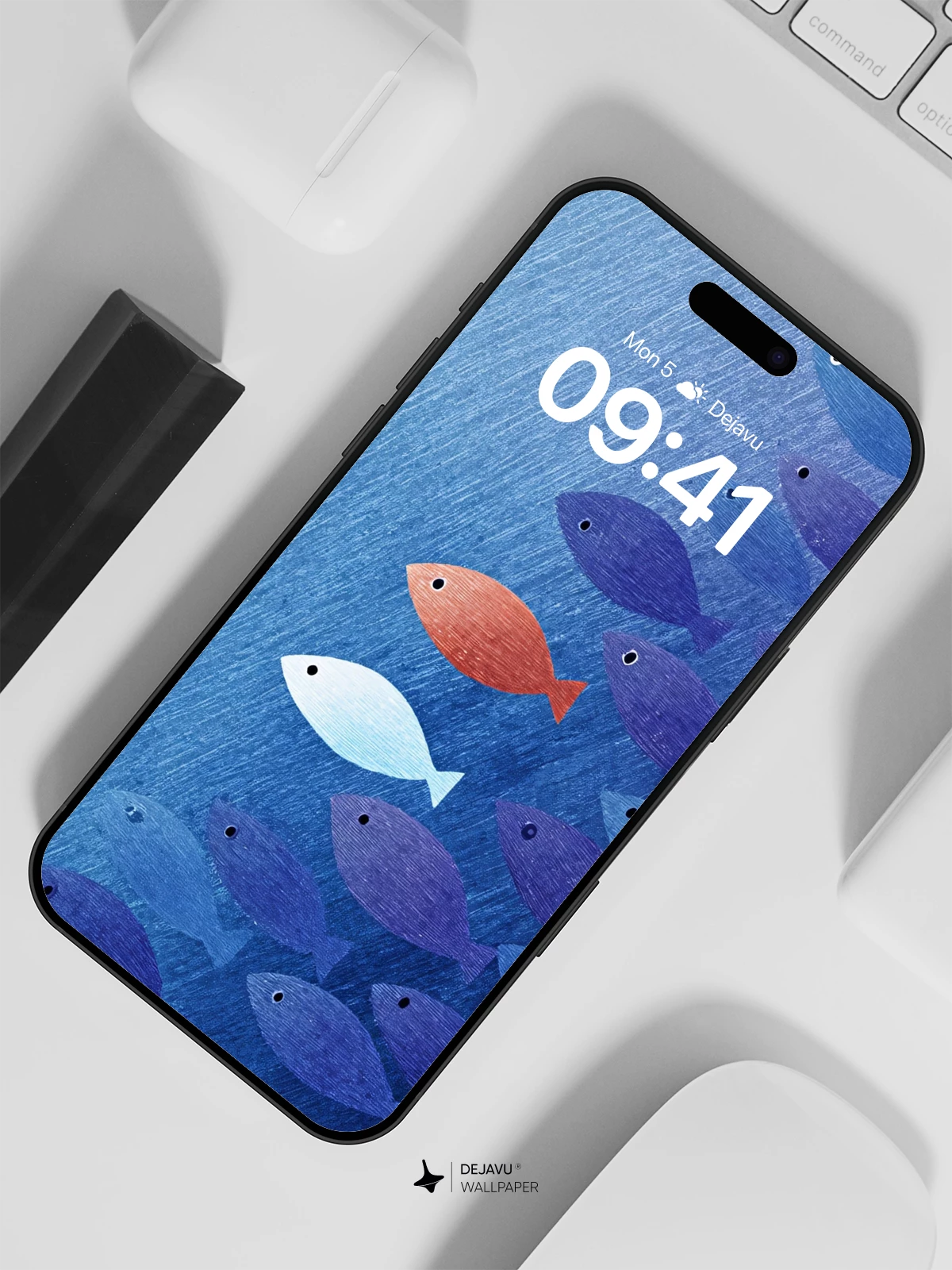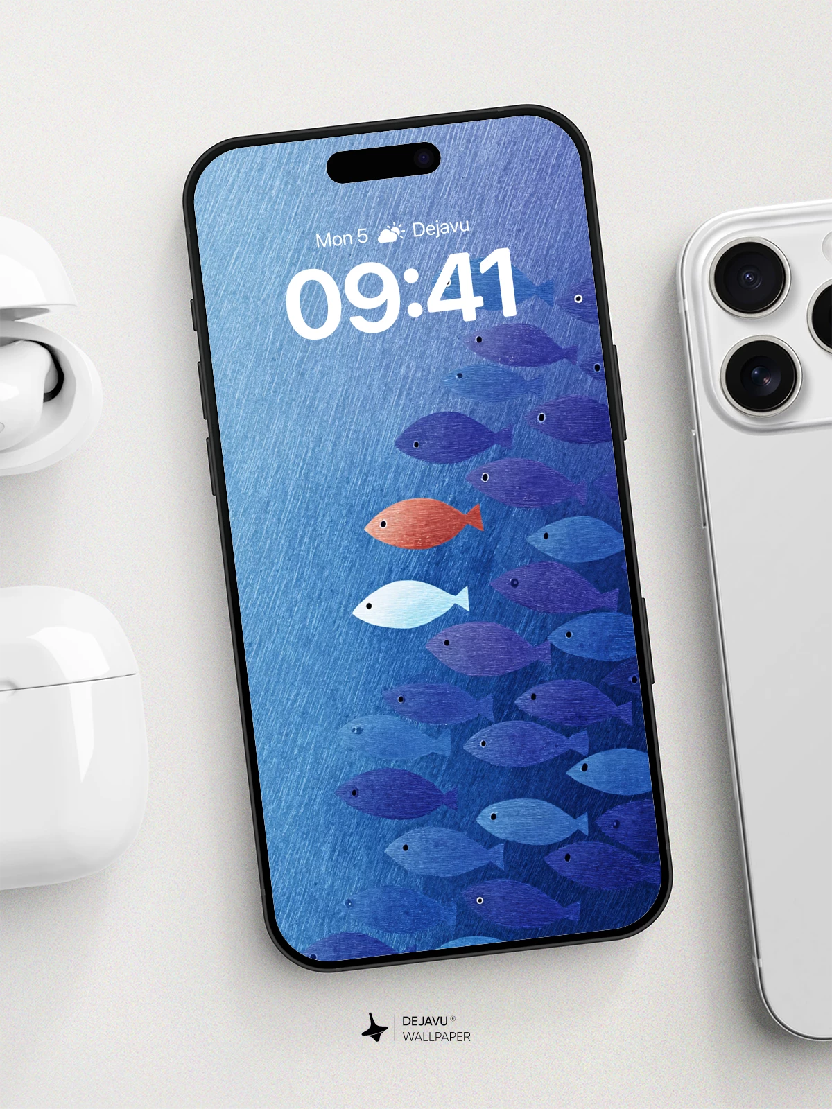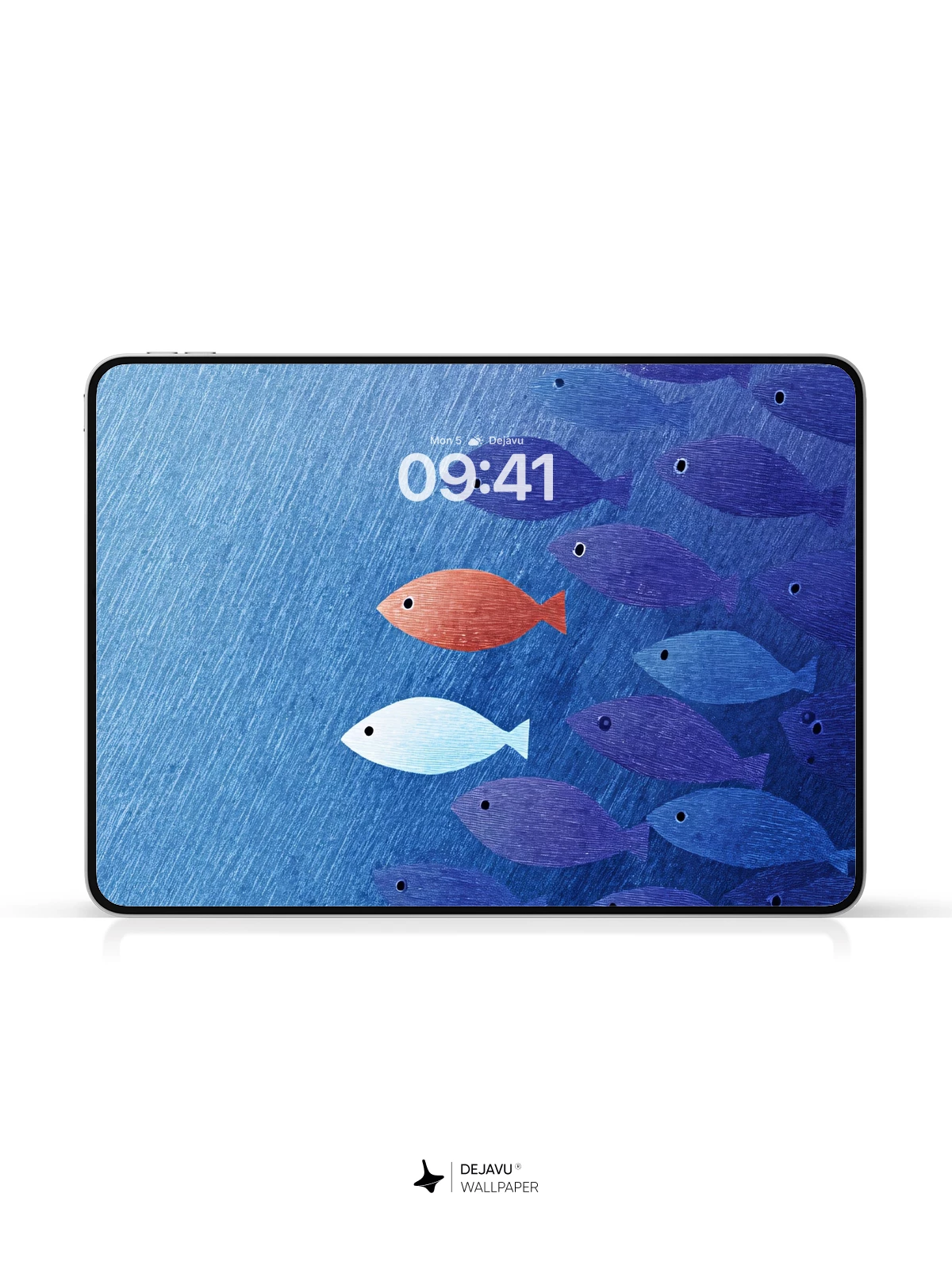 This minimalist digital artwork captures a tranquil school of blue fish gliding through textured ocean depths, punctuated by a single vibrant orange fish that breaks the pattern. The design evokes themes of individuality and quiet rebellion within unity, rendered in soothing gradients and clean silhouettes. Ideal as an 8K wallpaper for iPhone, Android, or tablets, it brings a sense of calm and subtle storytelling to your screen. Inspired by modern illustrative styles, this piece balances simplicity with emotional depth.