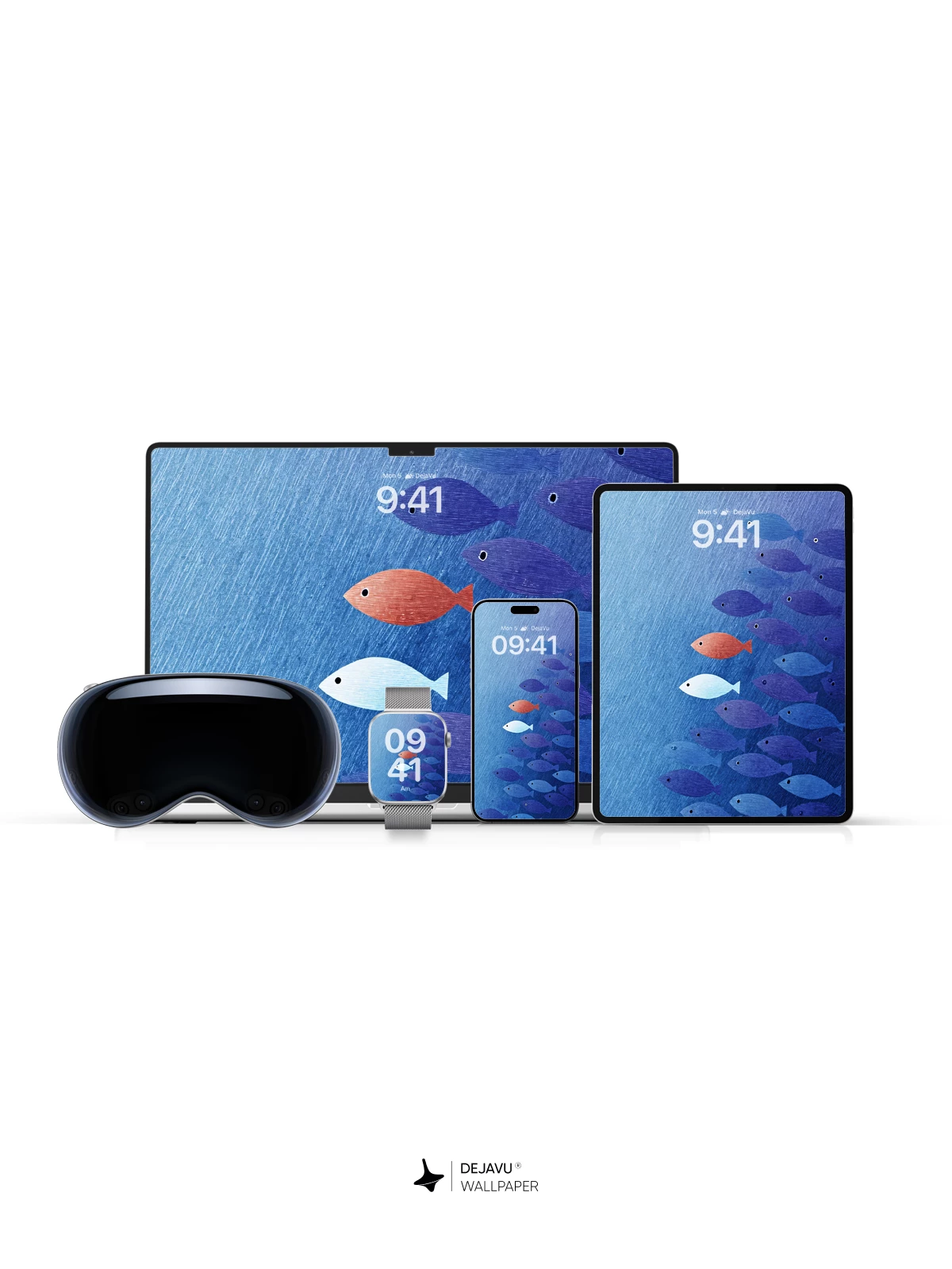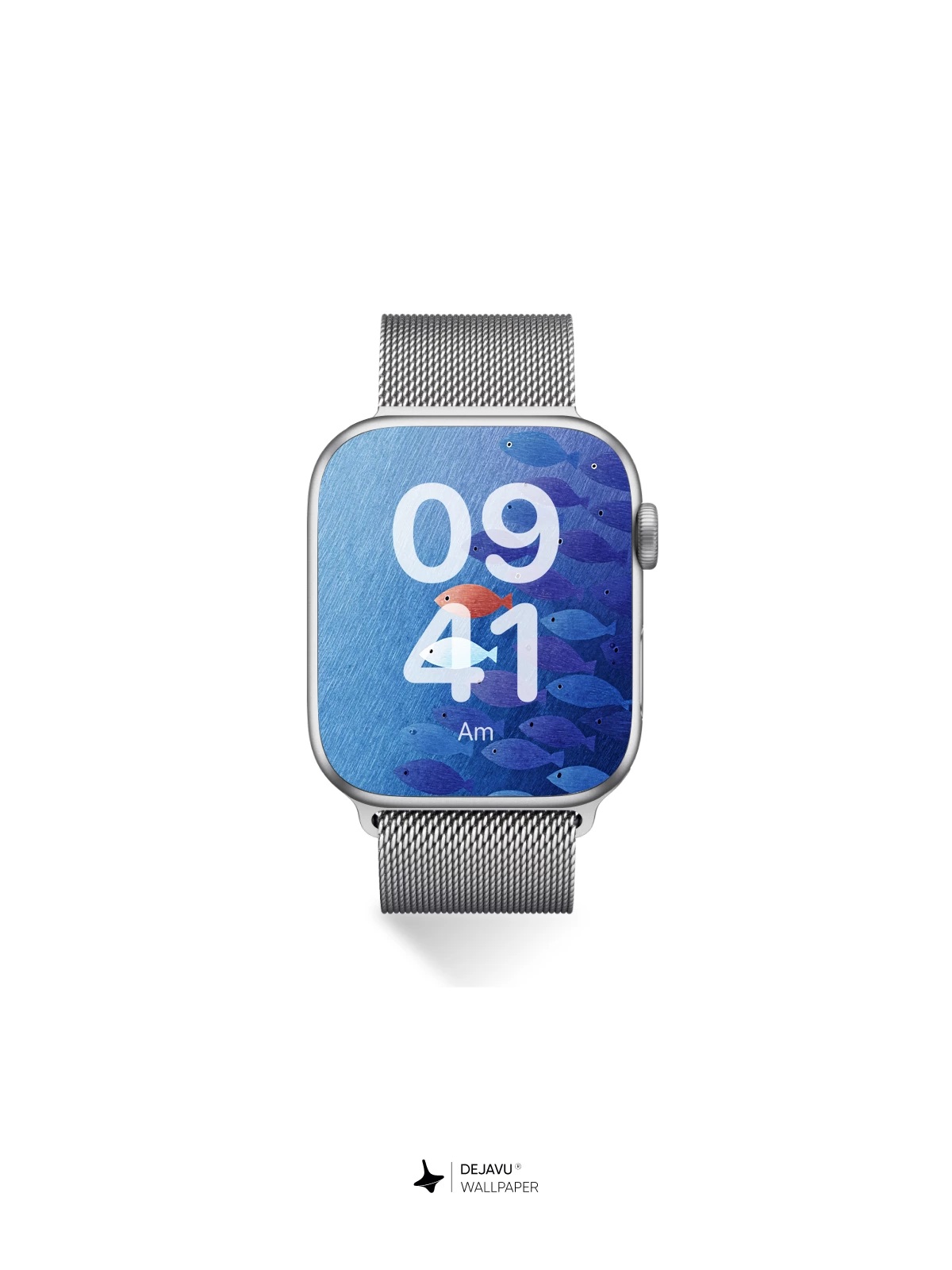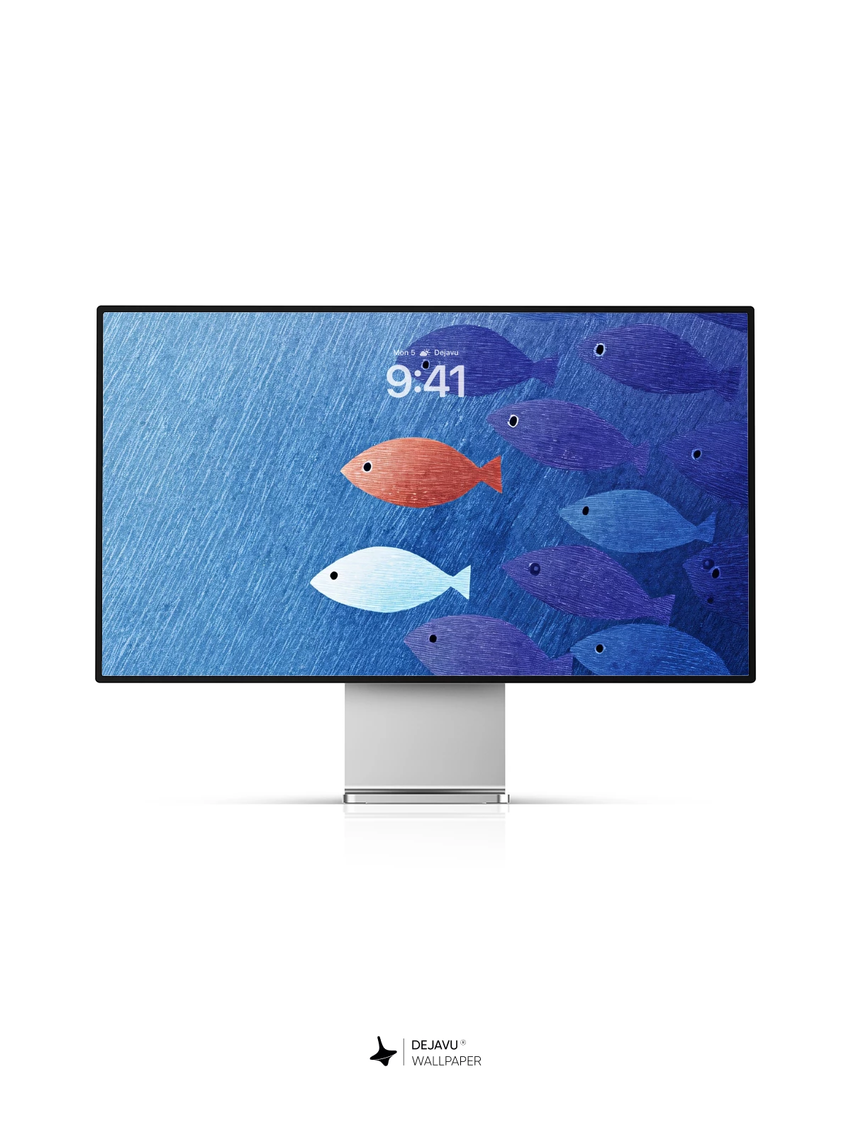 This minimalist digital artwork captures a tranquil school of blue fish gliding through textured ocean depths, punctuated by a single vibrant orange fish that breaks the pattern. The design evokes themes of individuality and quiet rebellion within unity, rendered in soothing gradients and clean silhouettes. Ideal as an 8K wallpaper for iPhone, Android, or tablets, it brings a sense of calm and subtle storytelling to your screen. Inspired by modern illustrative styles, this piece balances simplicity with emotional depth.