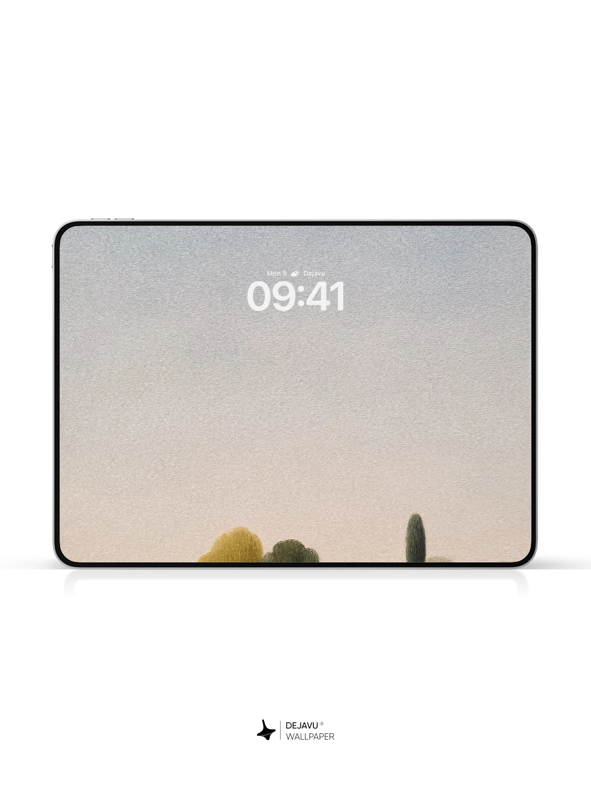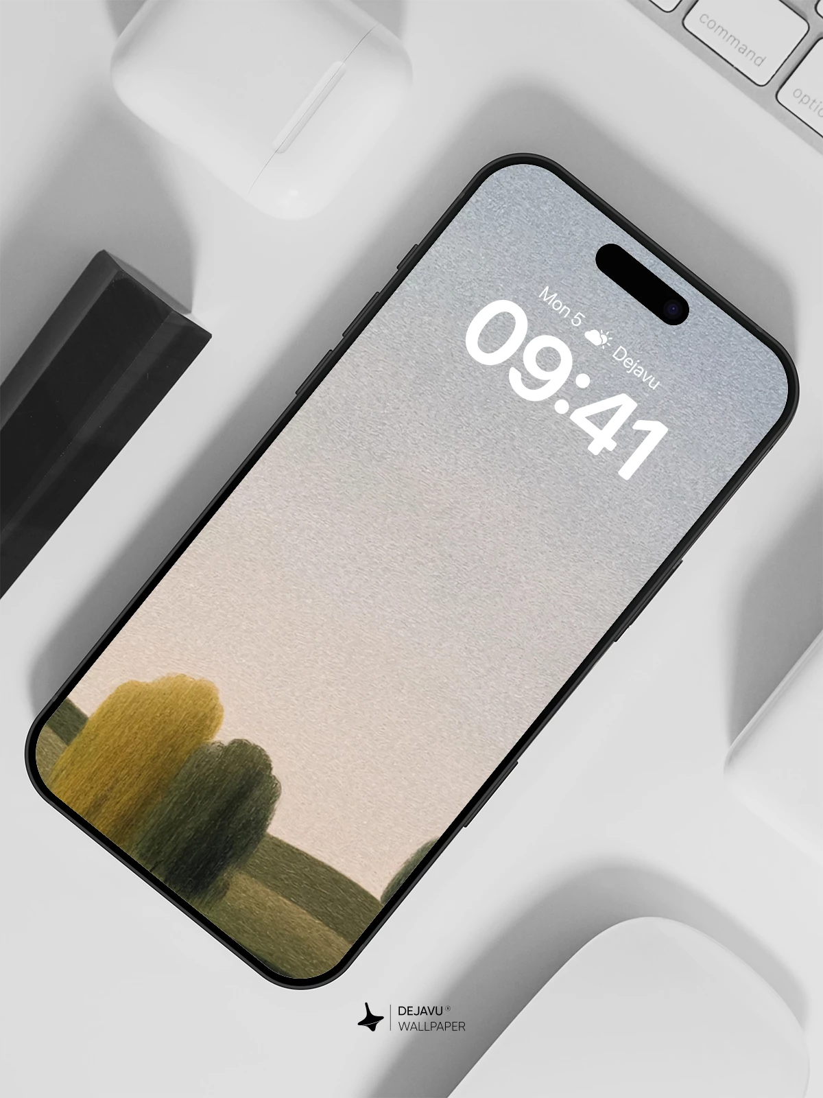 This 8K wallpaper captures a peaceful pastoral scene with gently curved hills, solitary trees, and a vast gradient sky—evoking quiet solitude and timeless beauty. The muted tones and subtle textures reflect a minimalist aesthetic reminiscent of contemporary landscape art, ideal for iPhone, Android, or tablet screens seeking a calming visual retreat.