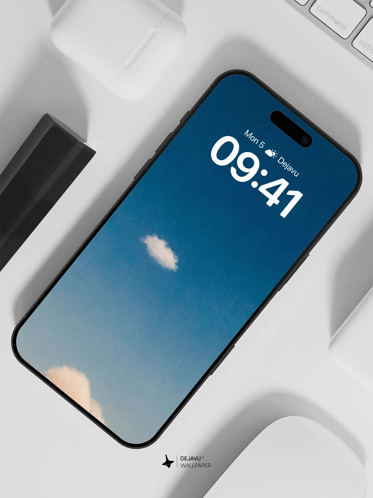 This minimalist wallpaper showcases a lone tree standing on a grassy hill, with two soft clouds floating in a gradient blue sky. Its simplicity evokes calmness, making it ideal for iPhone, Android, and tablet screens.