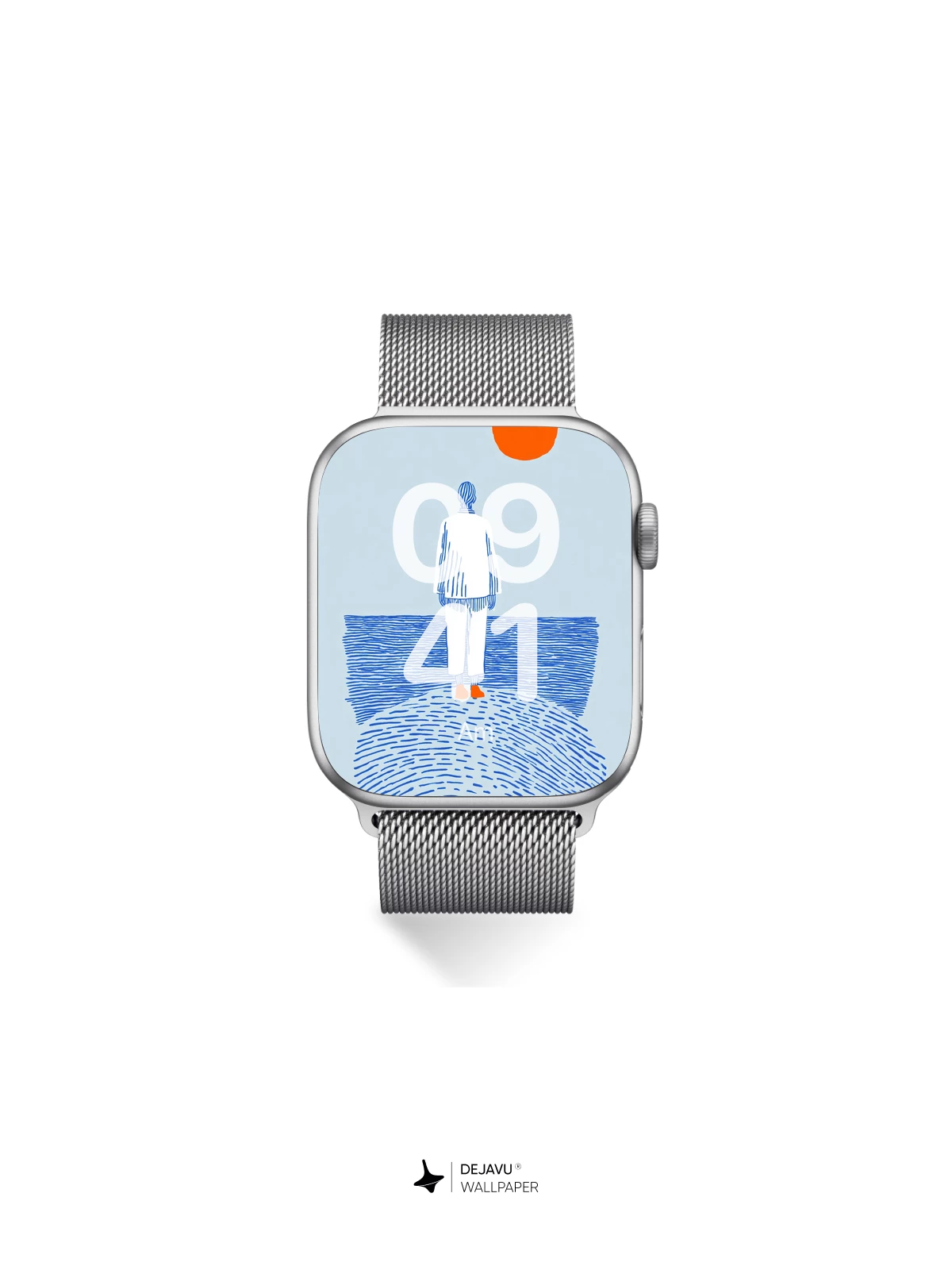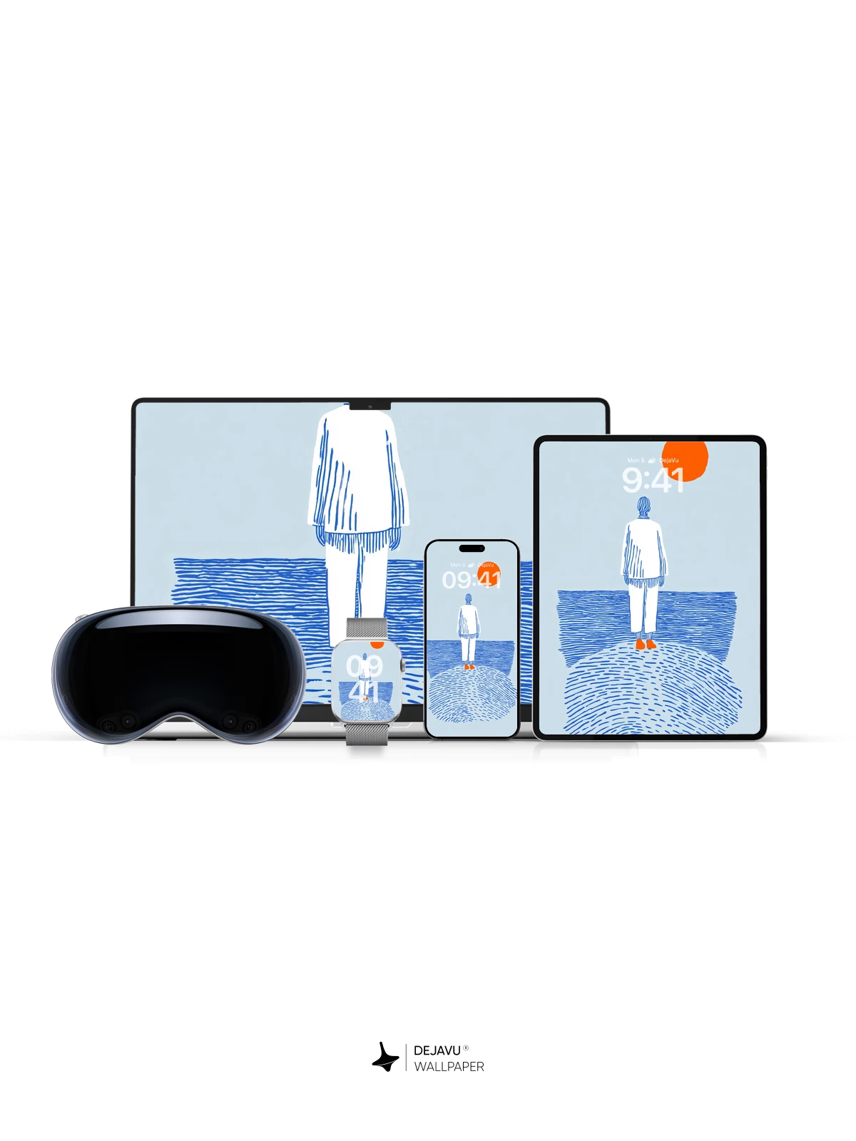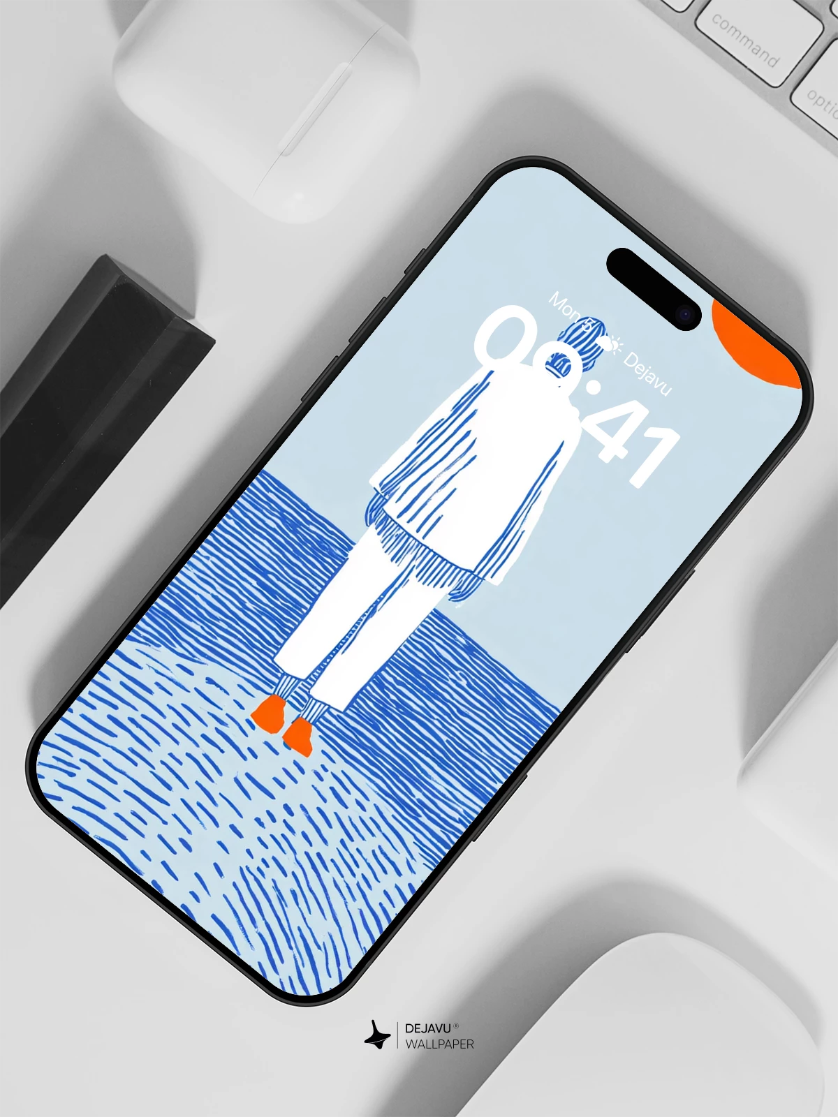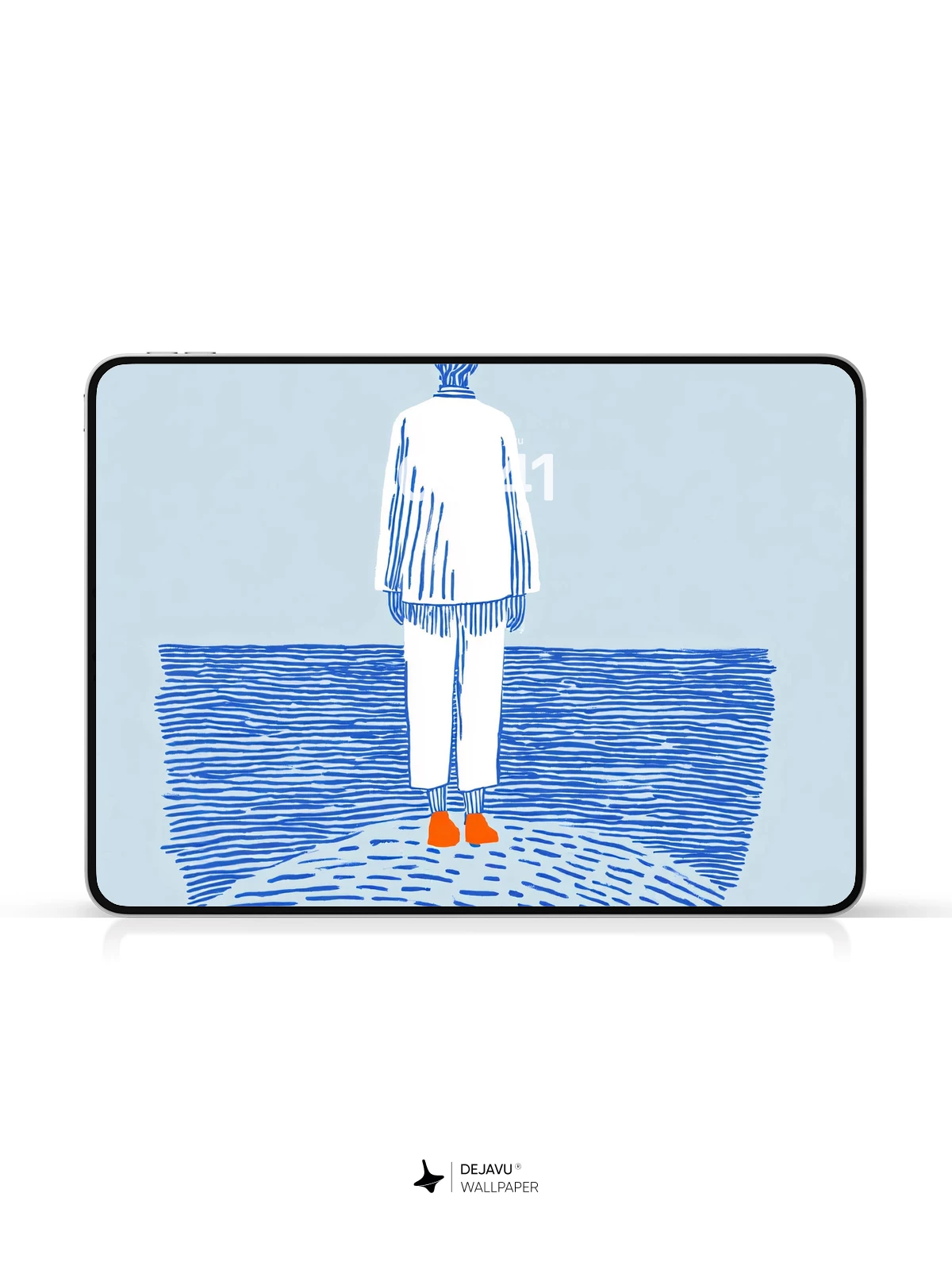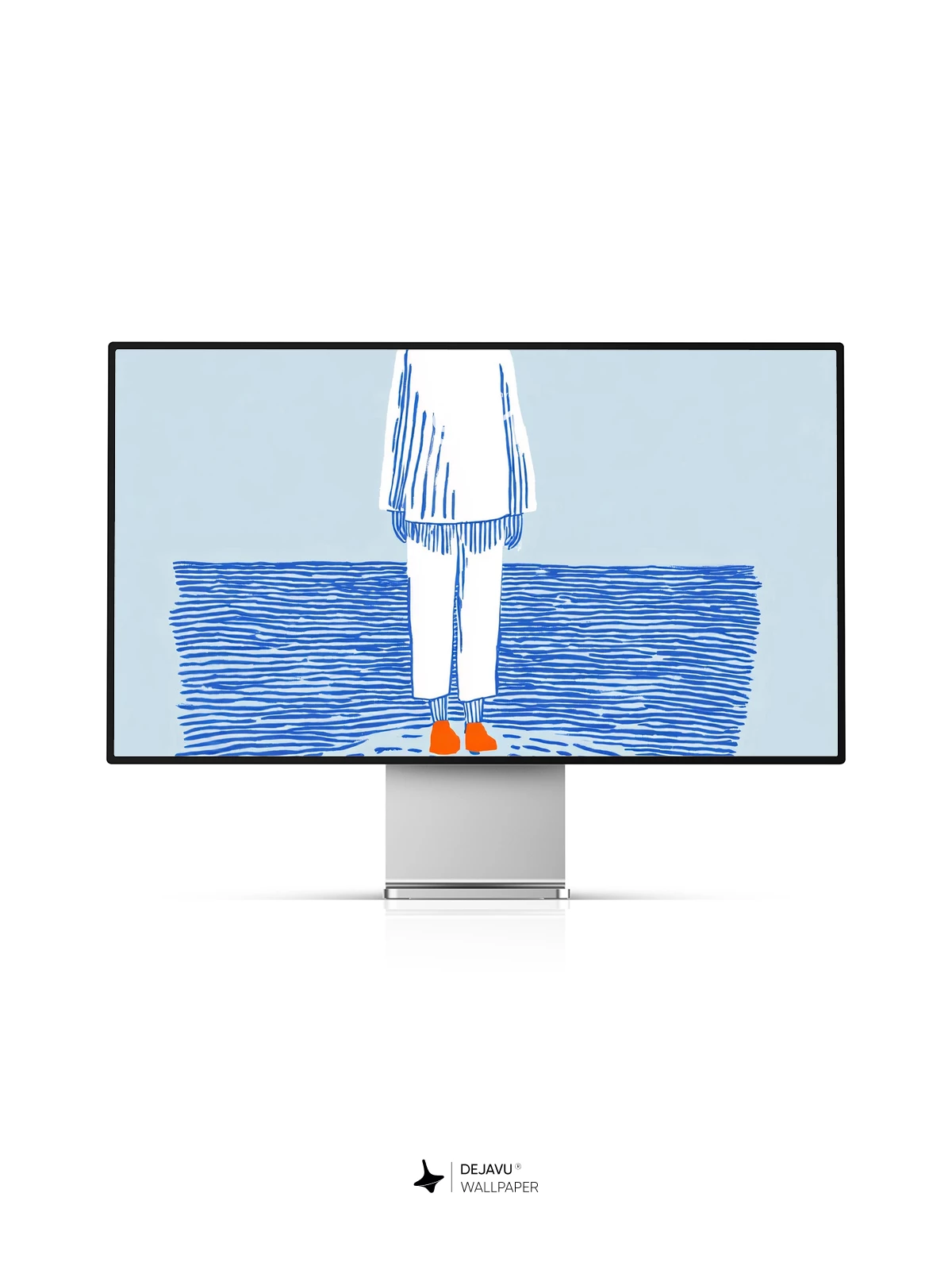 This evocative artwork captures a moment of quiet contemplation—a solitary figure stands on a textured shore, facing the vast ocean under a radiant orange sun. Rendered in a clean, illustrative style with blue linework and subtle shading, it exudes calmness and introspection. Inspired by modern graphic minimalism, this design feels both timeless and contemporary, ideal as an 8K wallpaper for iPhone, Android, or tablets. The balance of negative space and symbolic elements creates a peaceful mood, perfect for those seeking mindful digital aesthetics.