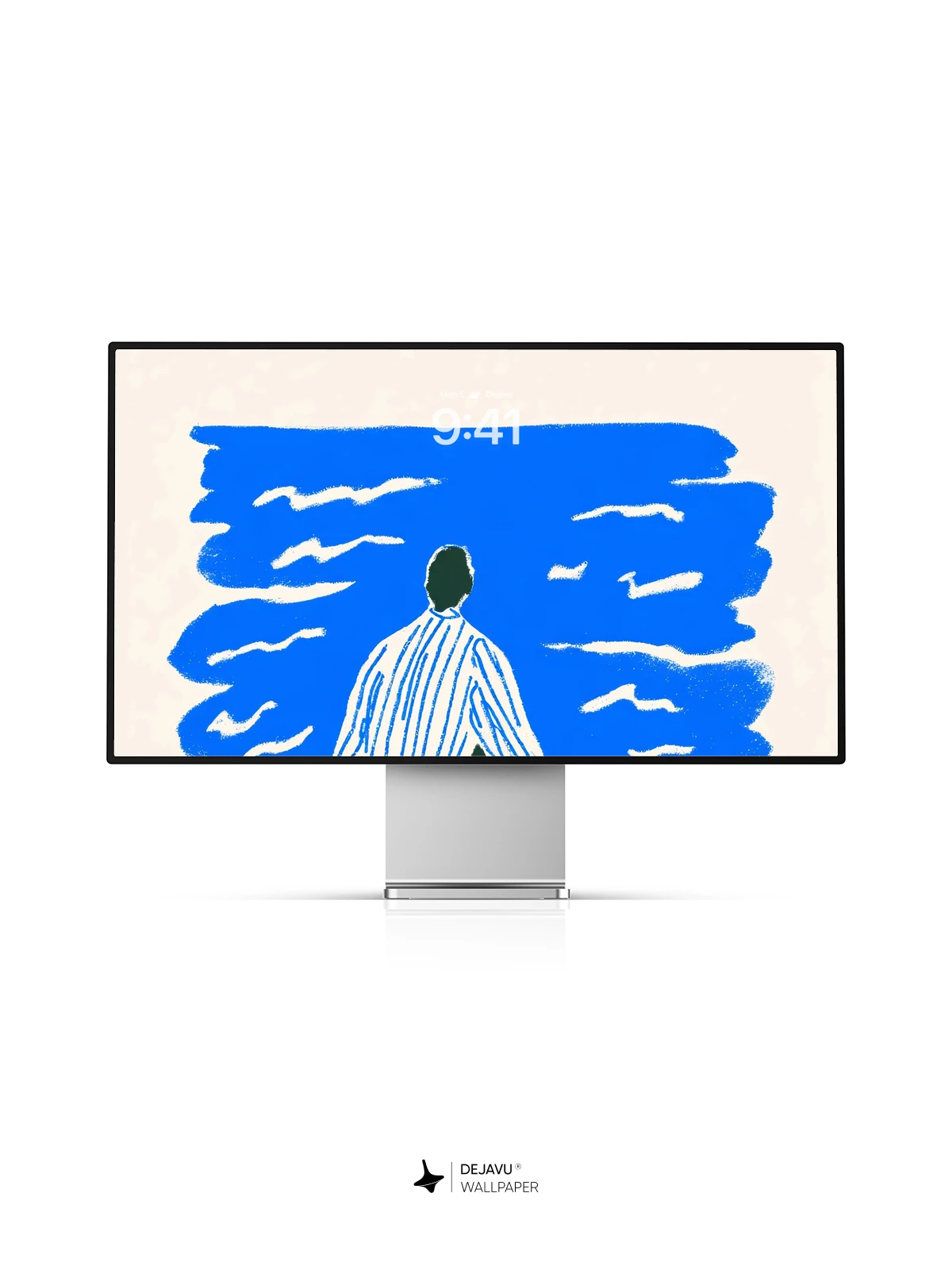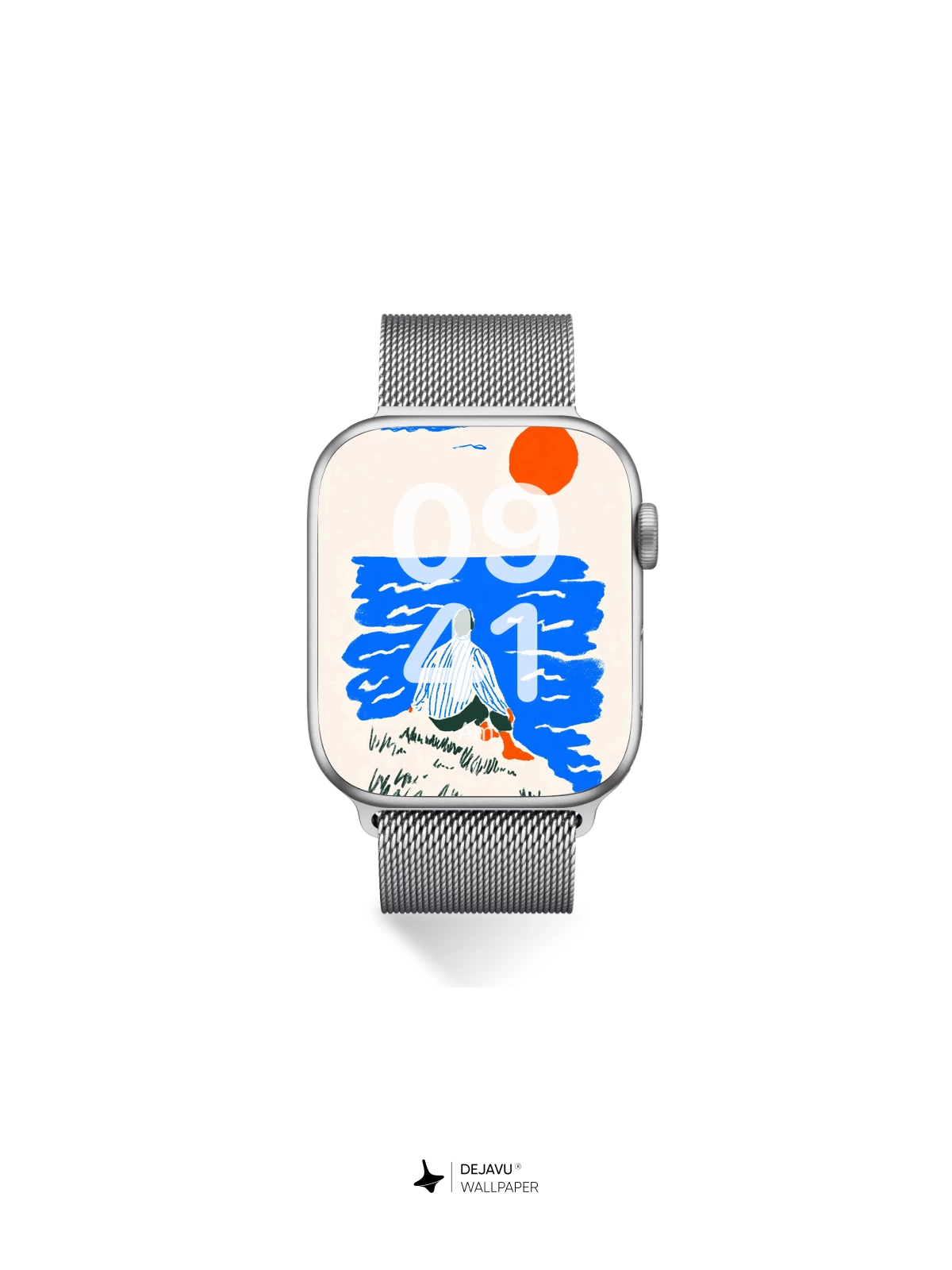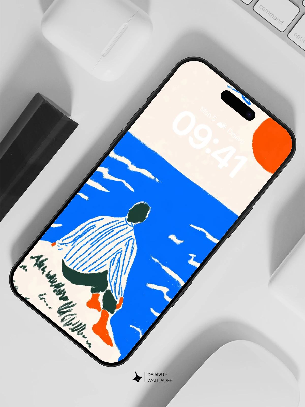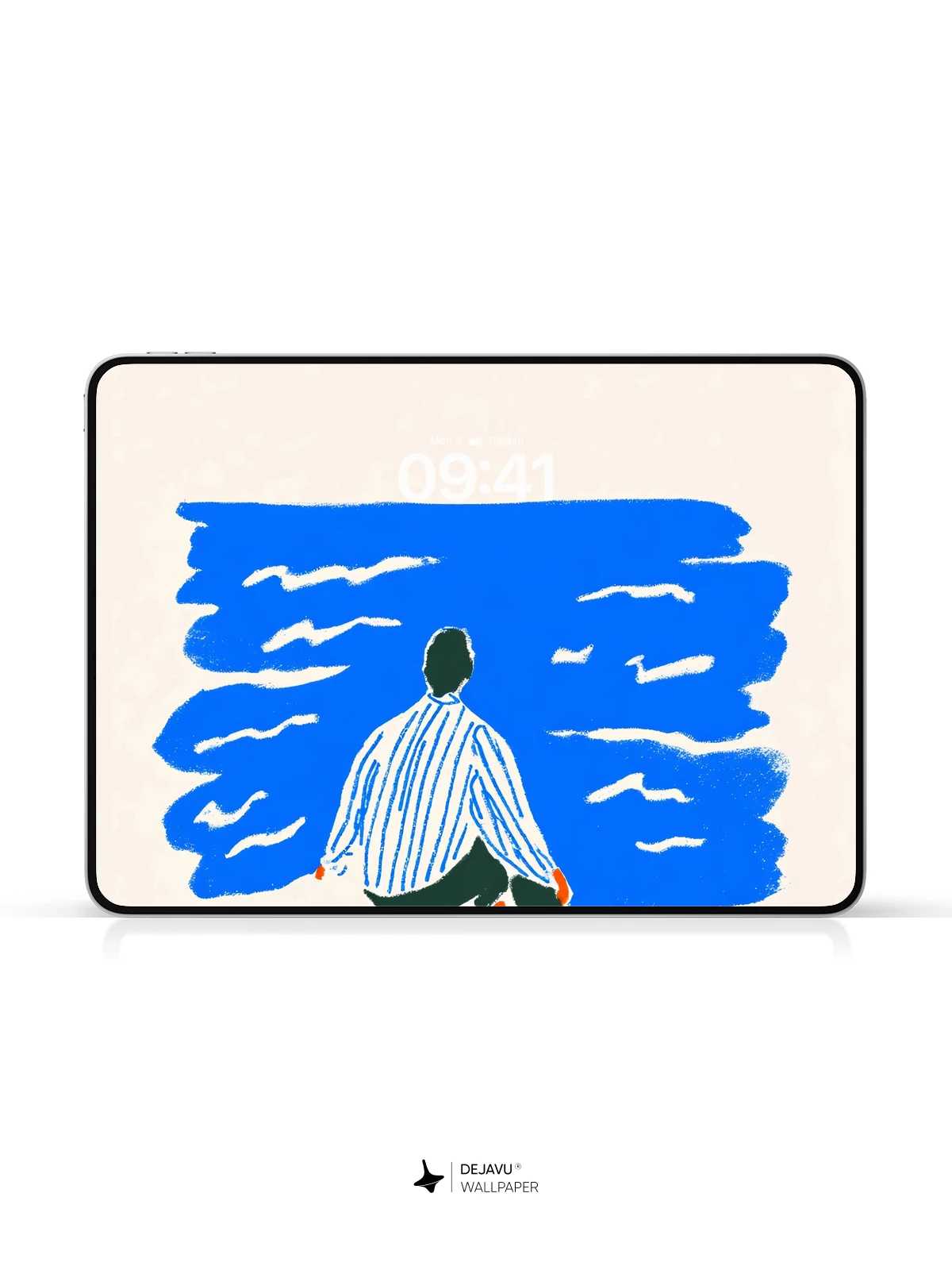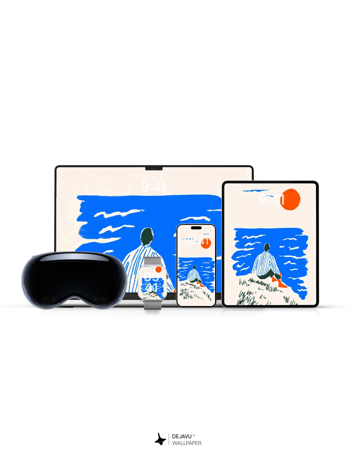 This tranquil illustration captures a solitary figure sitting on a grassy shore, gazing at a vast blue ocean beneath a radiant orange sun—evoking a sense of quiet reflection and timeless stillness. Inspired by modern graphic art with a touch of Japanese woodblock simplicity, the composition uses minimal color and form to create a deeply emotional atmosphere. Ideal as an 8K wallpaper for iPhone, Android, or tablets, this design brings calm and elegance to your mobile device with its soothing palette and meditative mood.