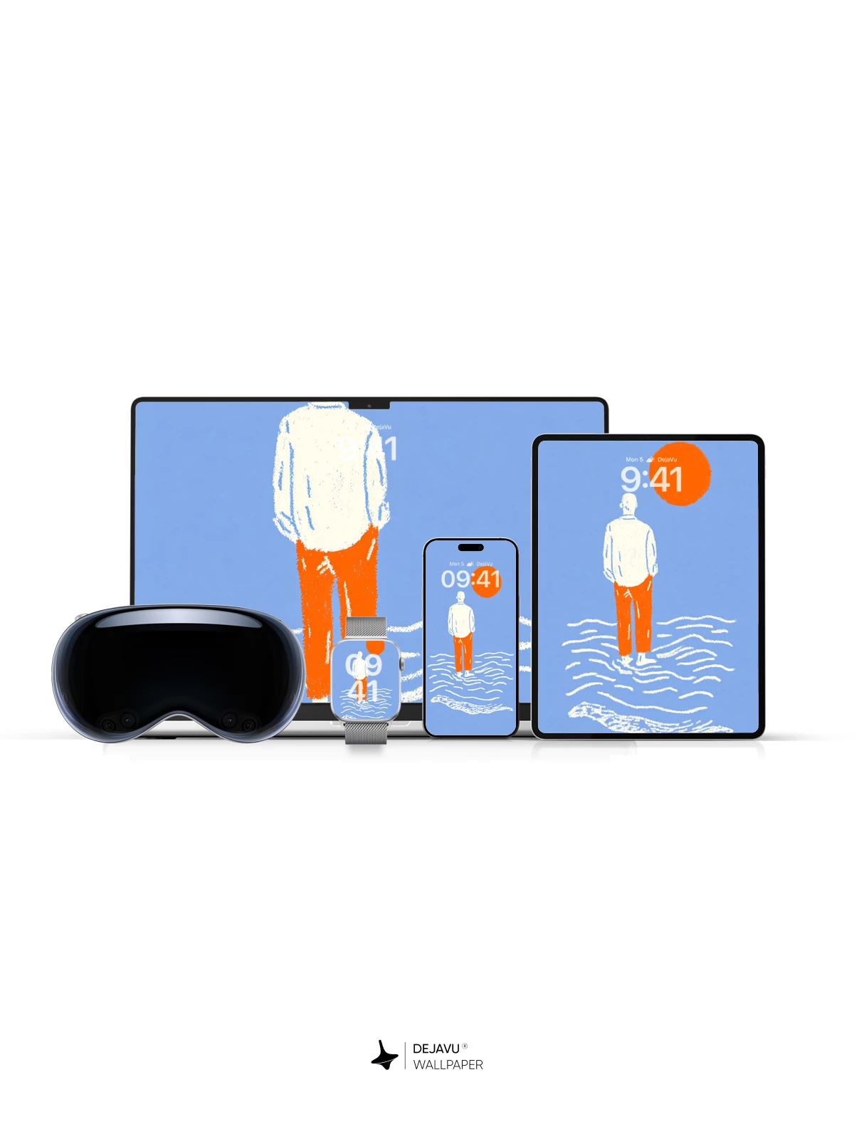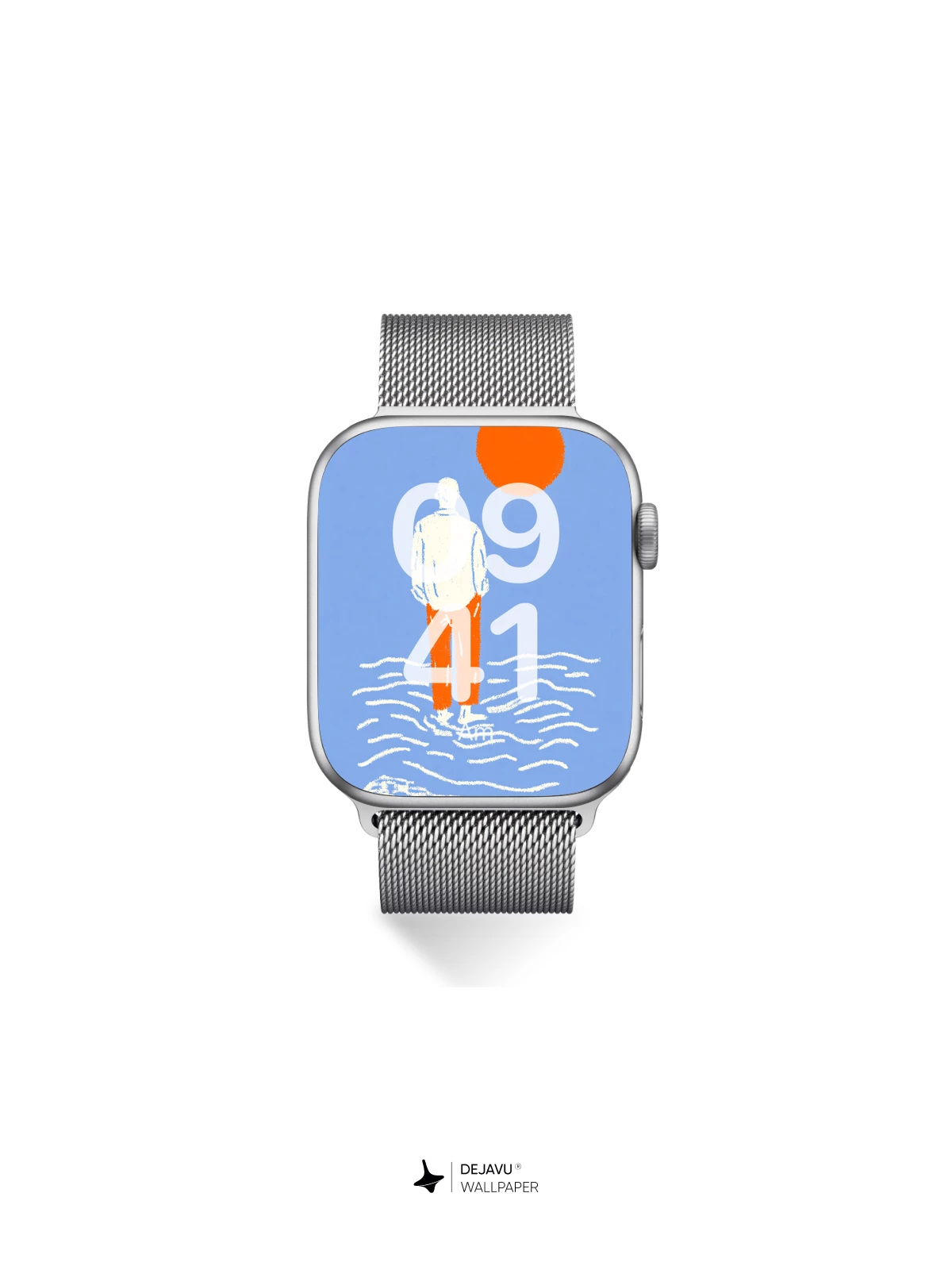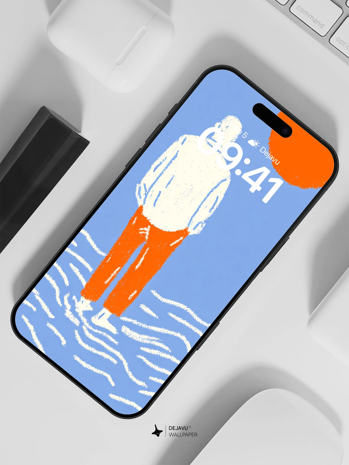 This evocative minimalist artwork features a lone figure gazing at a radiant orange sun against a soft blue sky, standing knee-deep in stylized waves. The clean lines and limited color palette create a tranquil, contemplative mood, ideal for those seeking peace in their digital surroundings. Inspired by modern graphic design with echoes of Japanese woodblock aesthetics, this 8K wallpaper brings calm elegance to any iPhone, Android, or tablet screen.