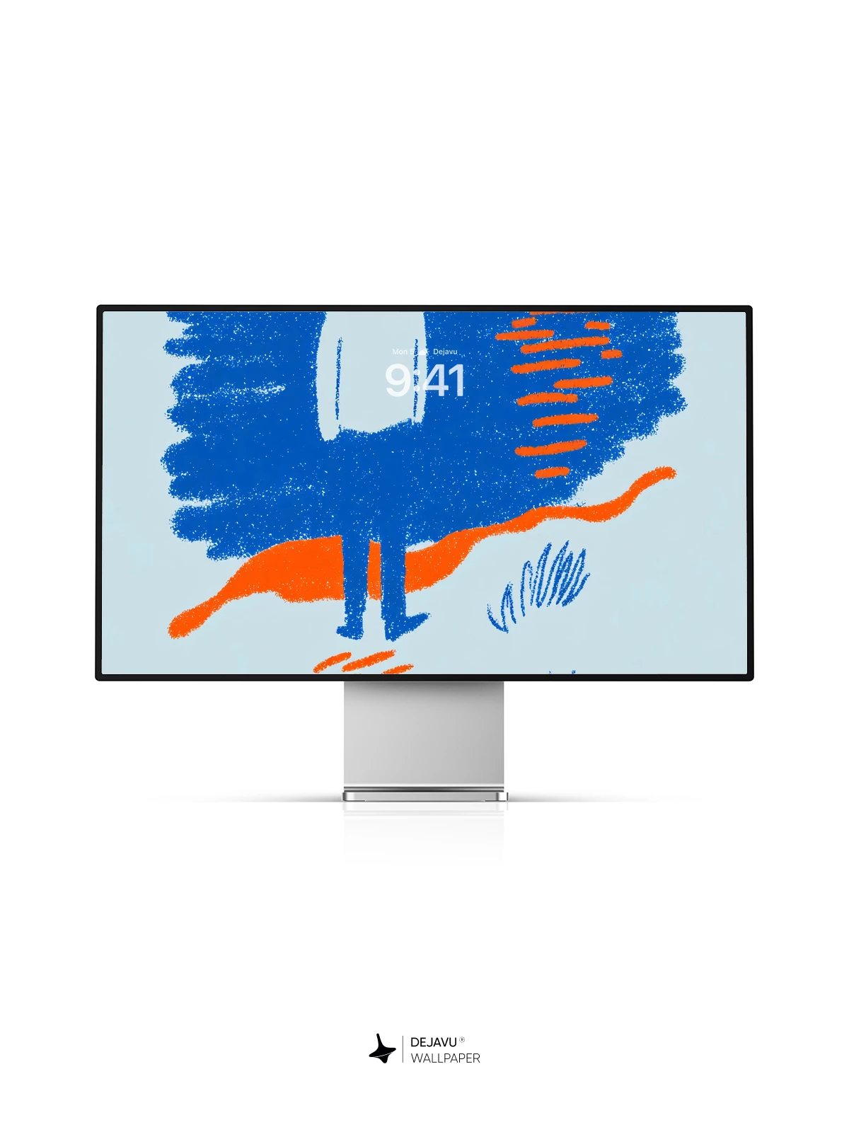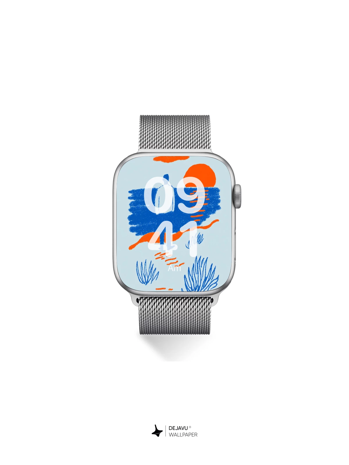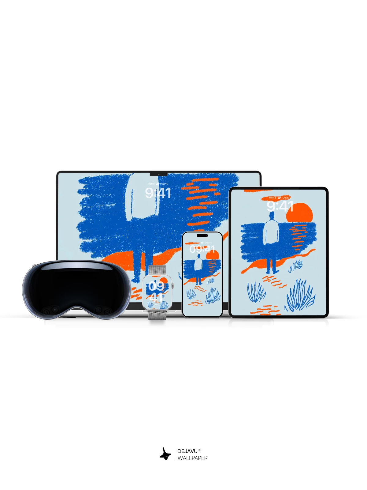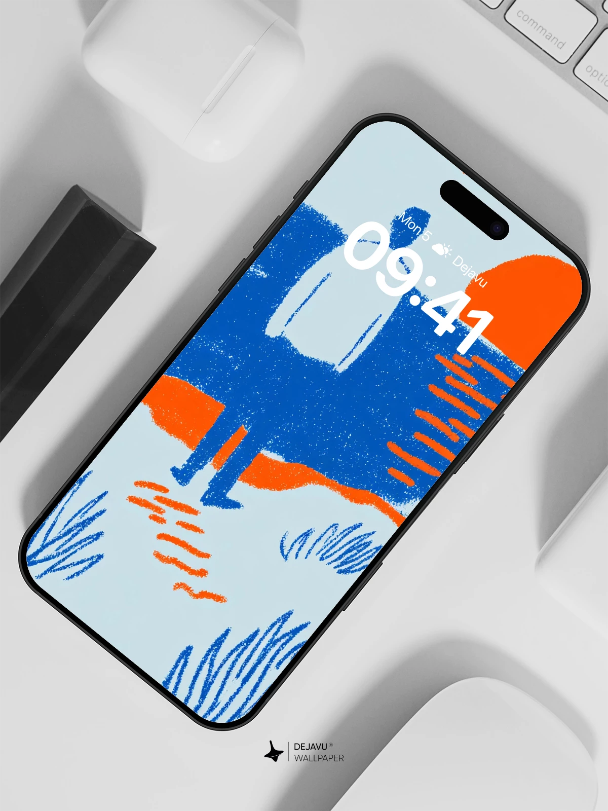 This evocative illustration captures a moment of quiet reflection as a solitary figure stands on an orange shoreline, facing a vast blue sea under a radiant orange sun. Inspired by mid-century modern graphic design, the piece uses bold color blocks and expressive brushwork to convey solitude and peace. The stylized clouds and abstract plants add depth without clutter, making it ideal for calming phone or tablet wallpapers. Whether on iPhone or Android, this 8K artwork brings a sense of stillness and artistic elegance to your device.
