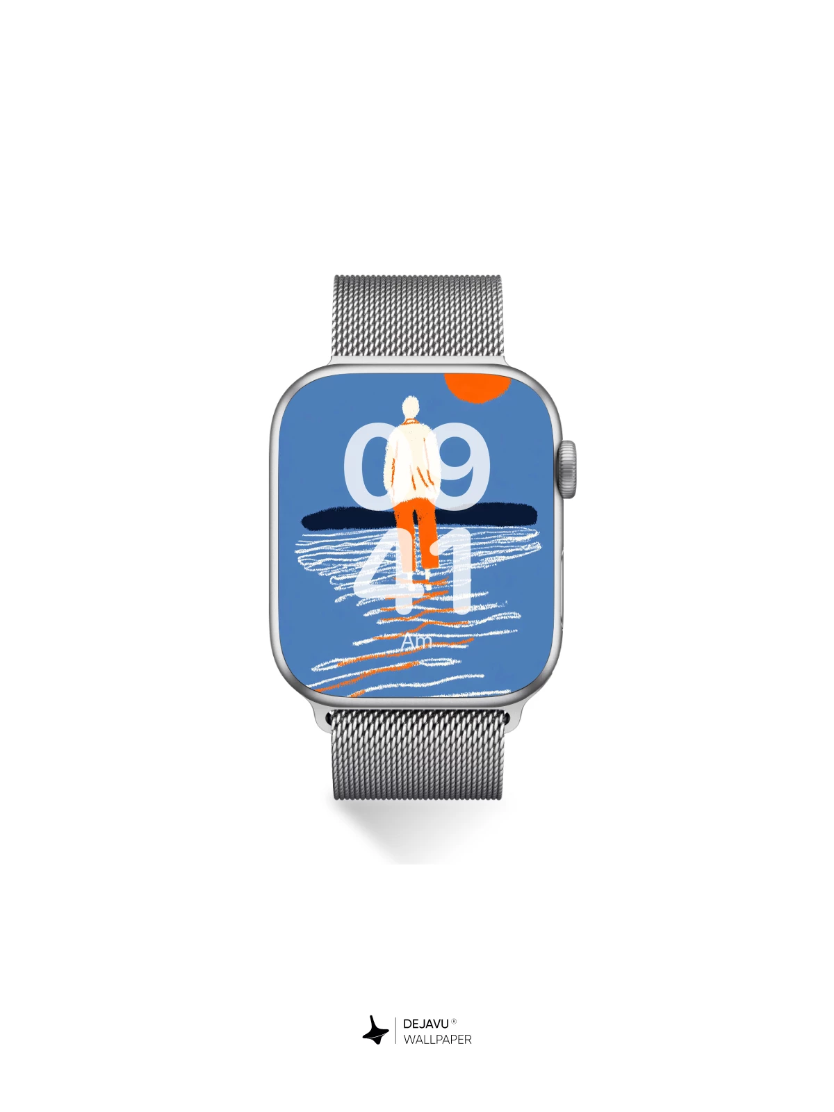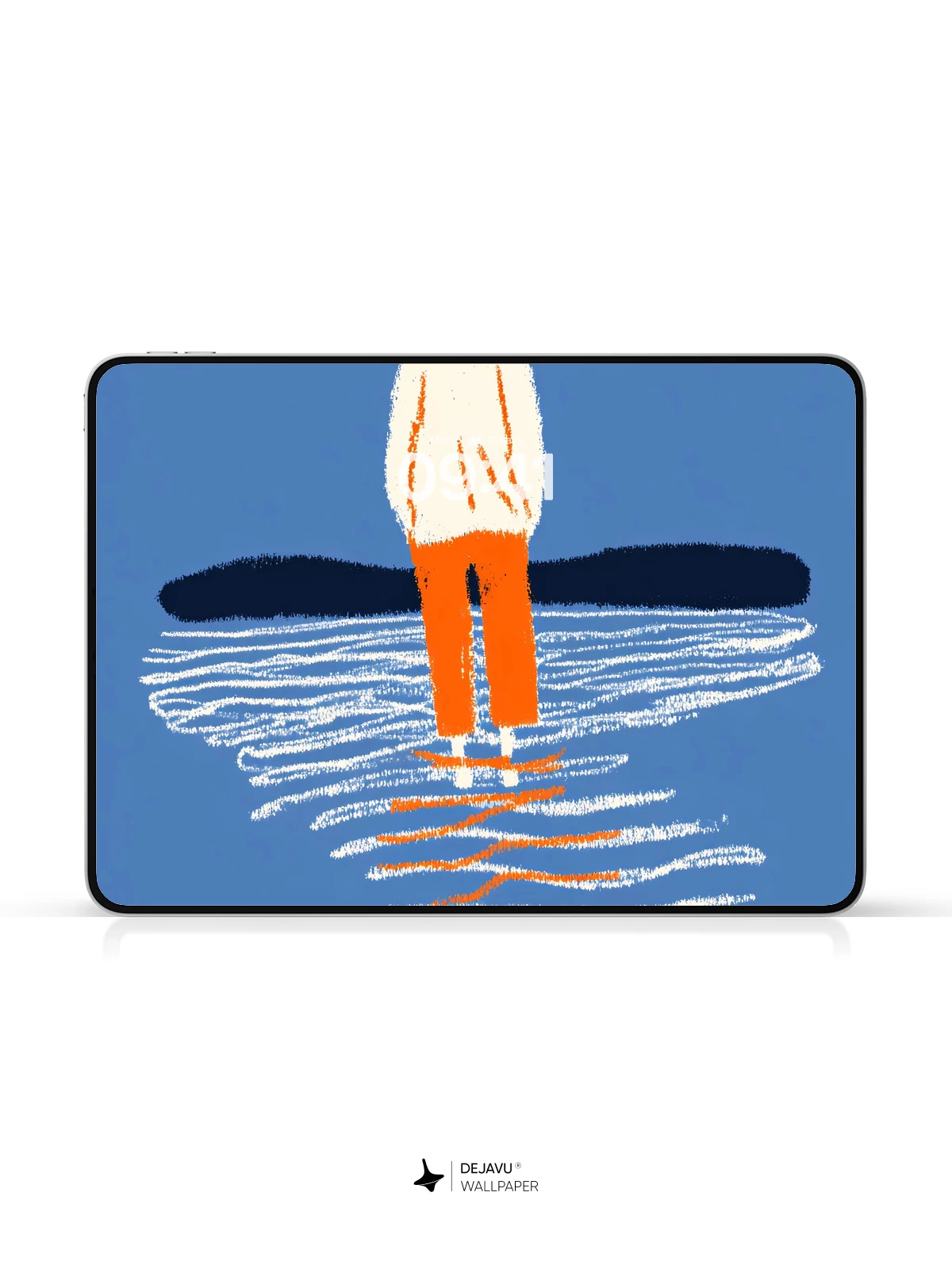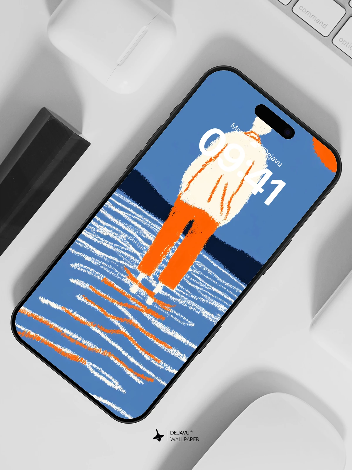 This evocative illustration captures a solitary figure walking toward a glowing orange sun over a stylized horizon, rendered in a minimalist yet emotionally rich style. The interplay of blue tones, white and orange strokes, and clean silhouettes creates a meditative atmosphere, ideal for iPhone, Android, or tablet backgrounds. Inspired by modern graphic art, it conveys quiet introspection and timeless beauty—perfect as a high-resolution 8K wallpaper that brings calm and creativity to your device.