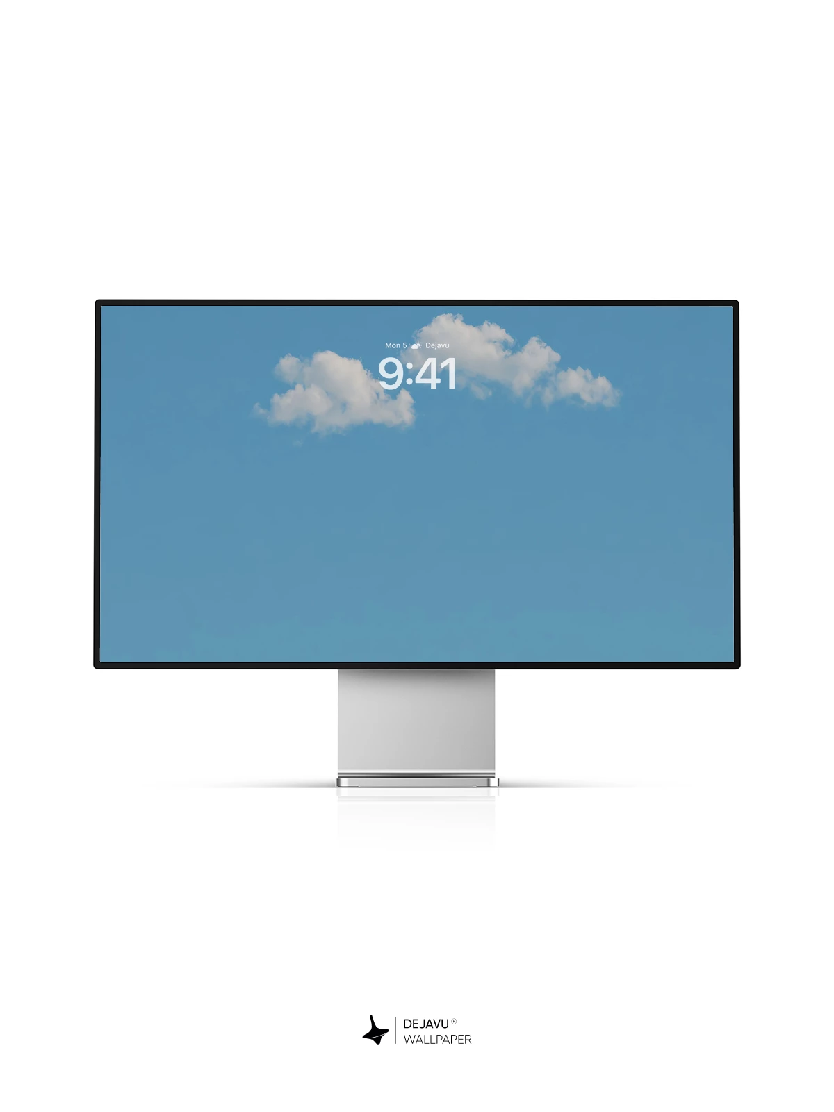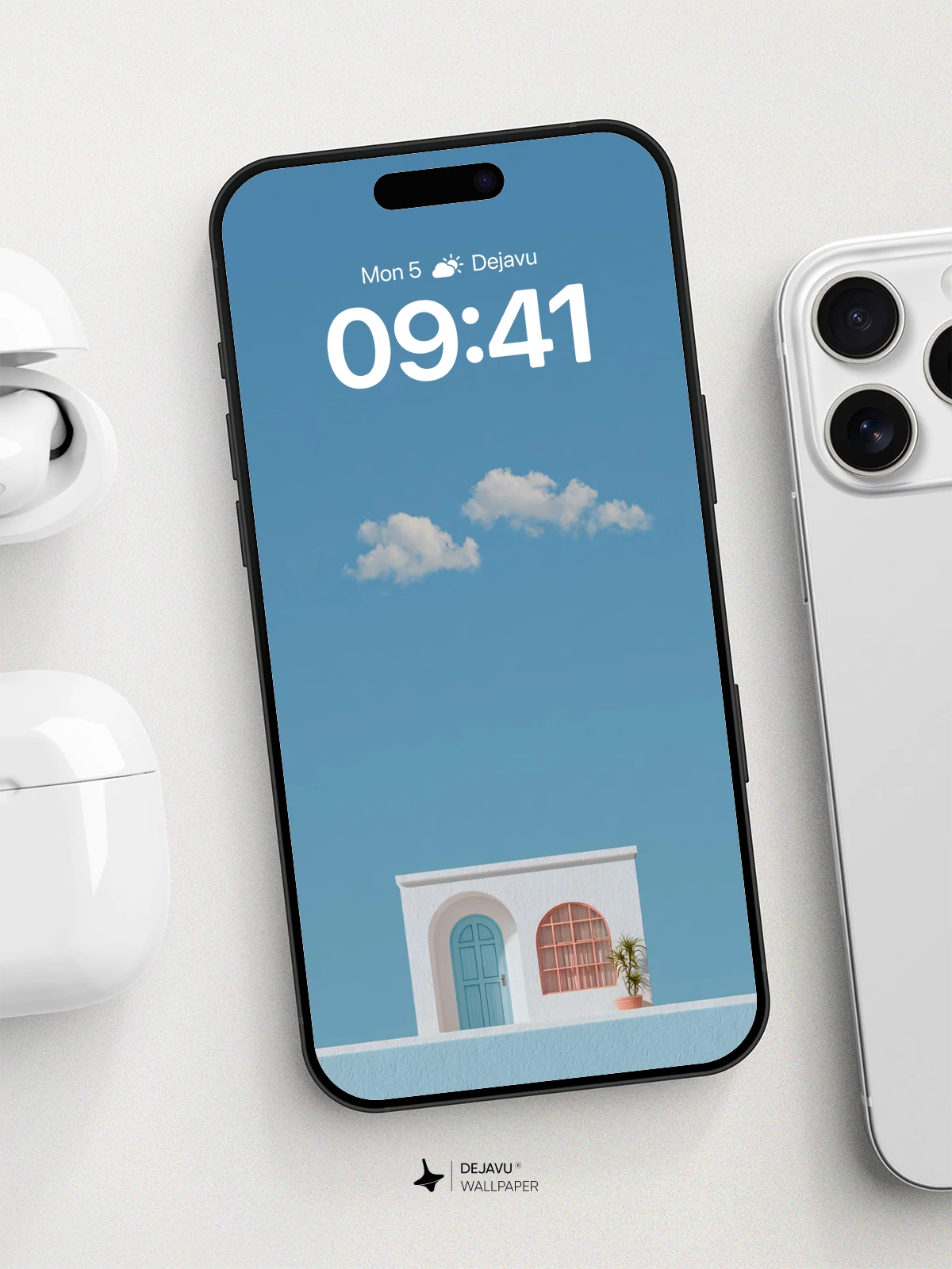 This tranquil scene features a clean white architectural structure with a vibrant turquoise door and pink-framed arched window, set against an expansive blue sky dotted with fluffy clouds. A single potted plant adds life to the minimalist composition. Inspired by Mediterranean simplicity and modern design aesthetics, it evokes calmness and timeless beauty. Ideal as an 8K wallpaper for iPhone, Android, or tablets, this image brings peaceful elegance to your device.
