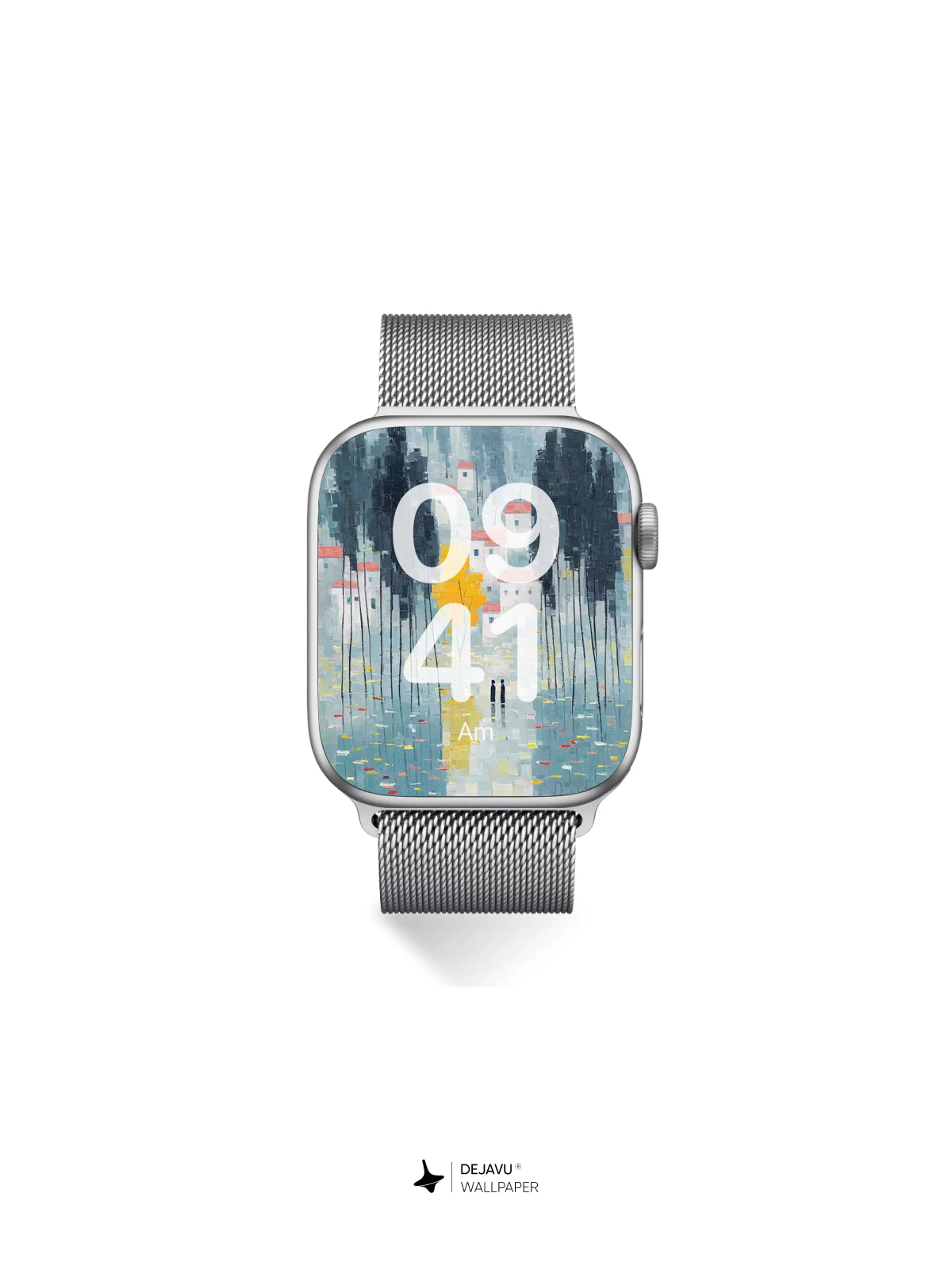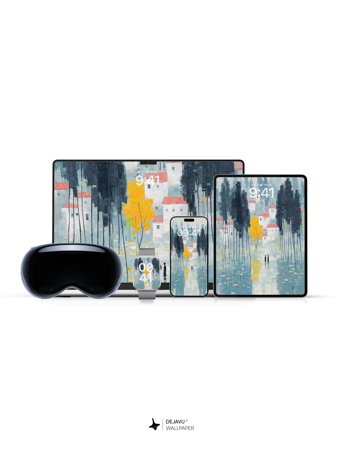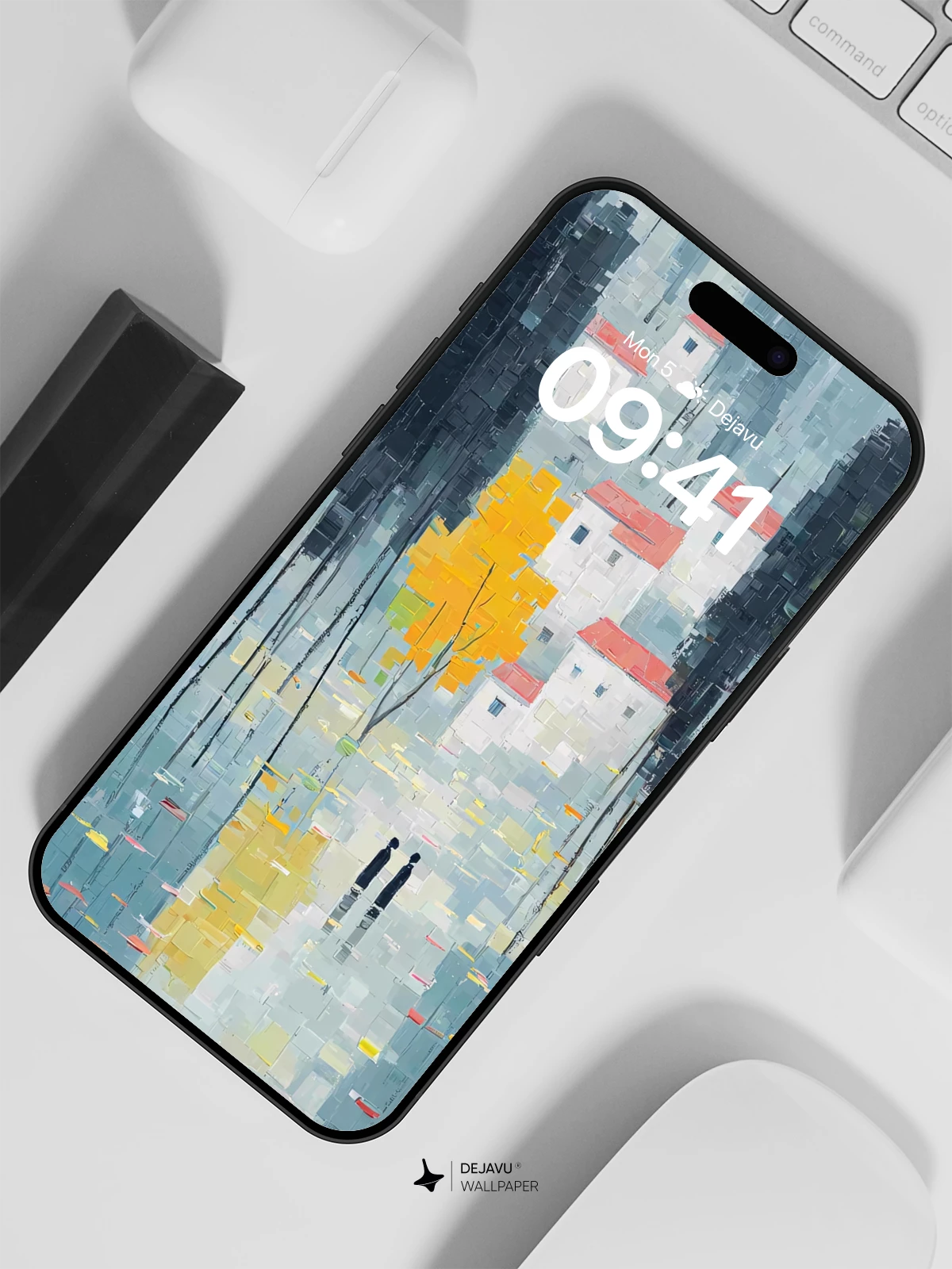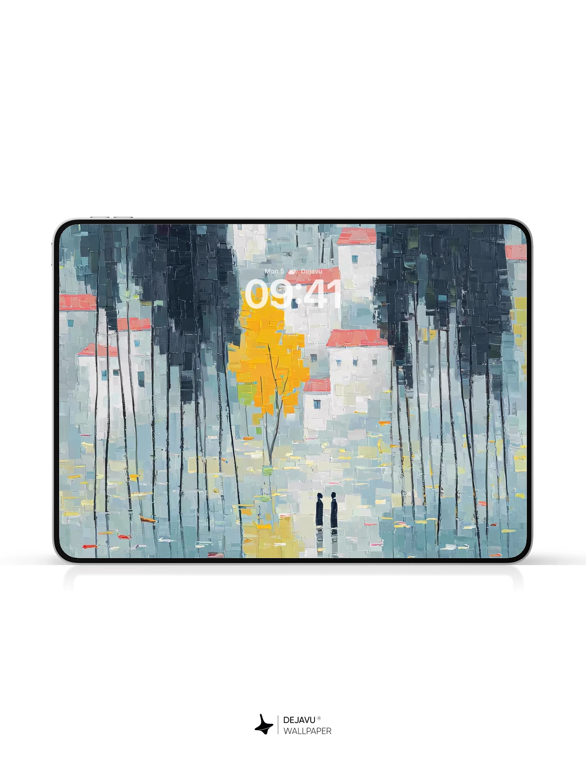 This evocative artwork captures a tranquil village scene painted in a modern impressionist style, reminiscent of contemporary landscape painters who blend realism with dreamlike atmospheres. Tall, dark trees frame a quiet settlement with red-roofed homes, while a single vibrant yellow tree stands as a symbol of warmth amid cool blues and grays. Two small figures walk hand-in-hand across a reflective surface, their reflections shimmering like memories in still water. The composition exudes solitude, peace, and subtle longing—ideal for an immersive 8K wallpaper on iPhone, Android, or tablet devices.