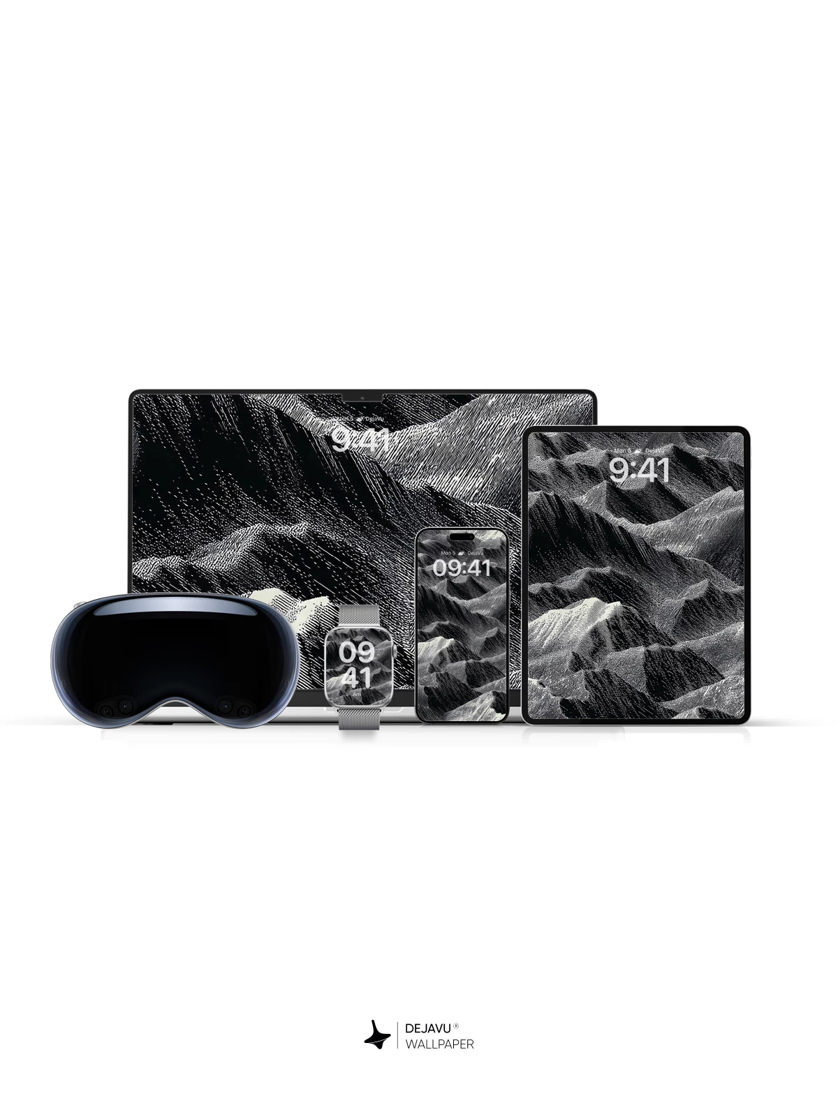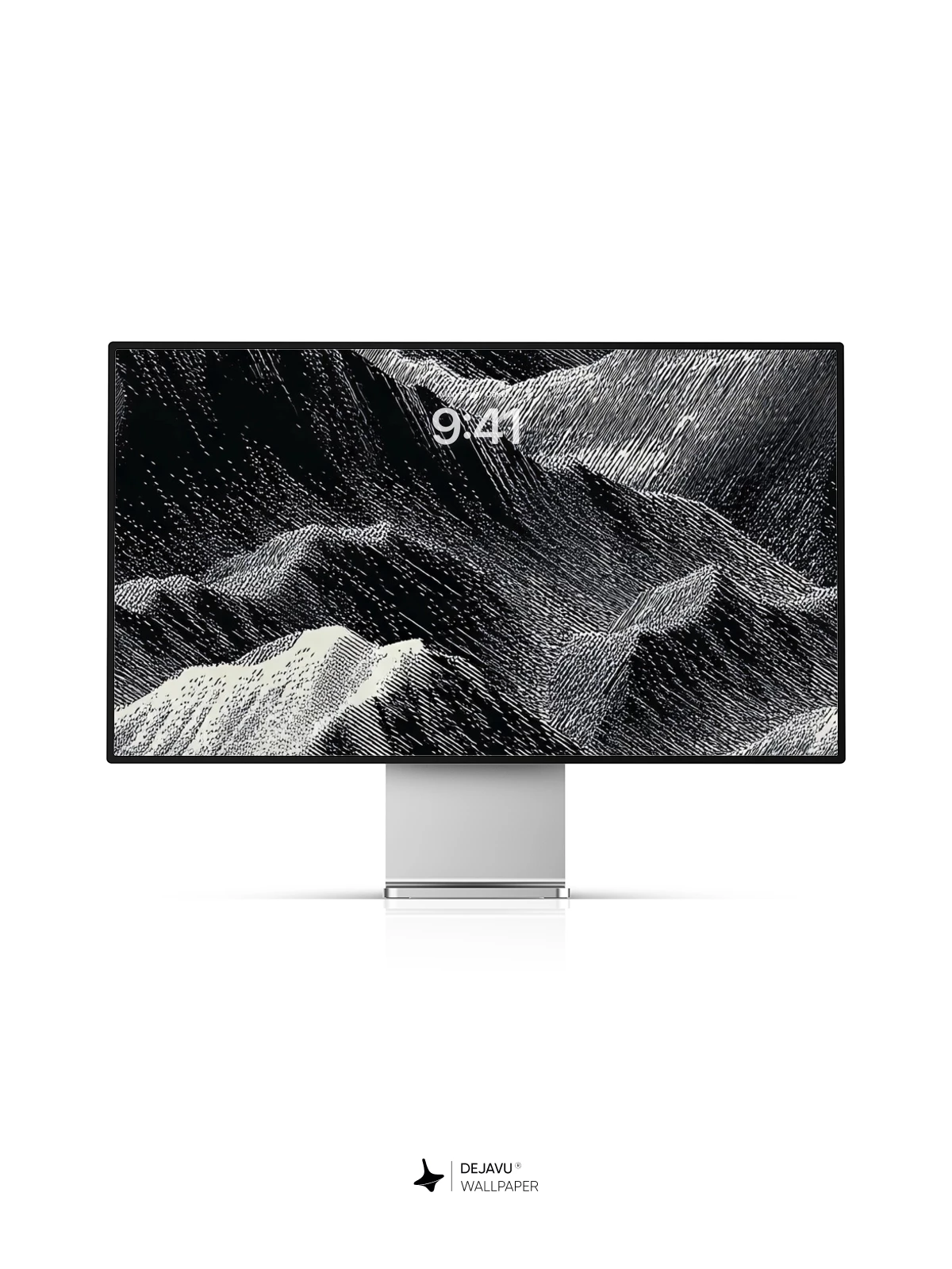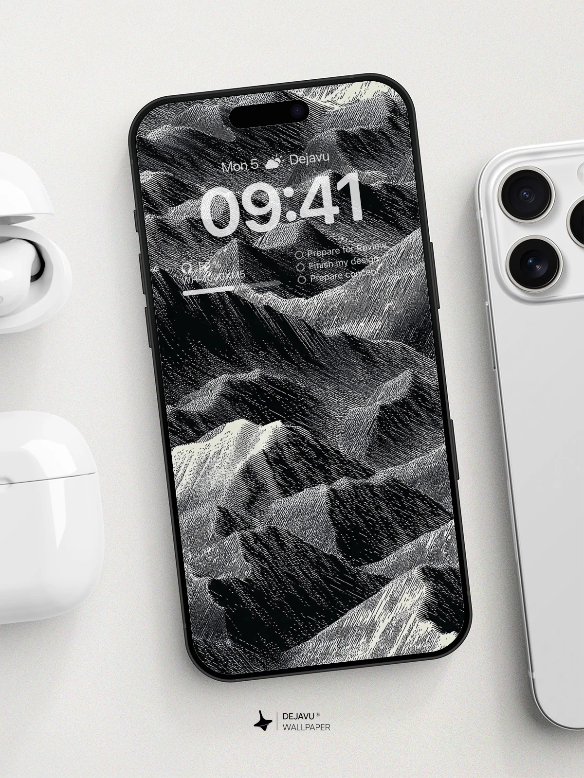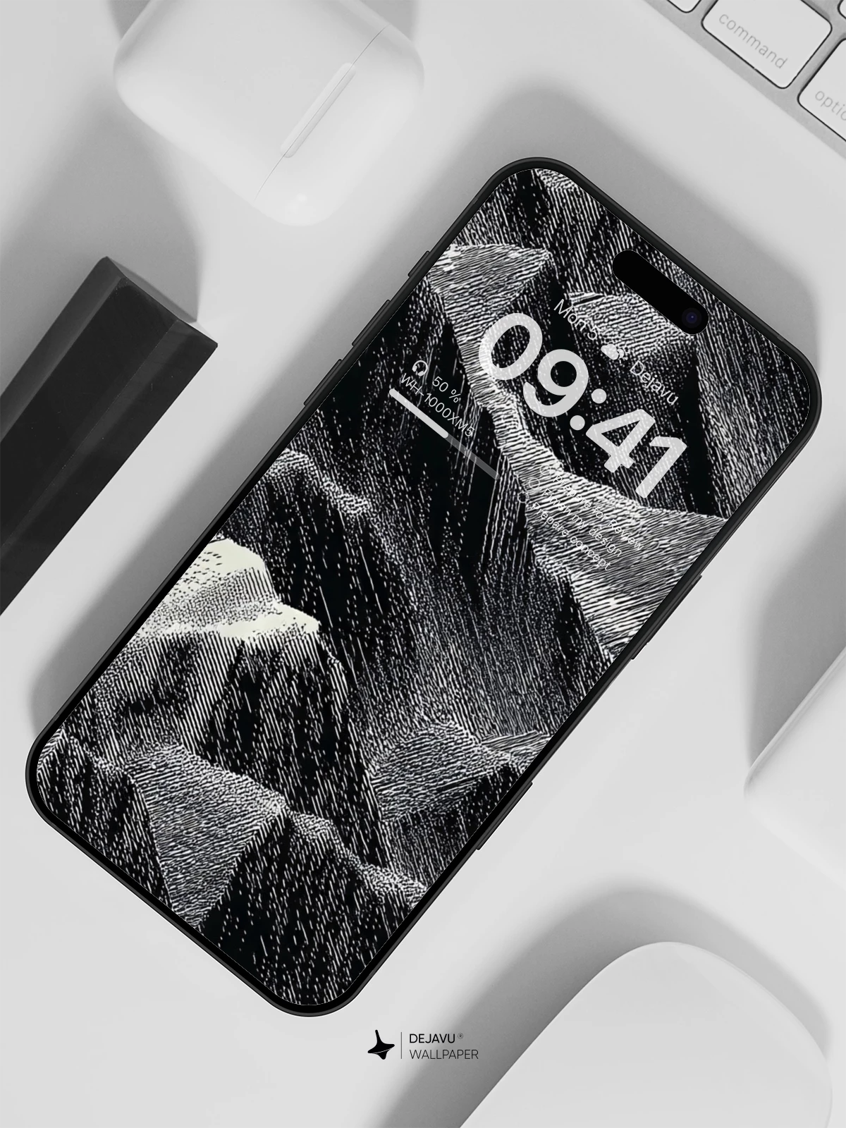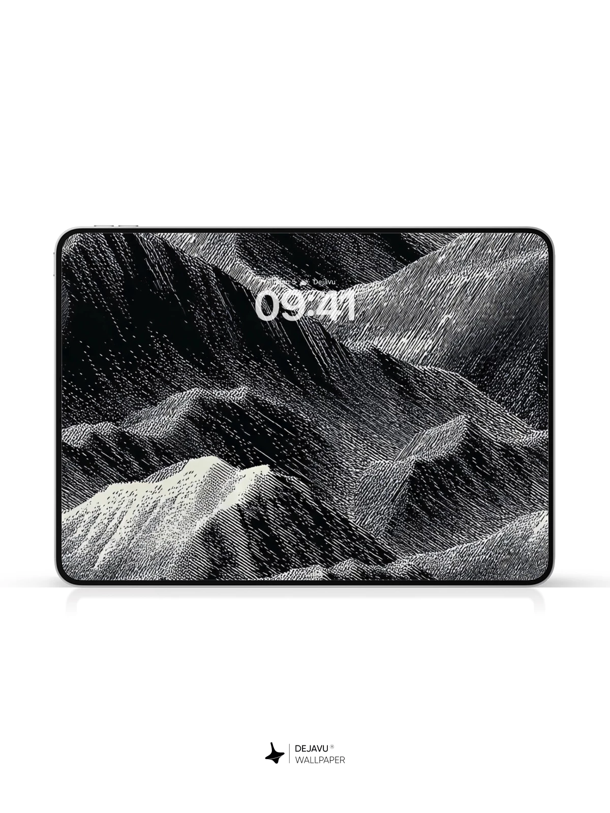 Dive into the captivating world of this monochrome mountain range wallpaper, meticulously crafted with fine lines and shading to evoke a sense of depth and grandeur. Perfect for enhancing the screen of your iPhone or Android device, this 8K wallpaper brings a timeless beauty to your fingertips.