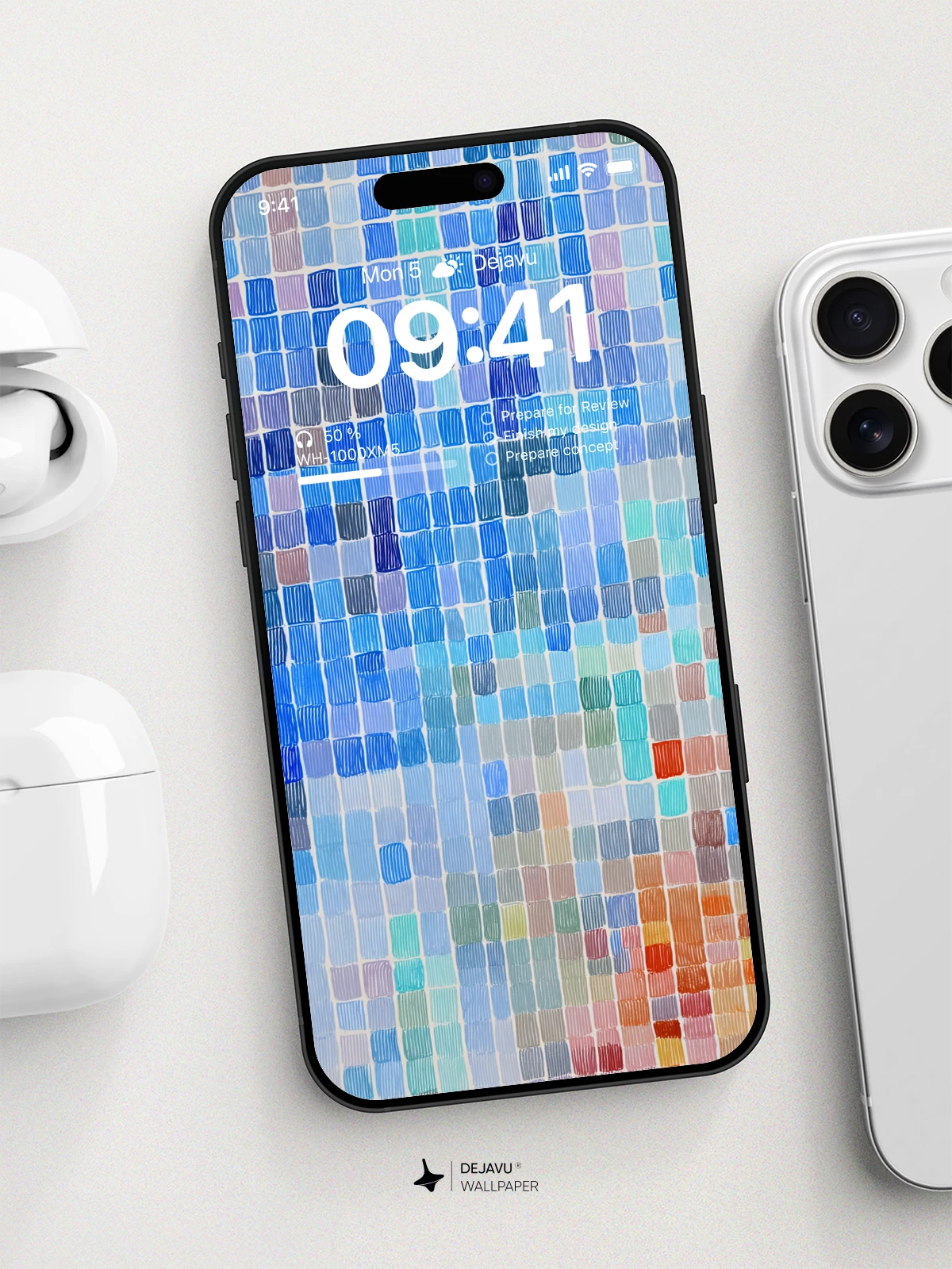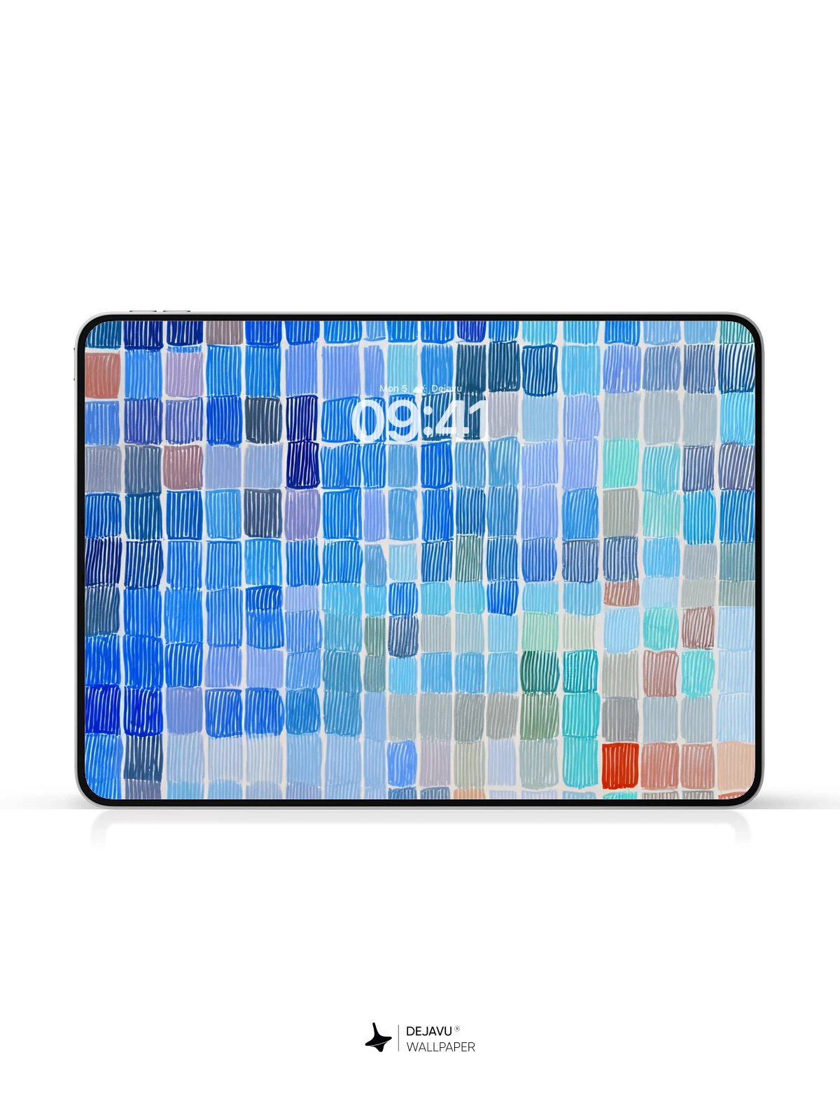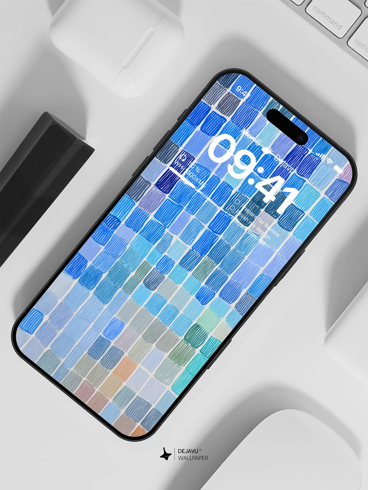 This mosaic grid wallpaper features a dynamic array of blues, from deep navy to bright azure, interspersed with subtle warm accents. Its geometric pattern creates a visually engaging texture, ideal for enhancing the aesthetic of your iPhone, Android, or tablet screen with a modern, artistic touch.