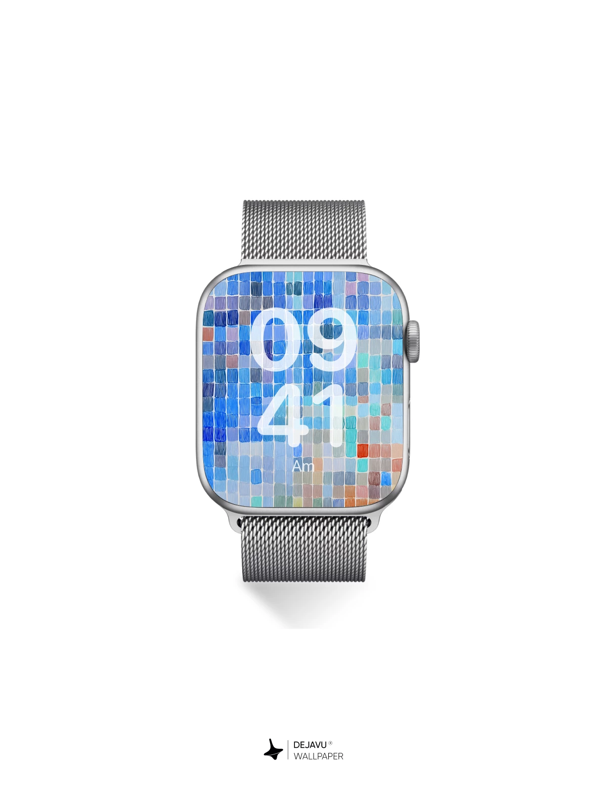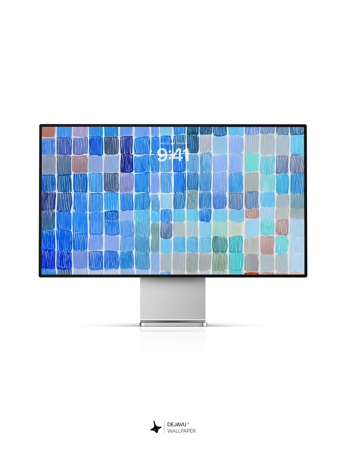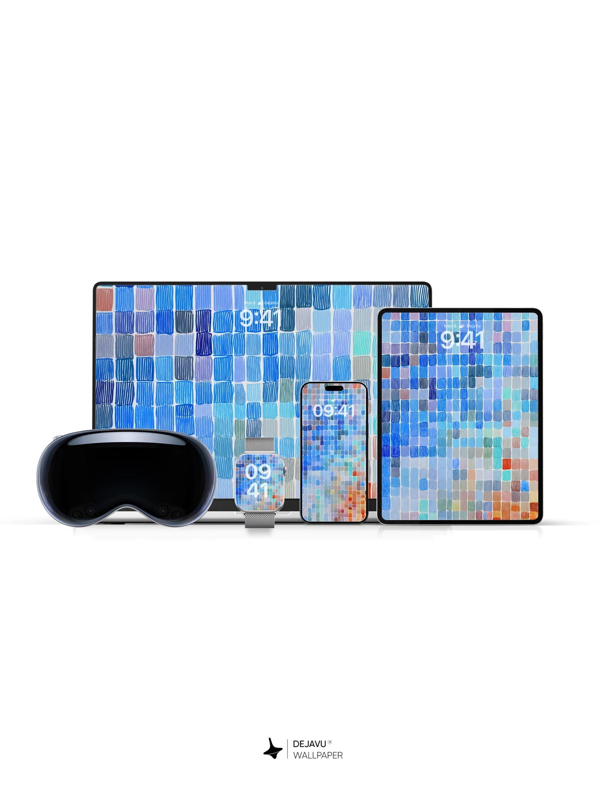 This mosaic grid wallpaper features a dynamic array of blues, from deep navy to bright azure, interspersed with subtle warm accents. Its geometric pattern creates a visually engaging texture, ideal for enhancing the aesthetic of your iPhone, Android, or tablet screen with a modern, artistic touch.