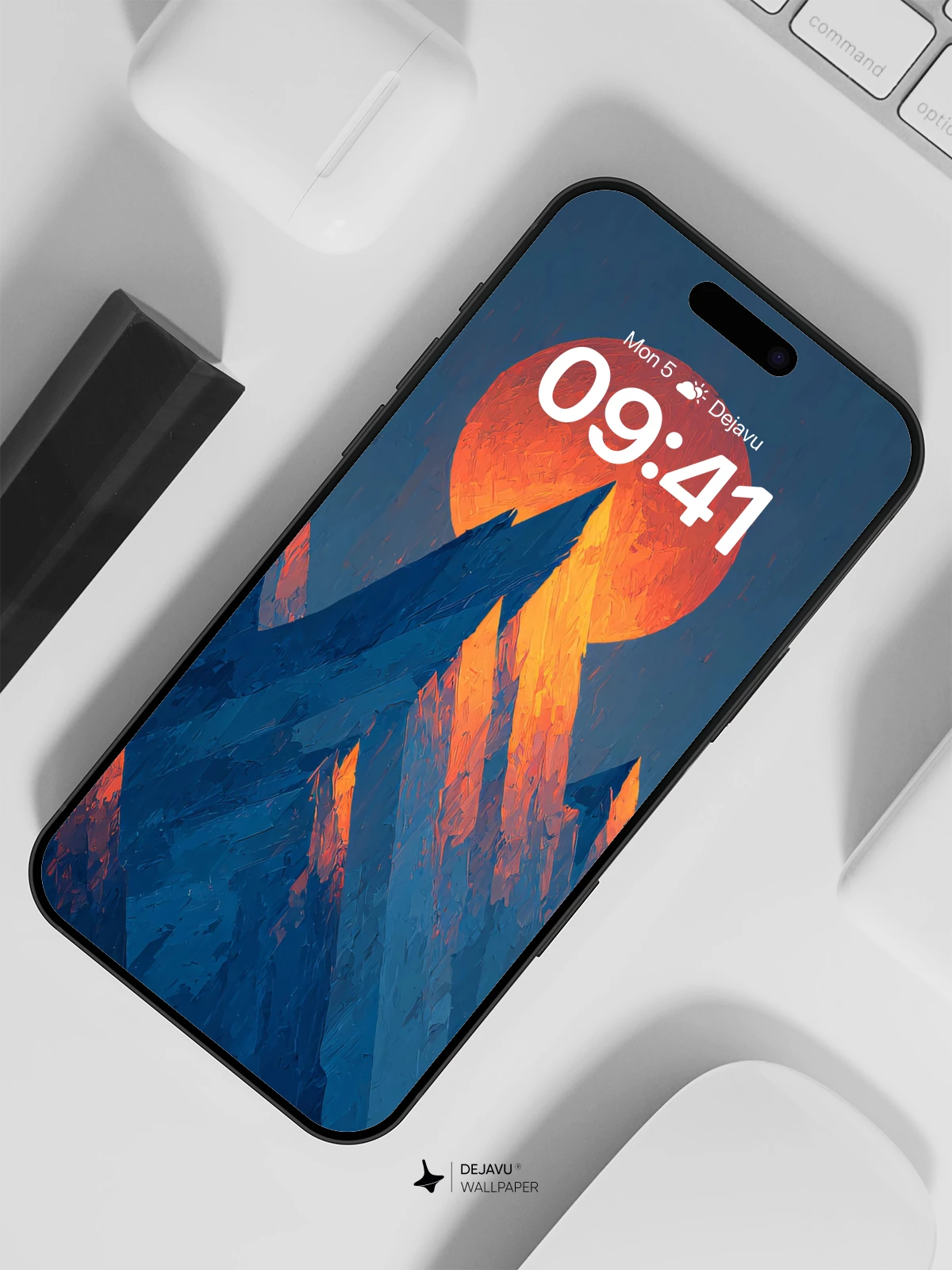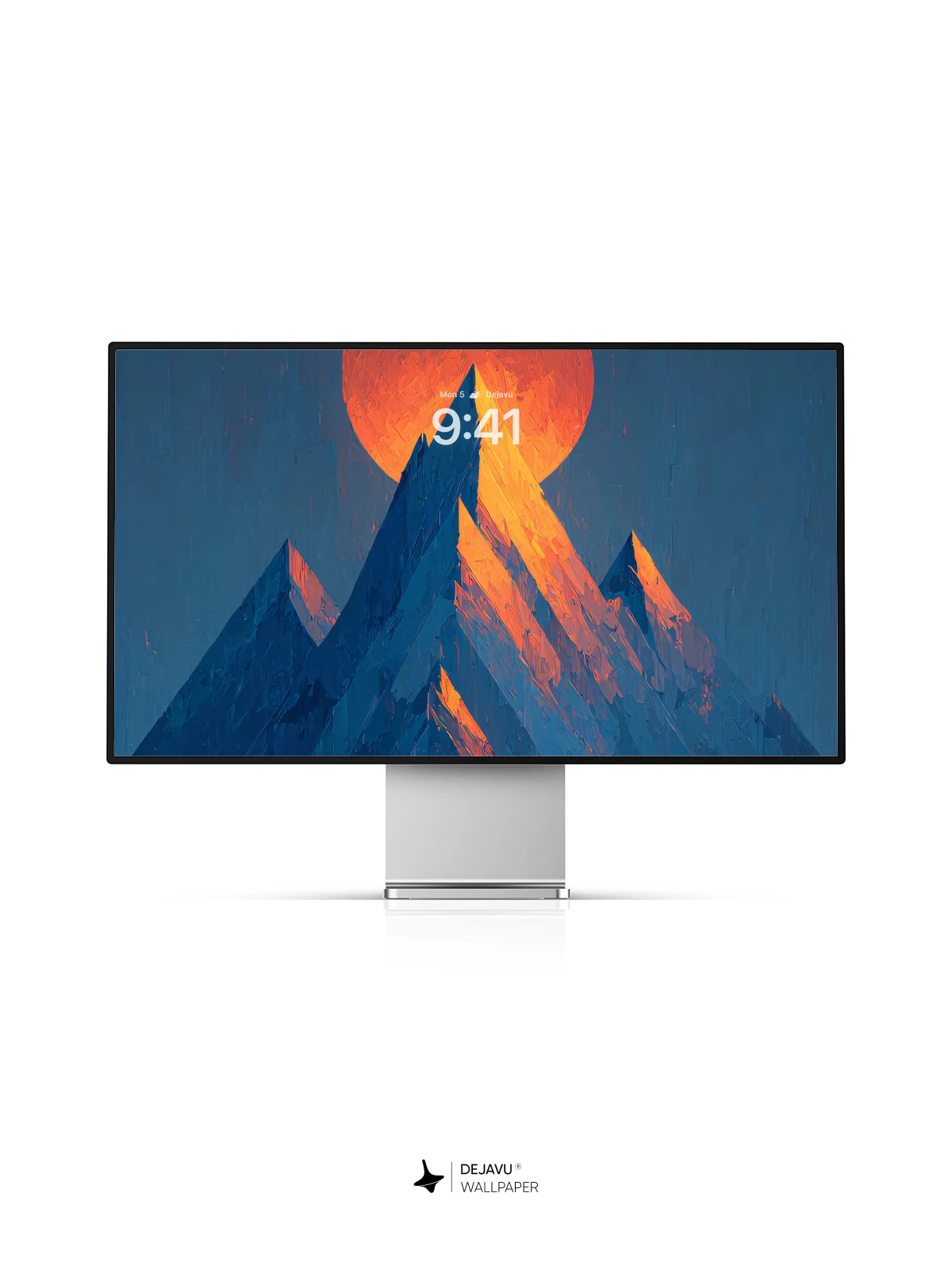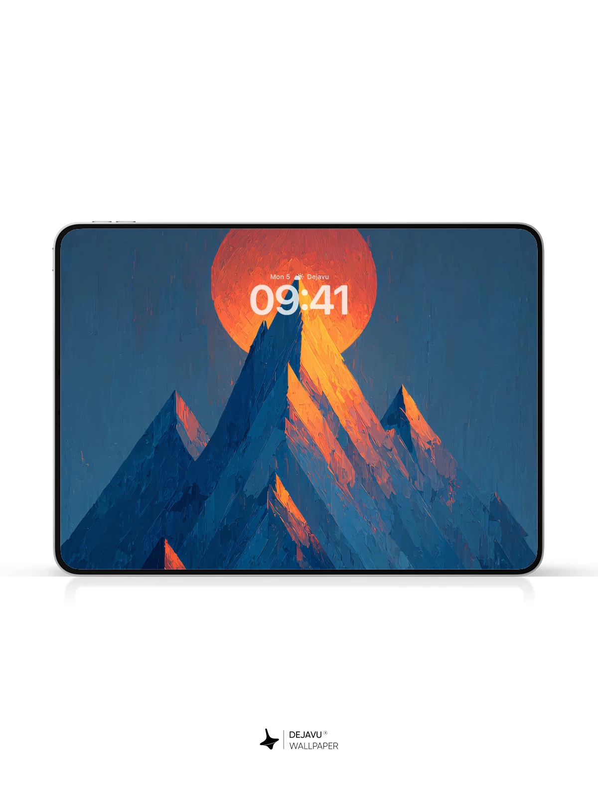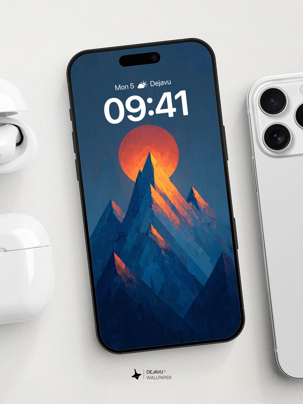 This high-resolution 8K wallpaper features a dramatic sunset behind sharp, angular mountains. The warm glow of the sun contrasts with cool blue tones, creating a striking visual for your iPhone, Android, or tablet screen.