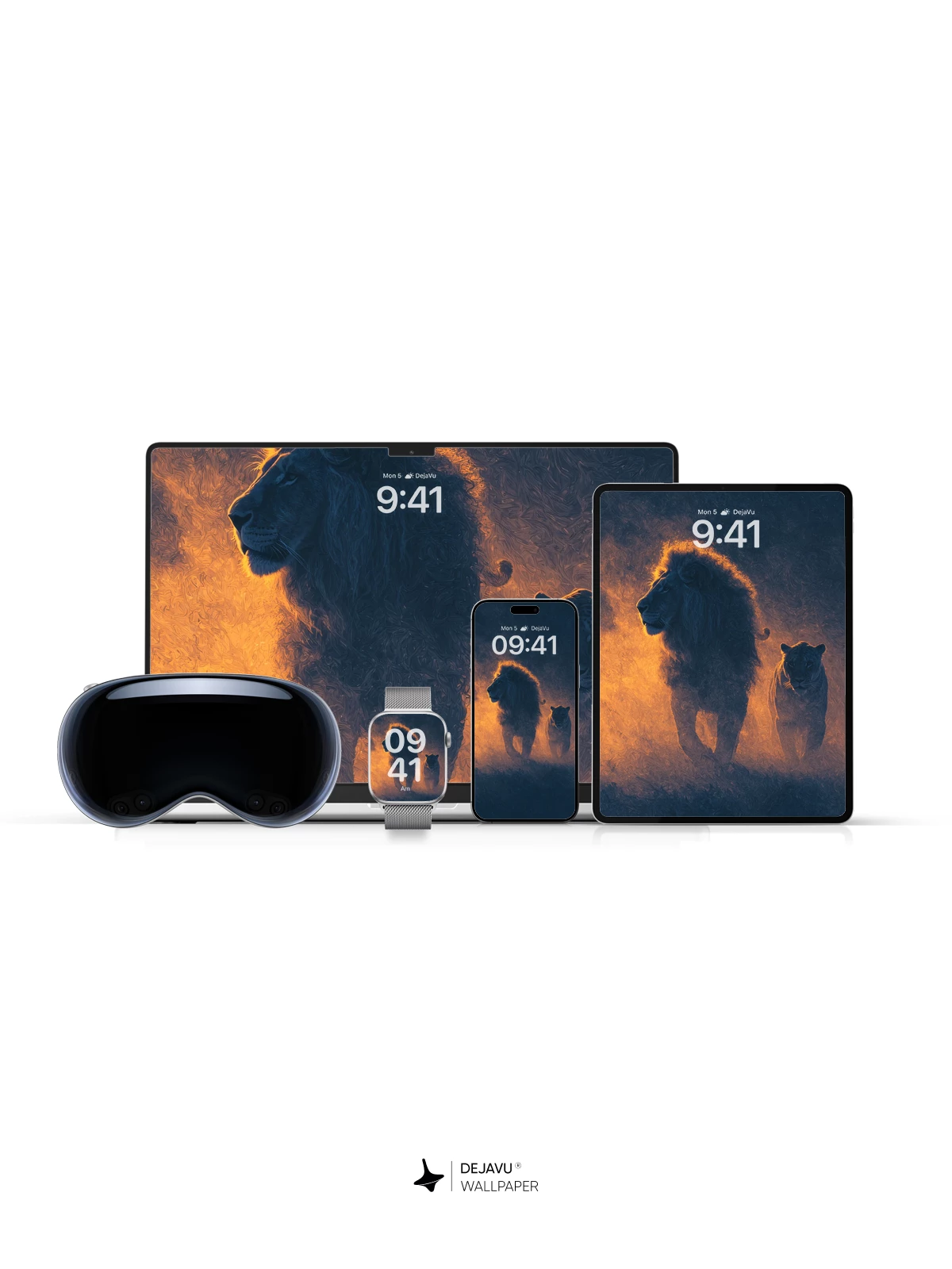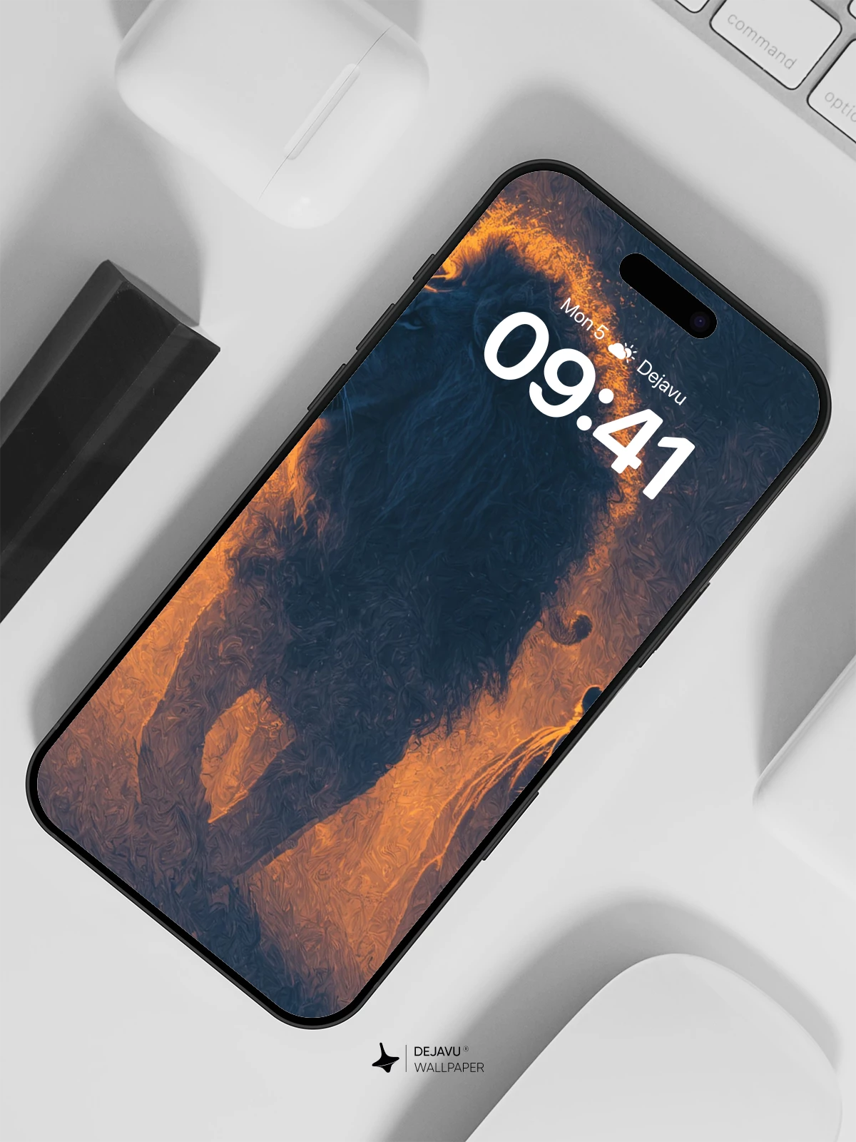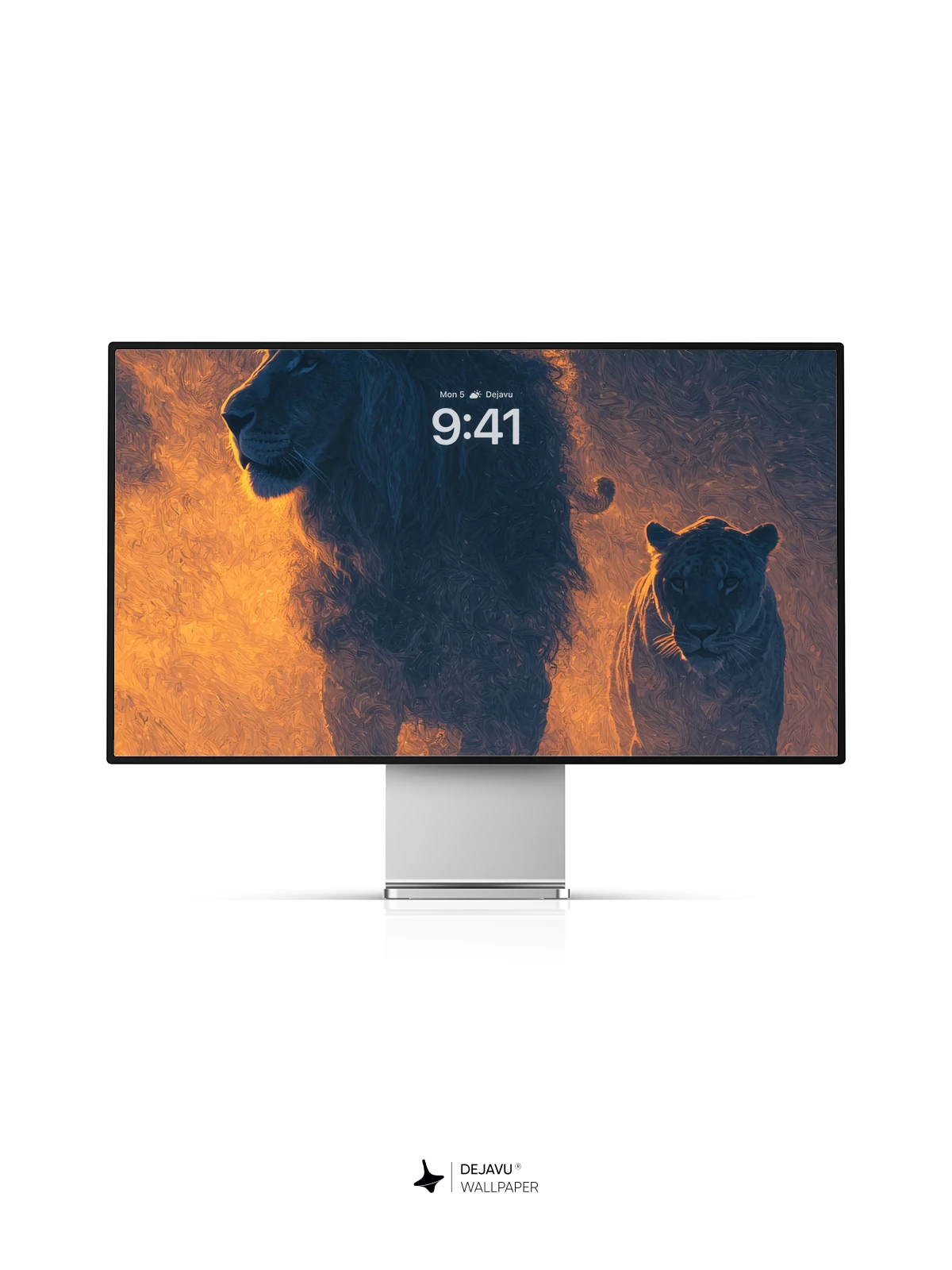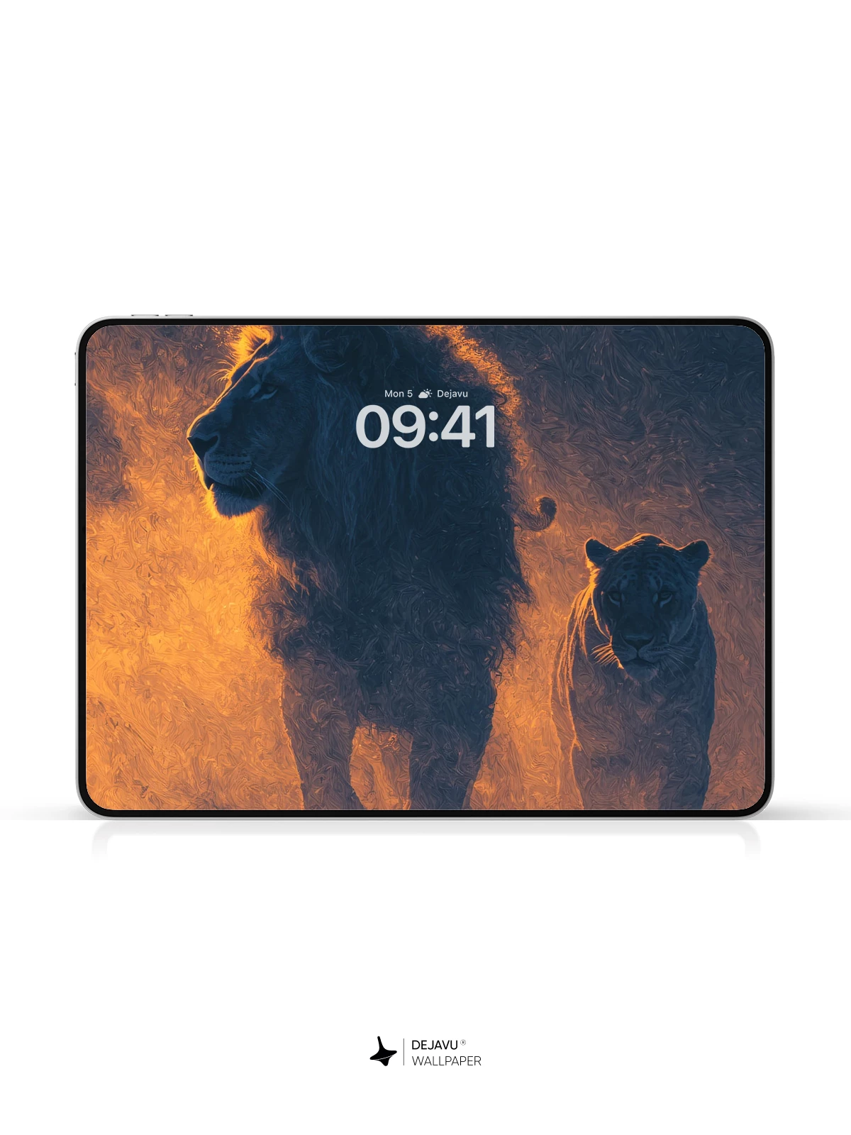Bathed in a haunting glow, a regal lion and a sleek panther stride forward through swirling amber mist, their silhouettes illuminated like spirits of the wild. This evocative 8K wallpaper captures raw nature’s elegance and quiet strength, ideal for iPhone, Android, or tablet screens. The atmospheric lighting and painterly texture evoke a sense of timeless mysticism, making it a stunning choice for those who appreciate bold, emotionally rich visuals.