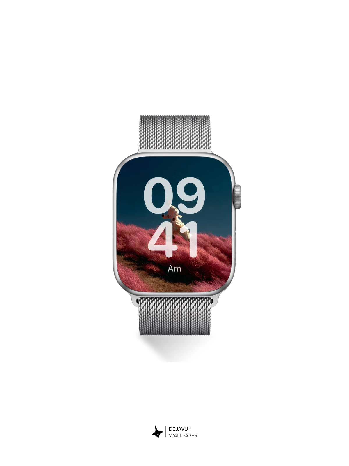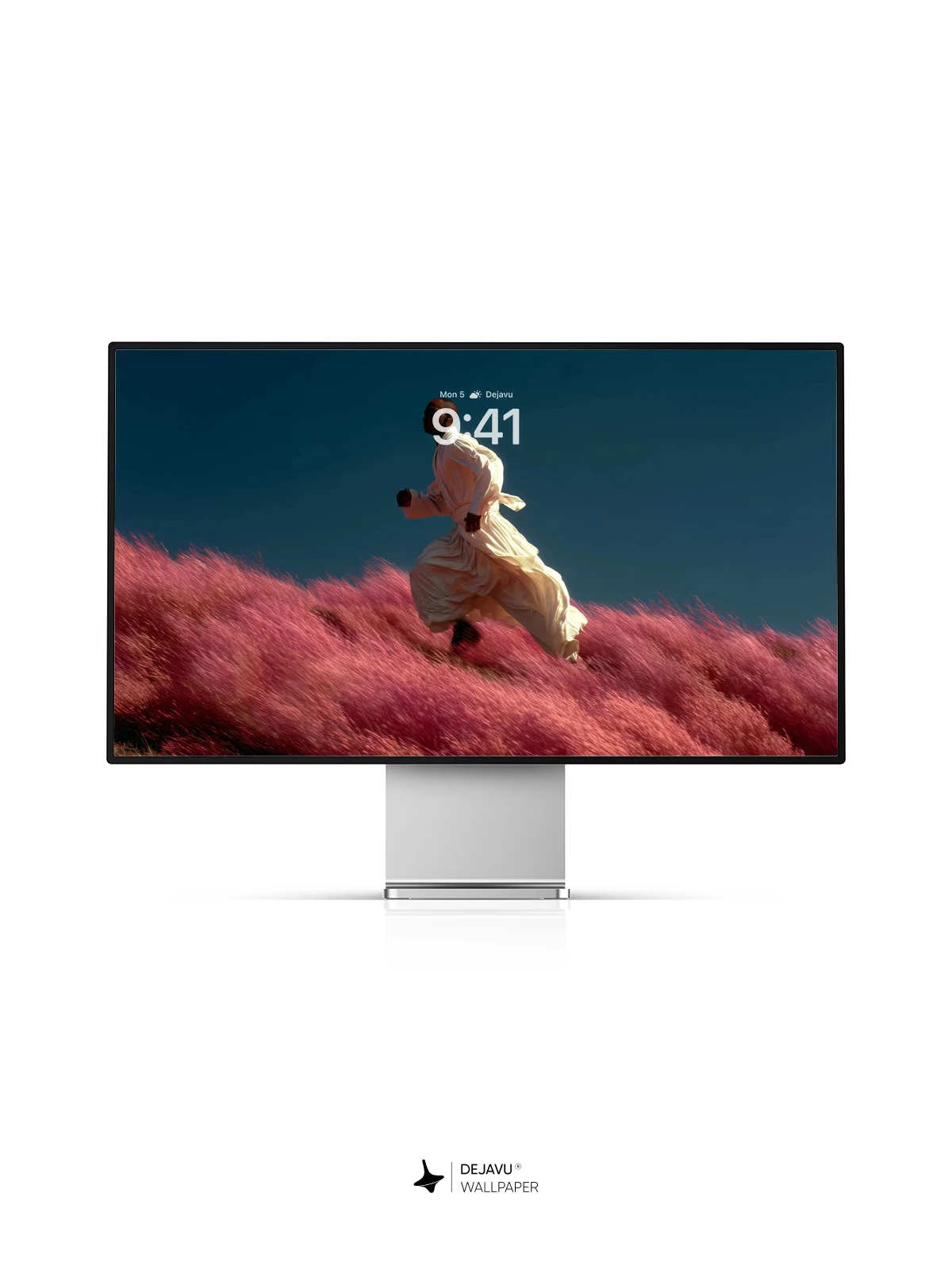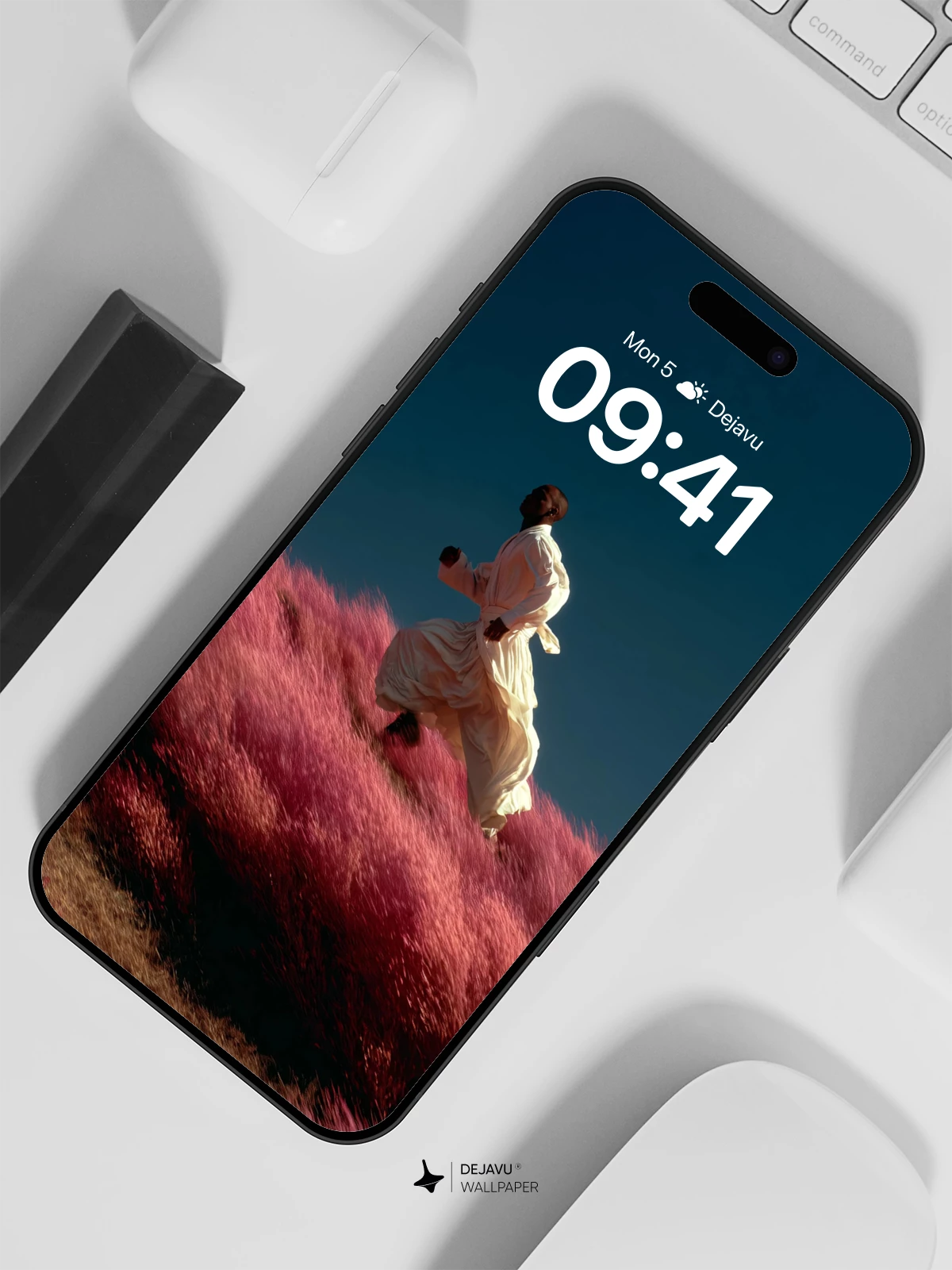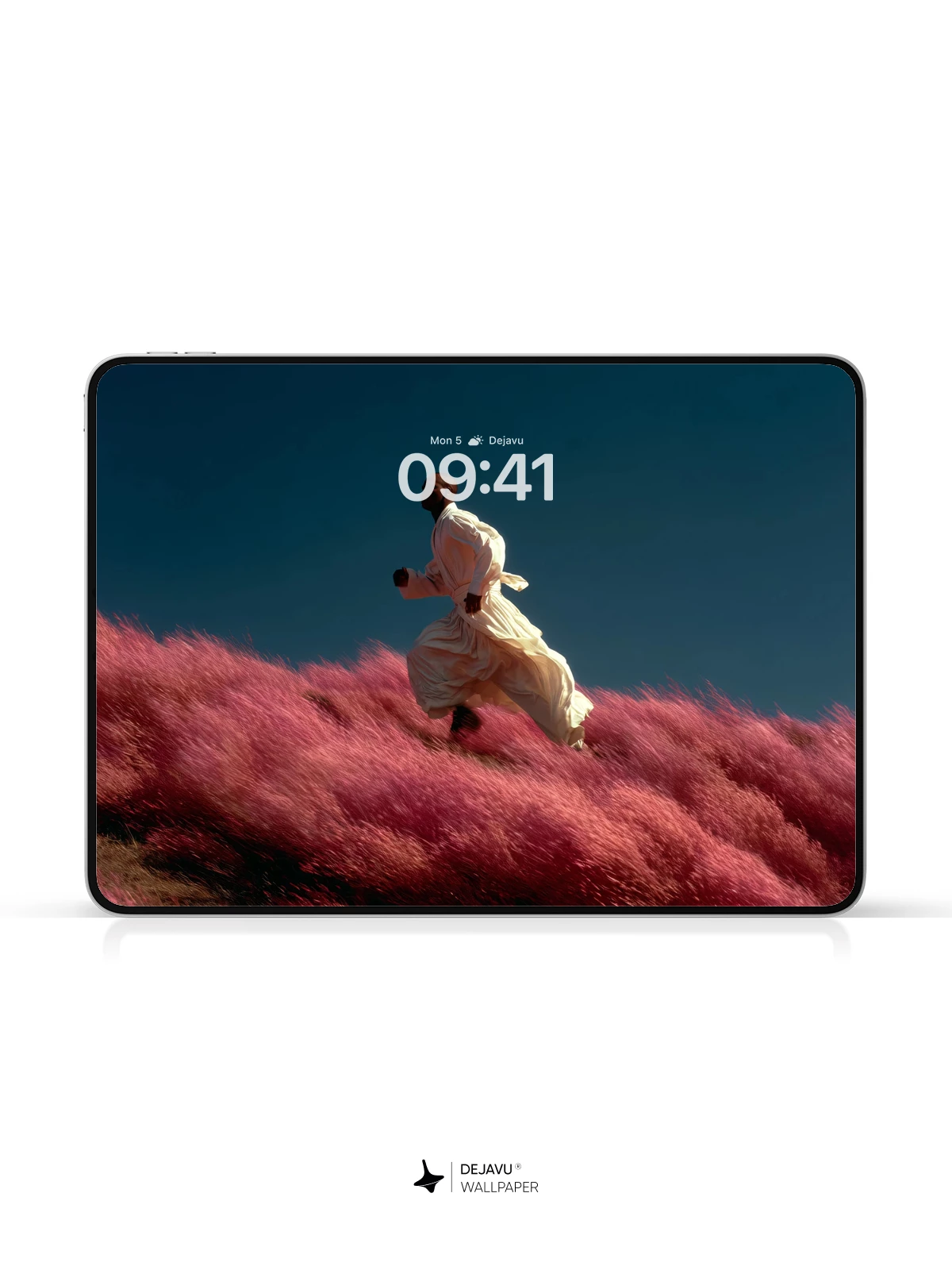 A lone runner glides through an otherworldly landscape of vivid pink grass, their white robe billowing in the wind against a vast, dark blue sky. The scene evokes a sense of spiritual journey and quiet freedom, blending natural wonder with surreal elegance. This stunning 8K wallpaper is ideal for iPhone, Android, and tablet devices, offering immersive visual depth and emotional resonance. Perfect for those who appreciate art that transcends reality.