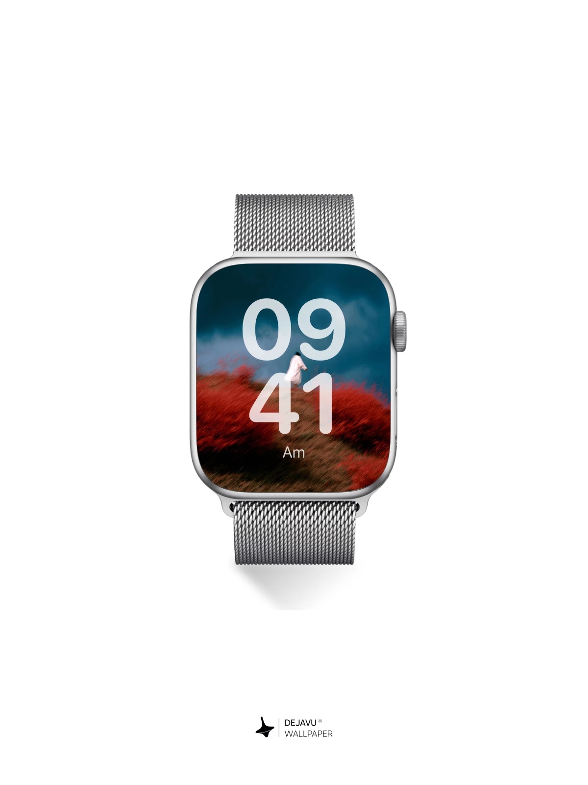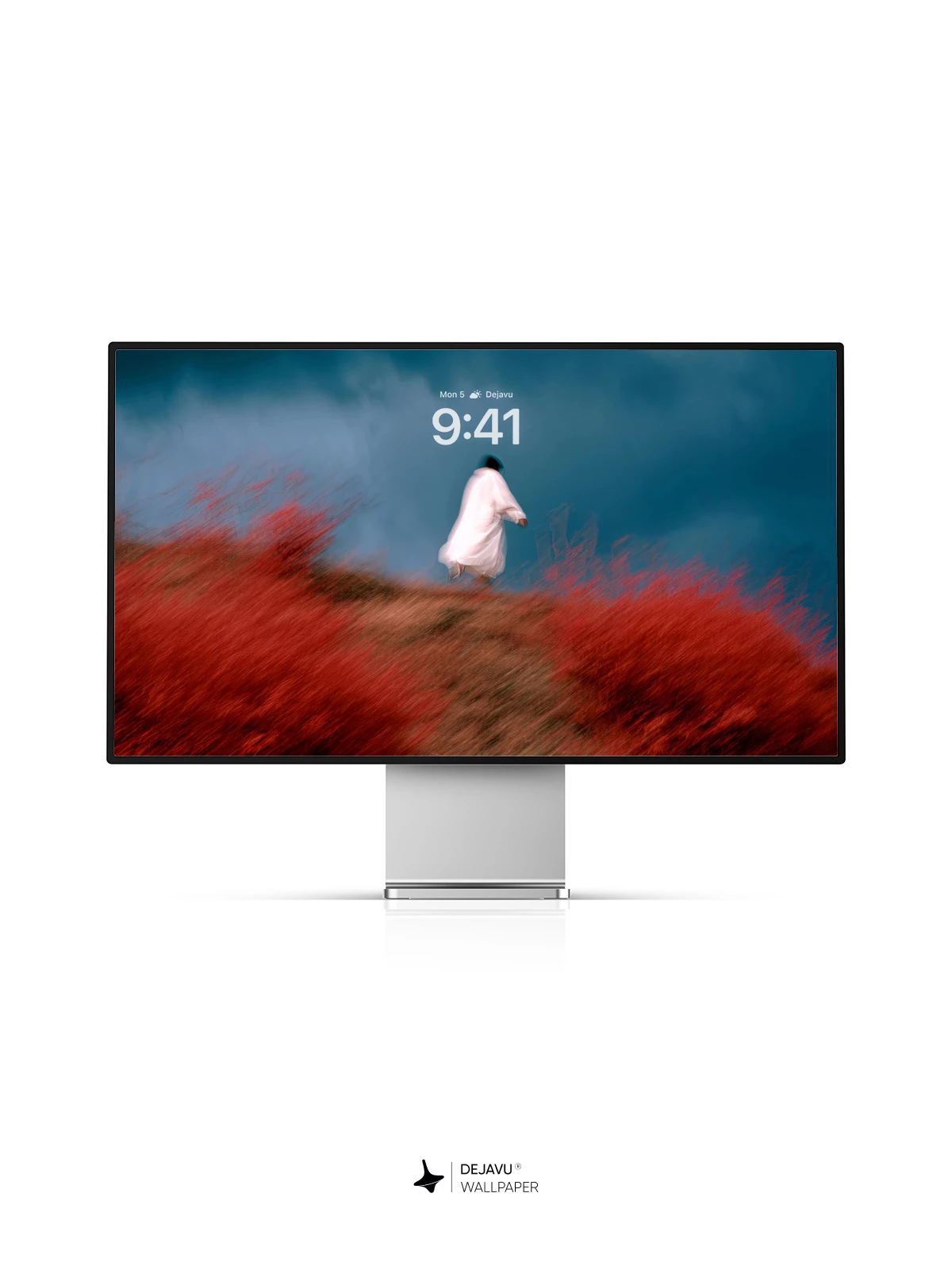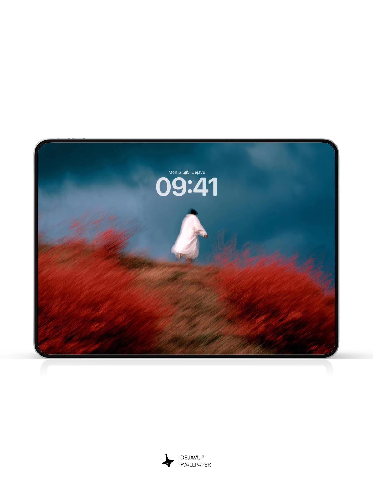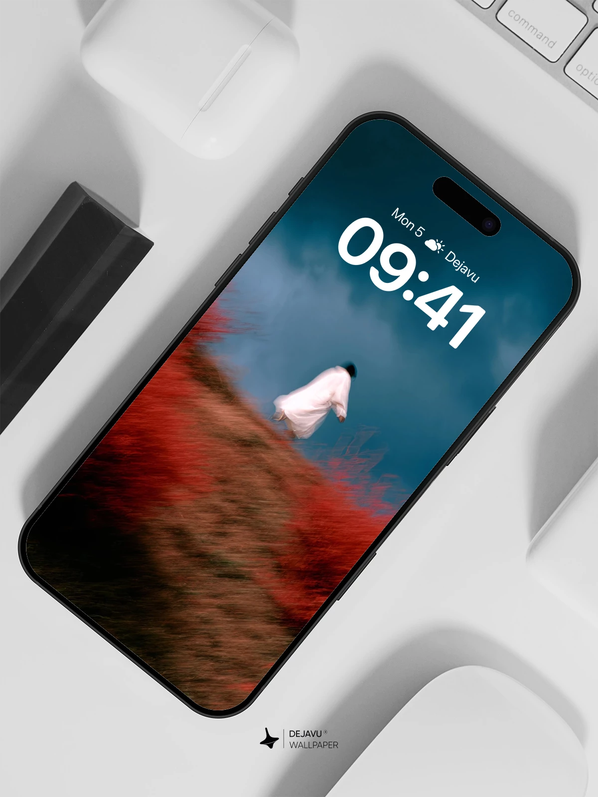 A solitary figure draped in white ascends a vivid red hillside beneath a brooding, deep-blue sky, creating a powerful sense of isolation and introspection. The striking contrast between the fiery terrain and the somber atmosphere lends a poetic, dreamlike quality to the scene. Inspired by cinematic landscapes and modern fine art photography, this 8K wallpaper captures the essence of quiet contemplation. Ideal for iPhone, Android, and tablet screens, it transforms your device into a portal of emotional depth and visual grandeur.