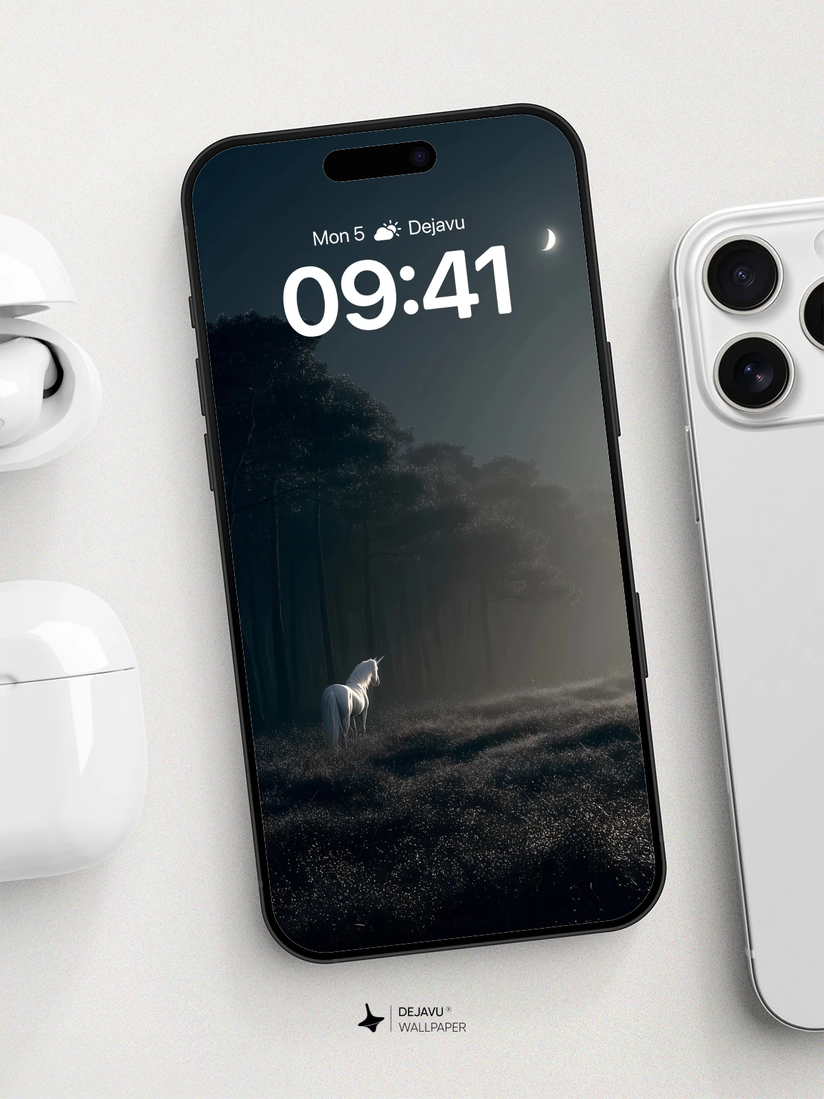 In this dreamlike 8K wallpaper, a majestic white unicorn glides through a misty forest at night, illuminated by the soft light of a crescent moon. The scene blends fantasy and mysticism, evoking a sense of quiet wonder and timeless enchantment. Ideal for iPhone, Android, and tablet screens, this high-resolution artwork transforms your device into a portal to a magical realm. Perfect for fans of mythical creatures and serene nocturnal landscapes.